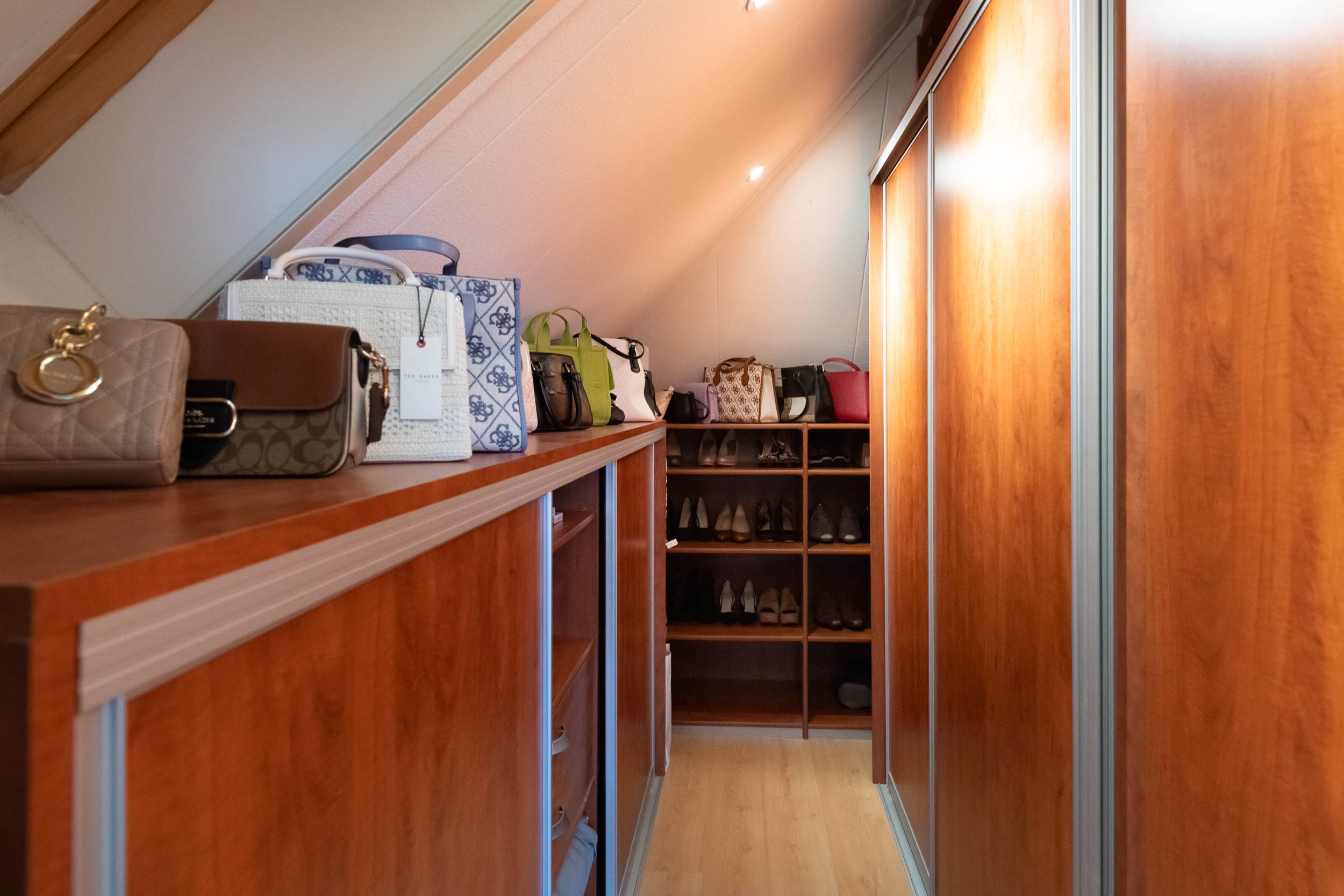 Second floor: The multifunctional attic space, currently serving as a playroom, leads to one bedroom. Both rooms have a dormer window. The bedroom provides access to a storage room.