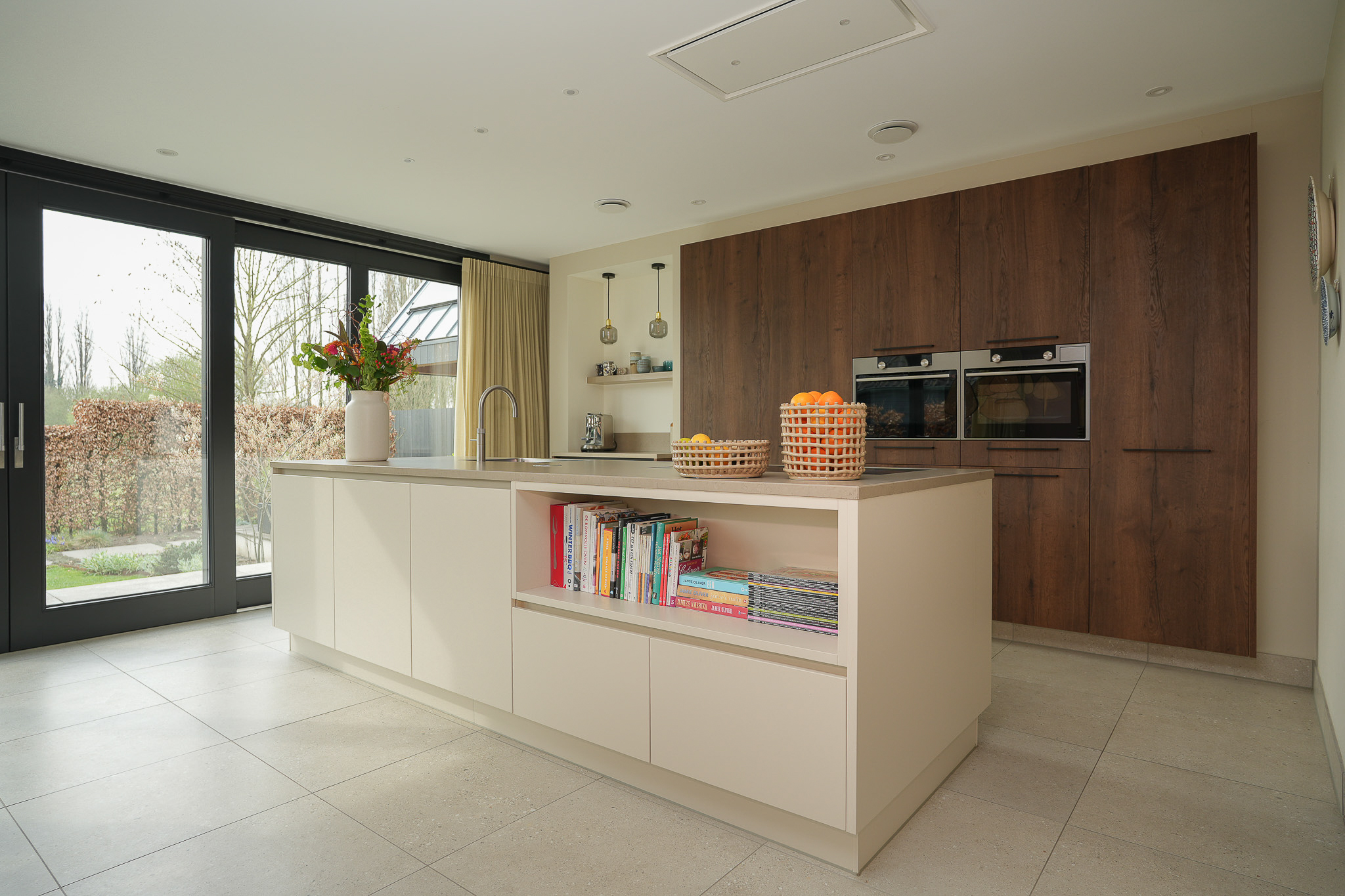 The kitchen features a central island with a composite worktop and a wall unit in a warm oak-look finish.