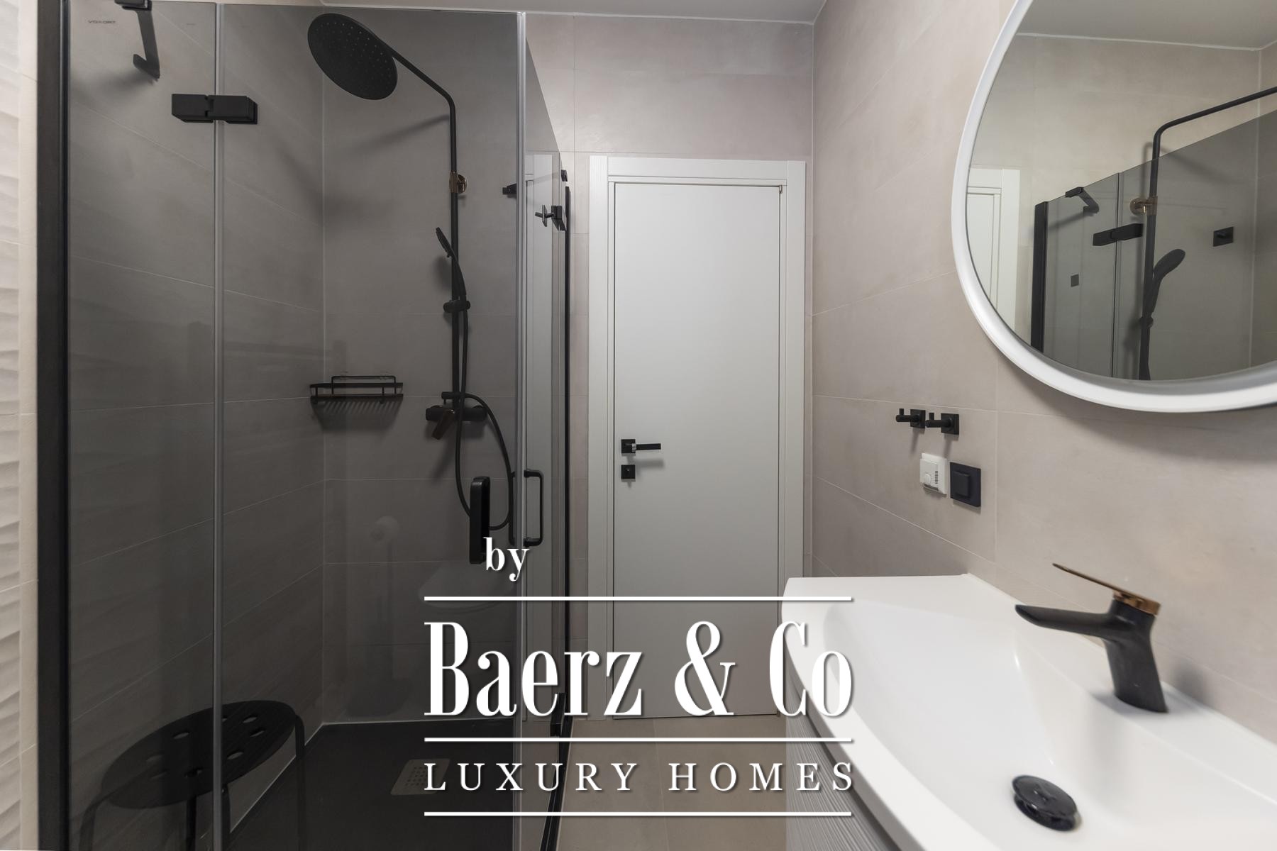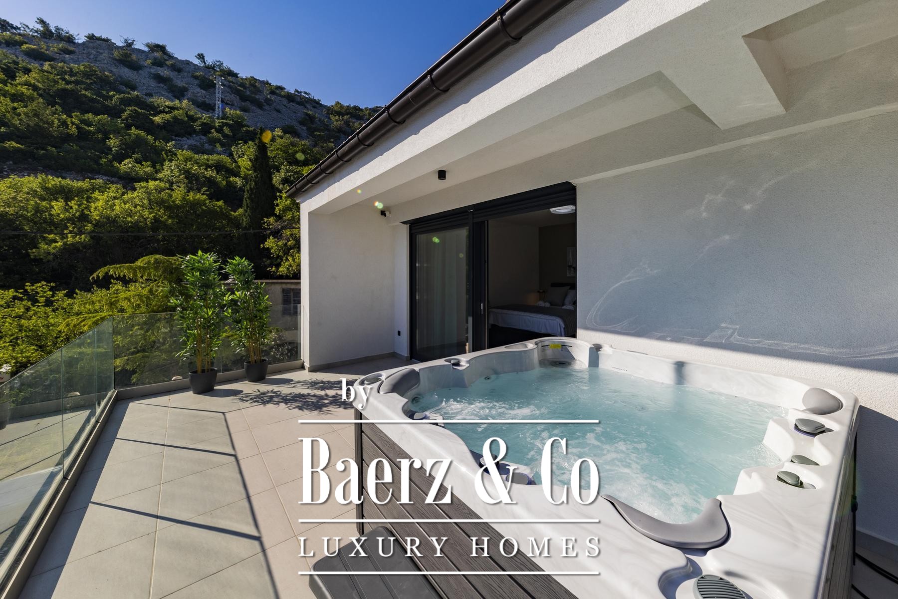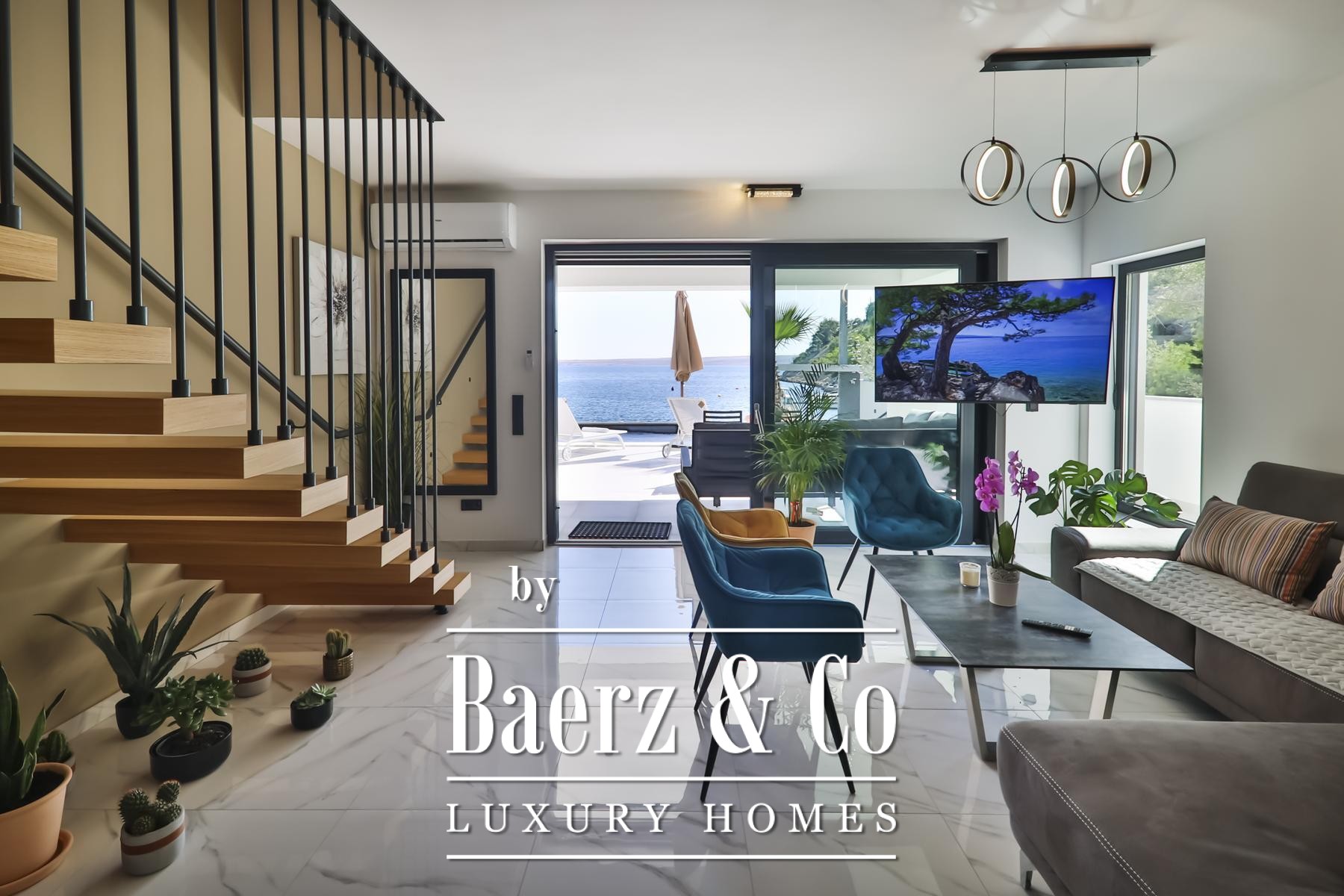 Expansive glass, triple-layered and well insulated, draws in light and frames the Adriatic, while underfloor heating and a fireplace ensure year-round warmth and calm. The main living space, elegantly proportioned, flows into a modern kitchen curated for both ease and sophistication. Outdoor areas invite languid afternoons beside the 32 m² seawater pool, in the jacuzzi, sauna, or at the private gym, with direct access to the sea and a pier that includes a boat slipway system for yacht owners.