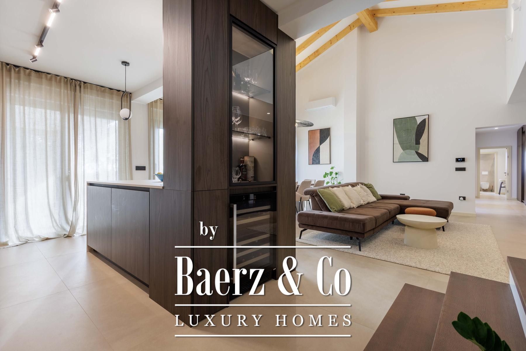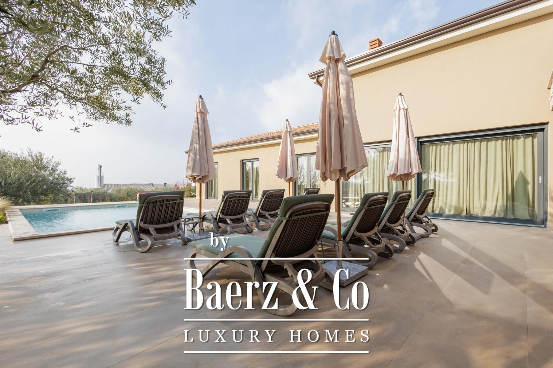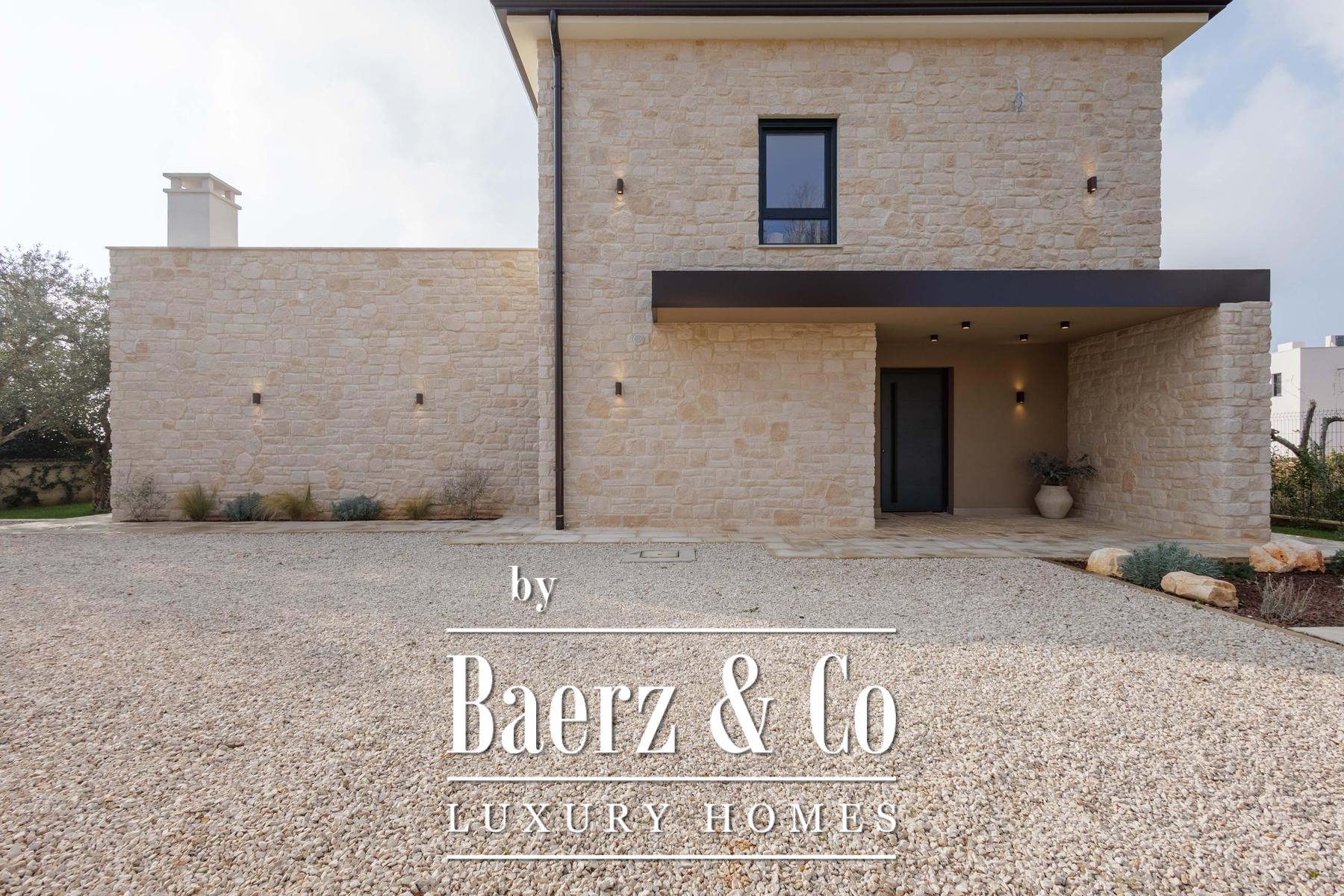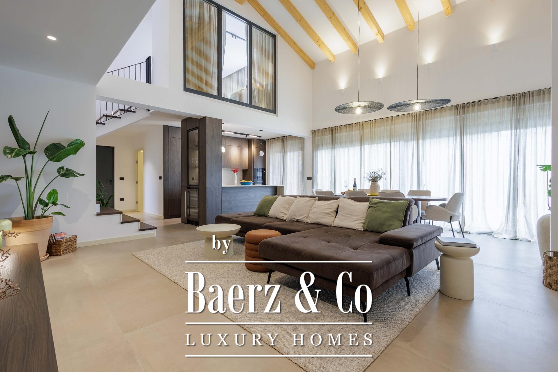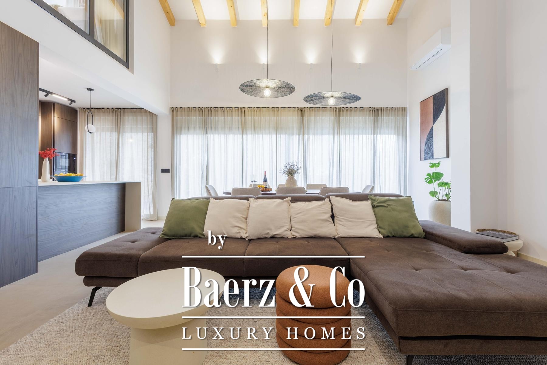This high-standard, low-energy villa is equipped with underfloor heating powered by a heat pump and seamless air conditioning throughout. Practical design extends to the exterior, where underfloor heating continues into the summer kitchen. The layout includes two separate guest toilets for added convenience. The 1,000 m² plot offers cultivated privacy, with a lush lawn, six olive trees, and an automated irrigation system easing maintenance.