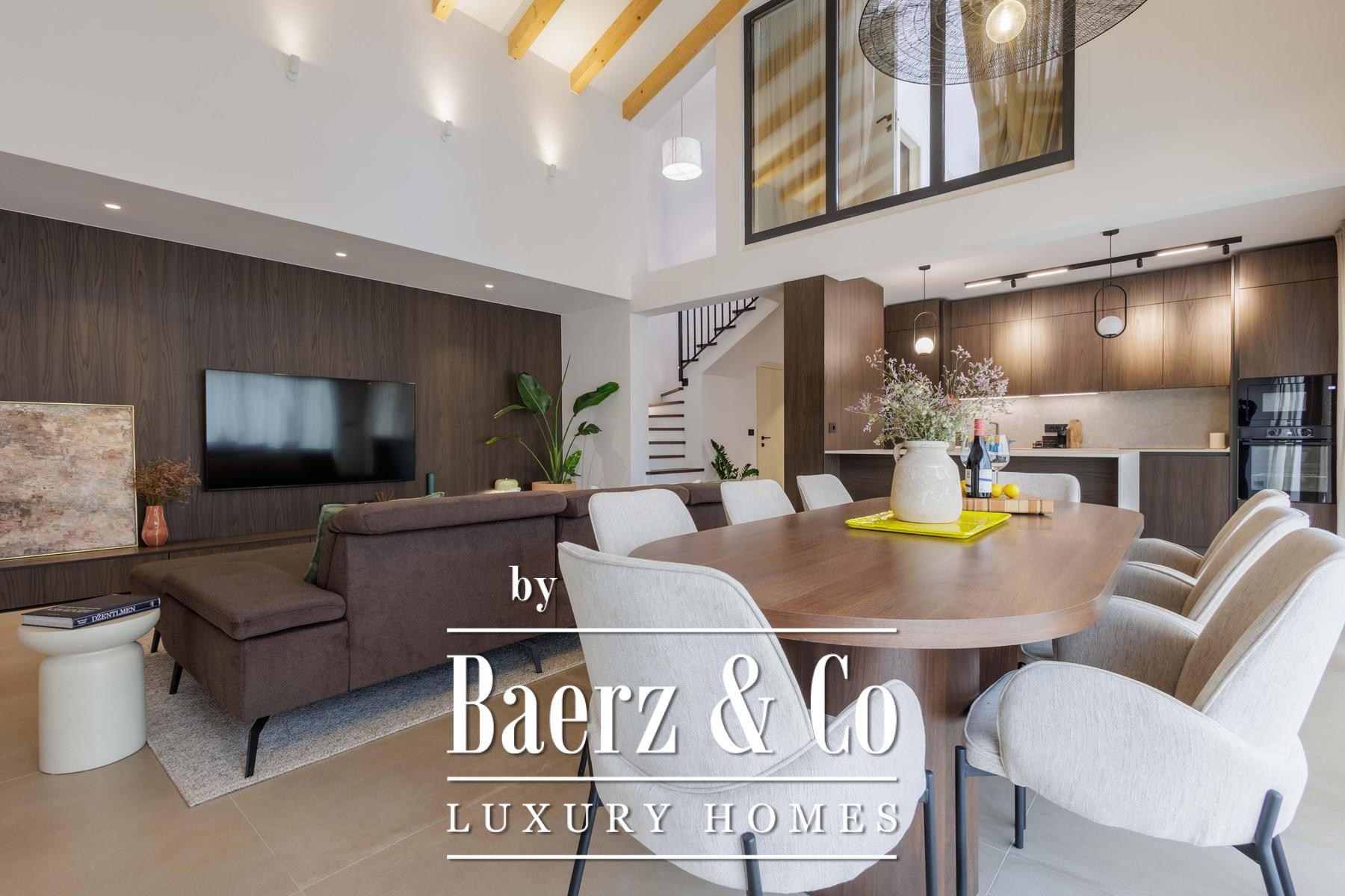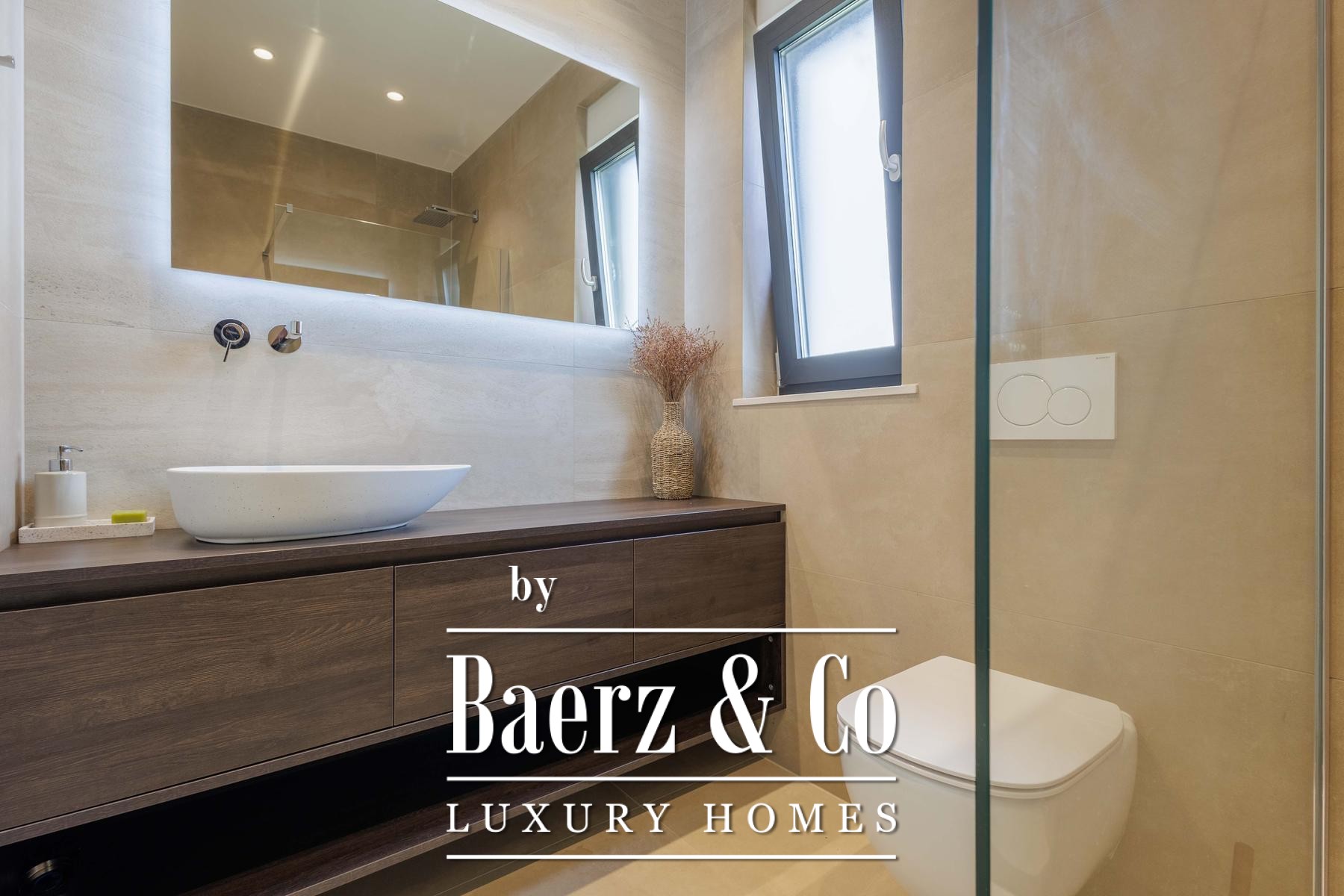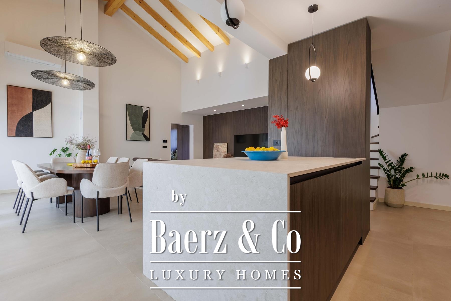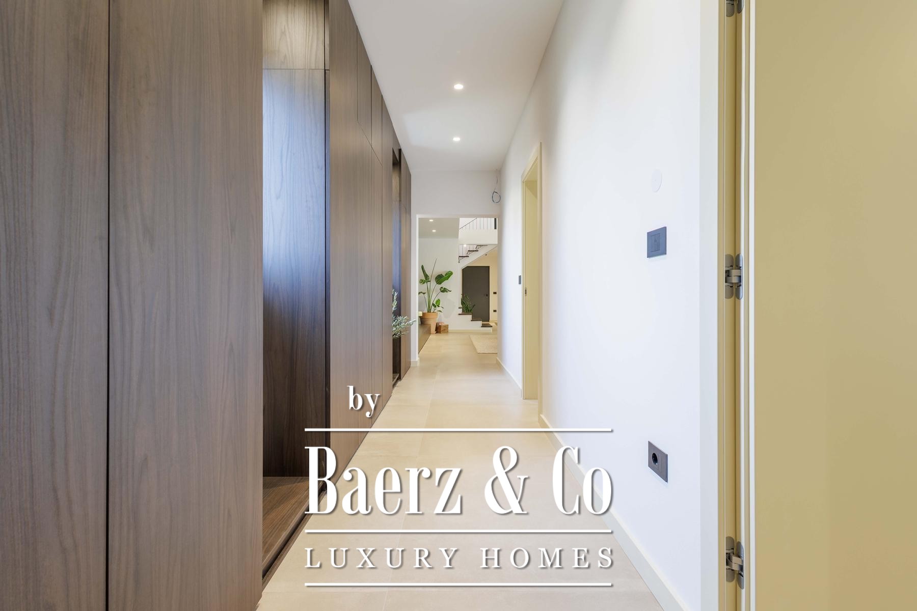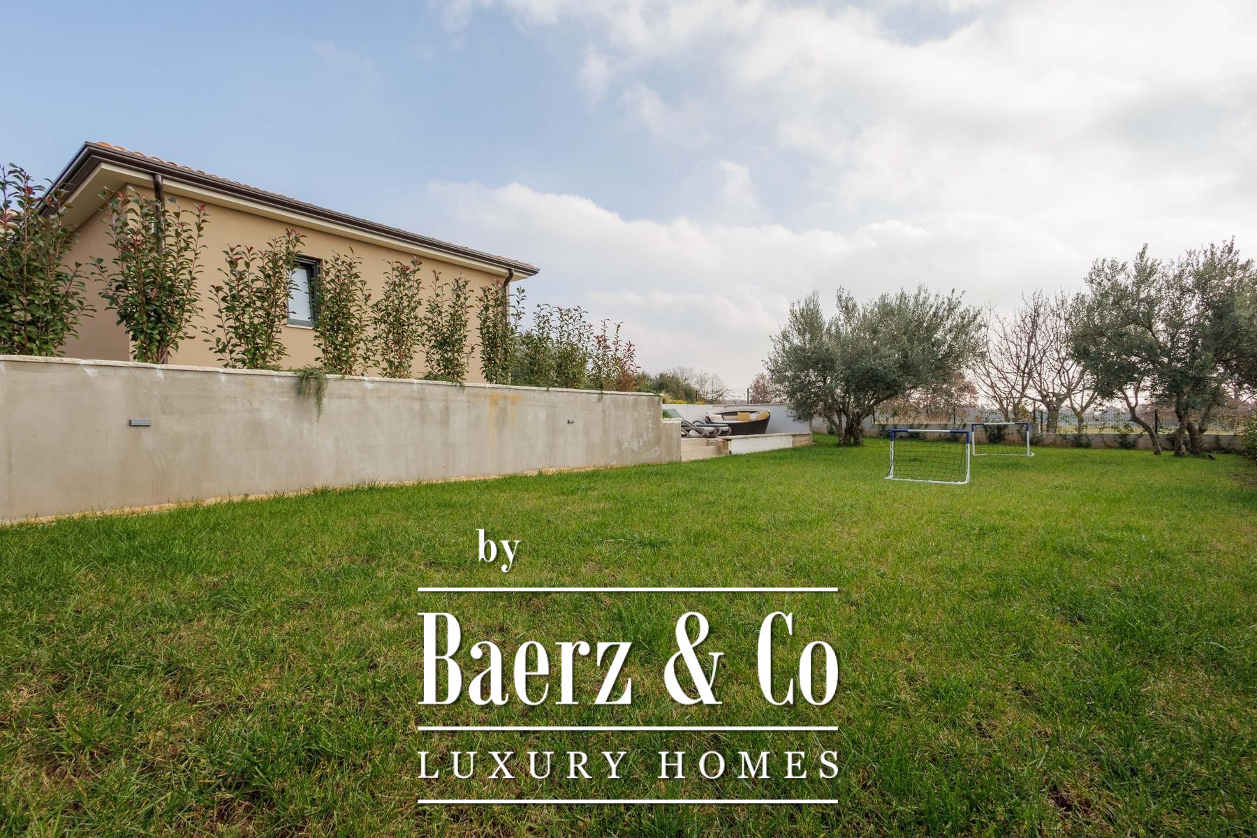 This high-standard, low-energy villa is equipped with underfloor heating powered by a heat pump and seamless air conditioning throughout. Practical design extends to the exterior, where underfloor heating continues into the summer kitchen. The layout includes two separate guest toilets for added convenience. The 1,000 m² plot offers cultivated privacy, with a lush lawn, six olive trees, and an automated irrigation system easing maintenance.