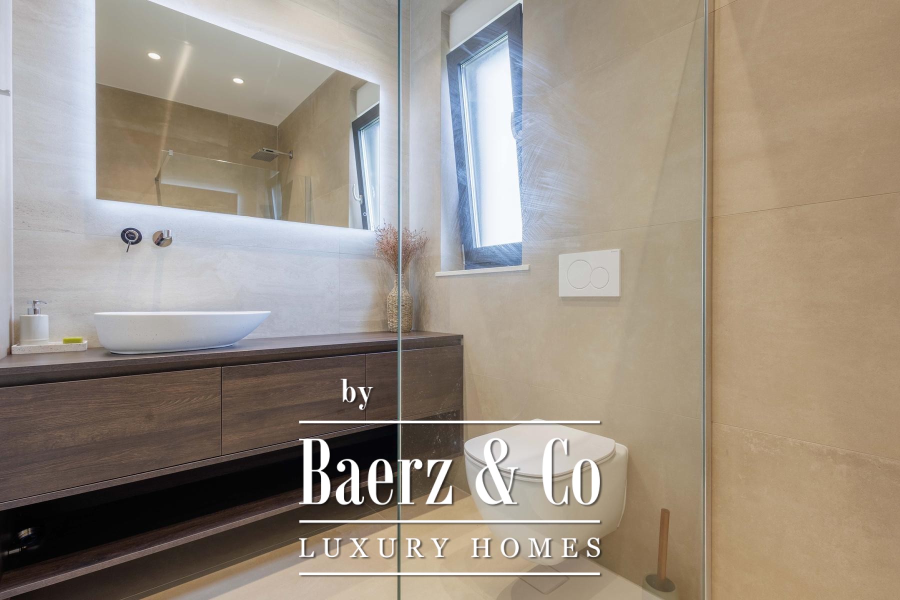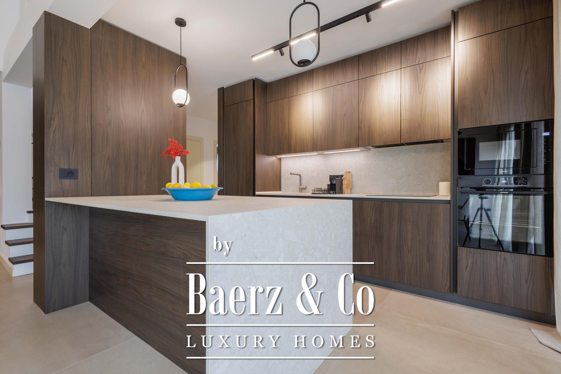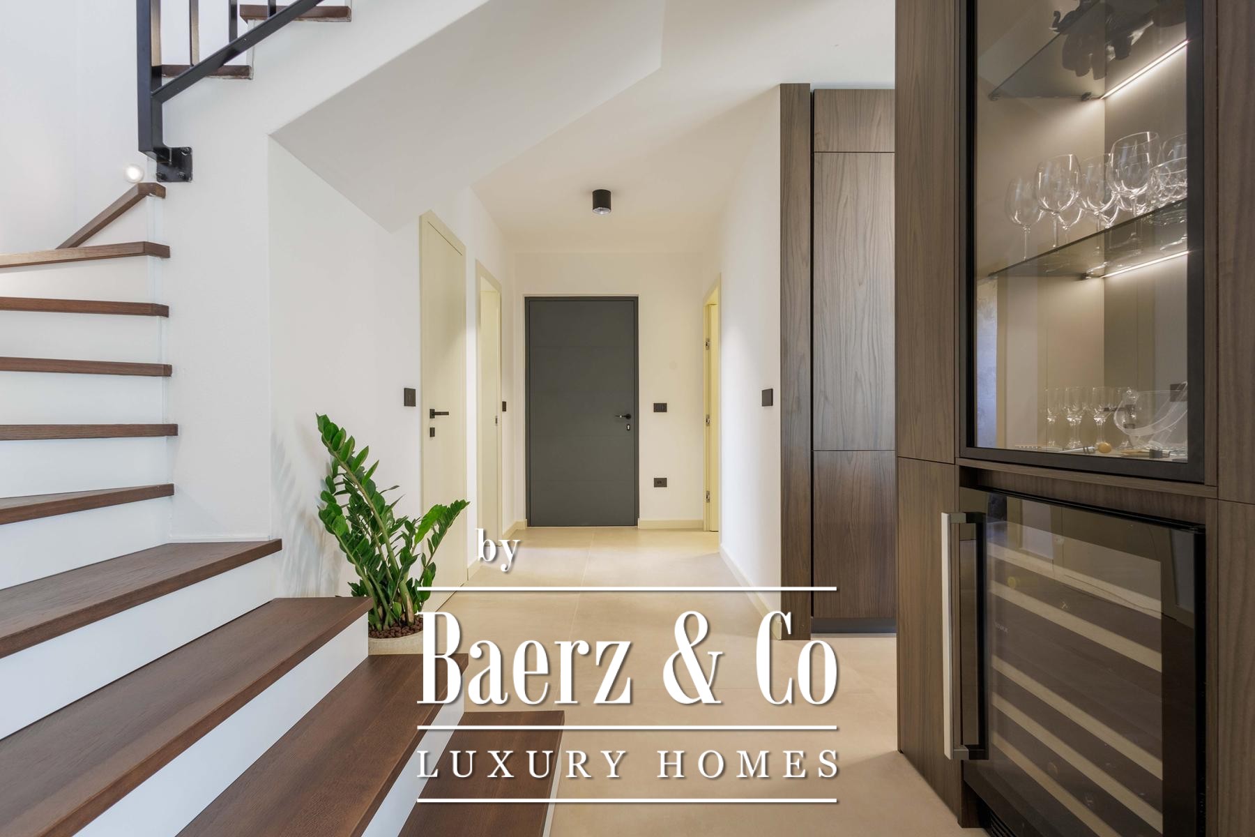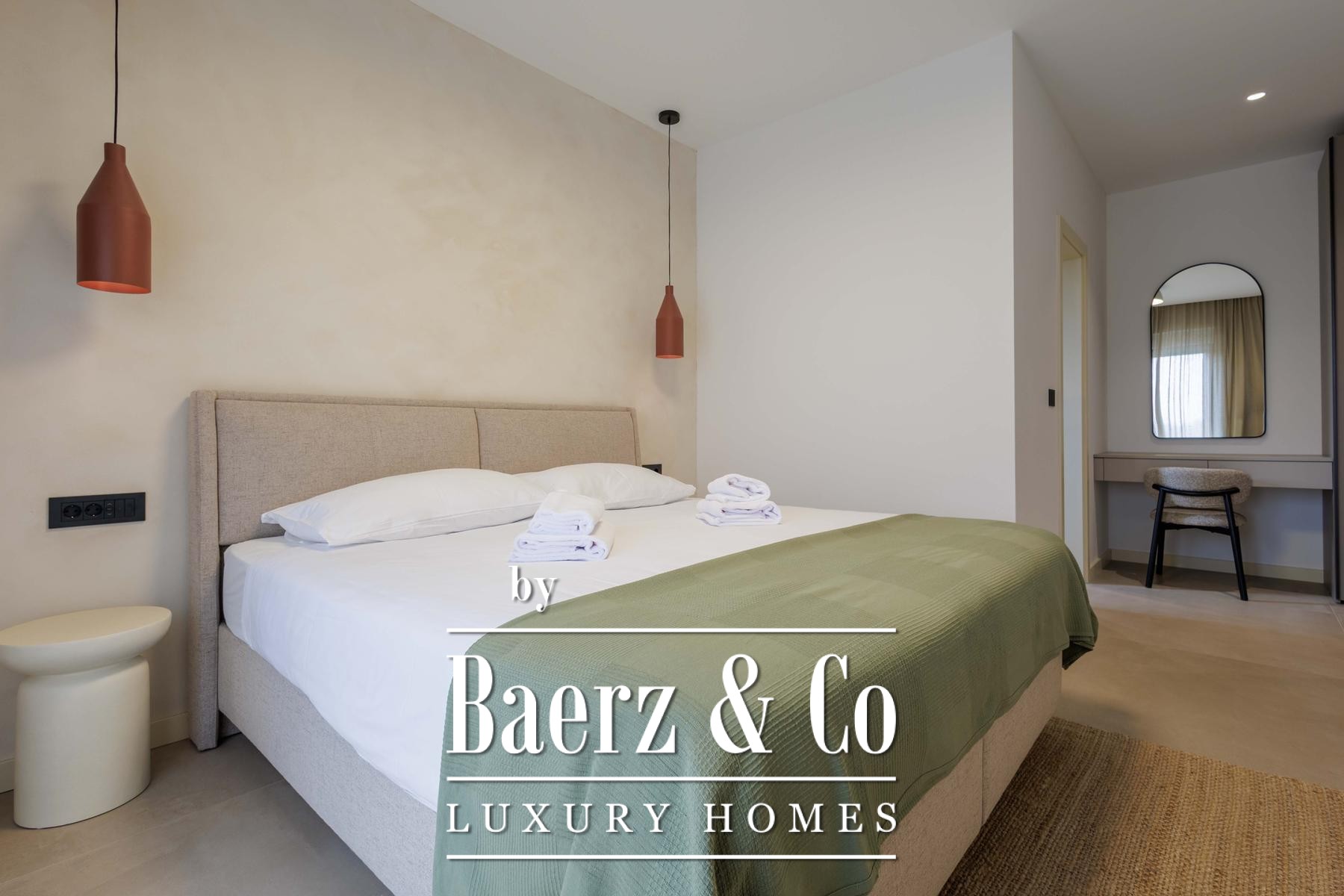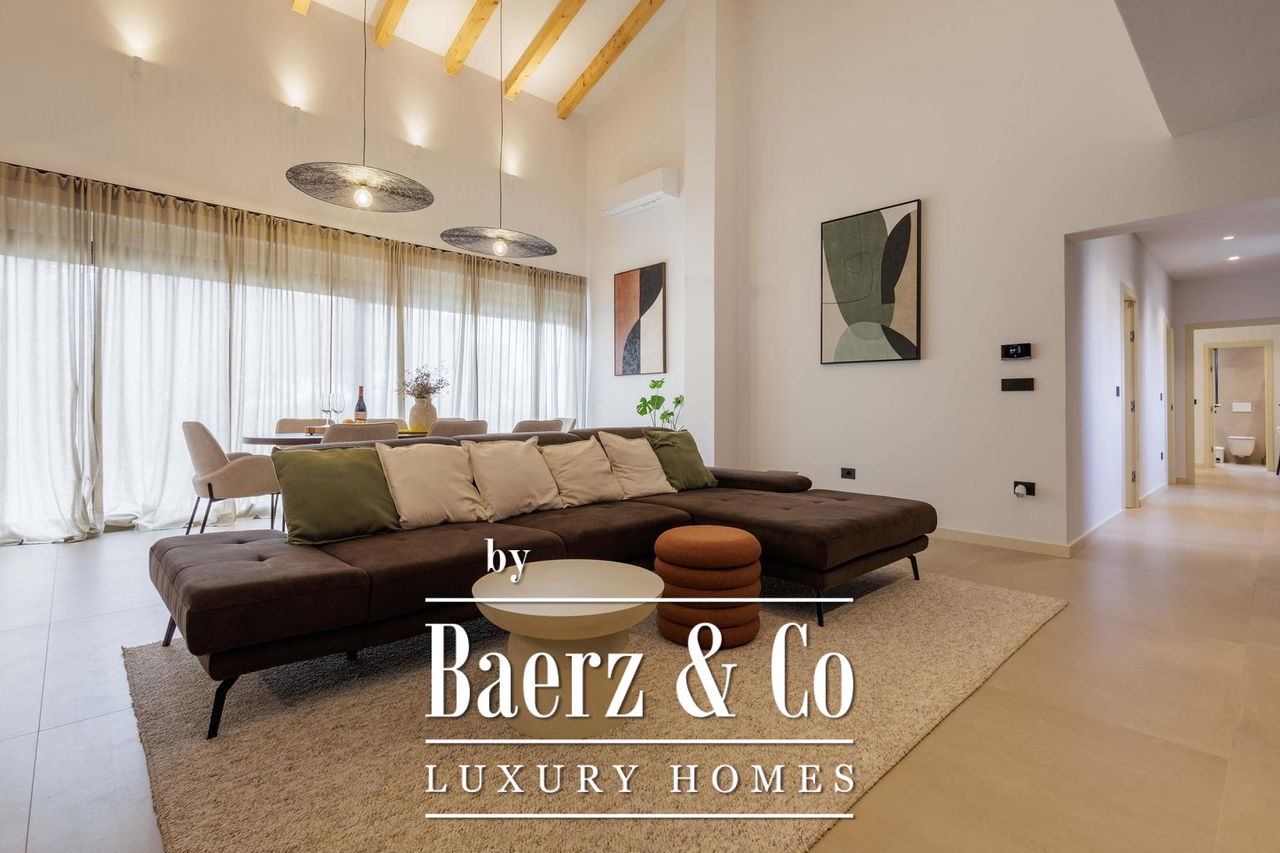 This high-standard, low-energy villa is equipped with underfloor heating powered by a heat pump and seamless air conditioning throughout. Practical design extends to the exterior, where underfloor heating continues into the summer kitchen. The layout includes two separate guest toilets for added convenience. The 1,000 m² plot offers cultivated privacy, with a lush lawn, six olive trees, and an automated irrigation system easing maintenance.