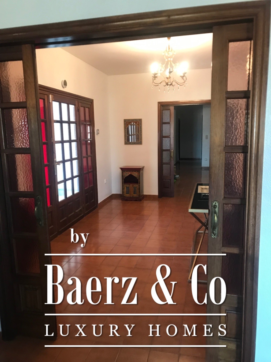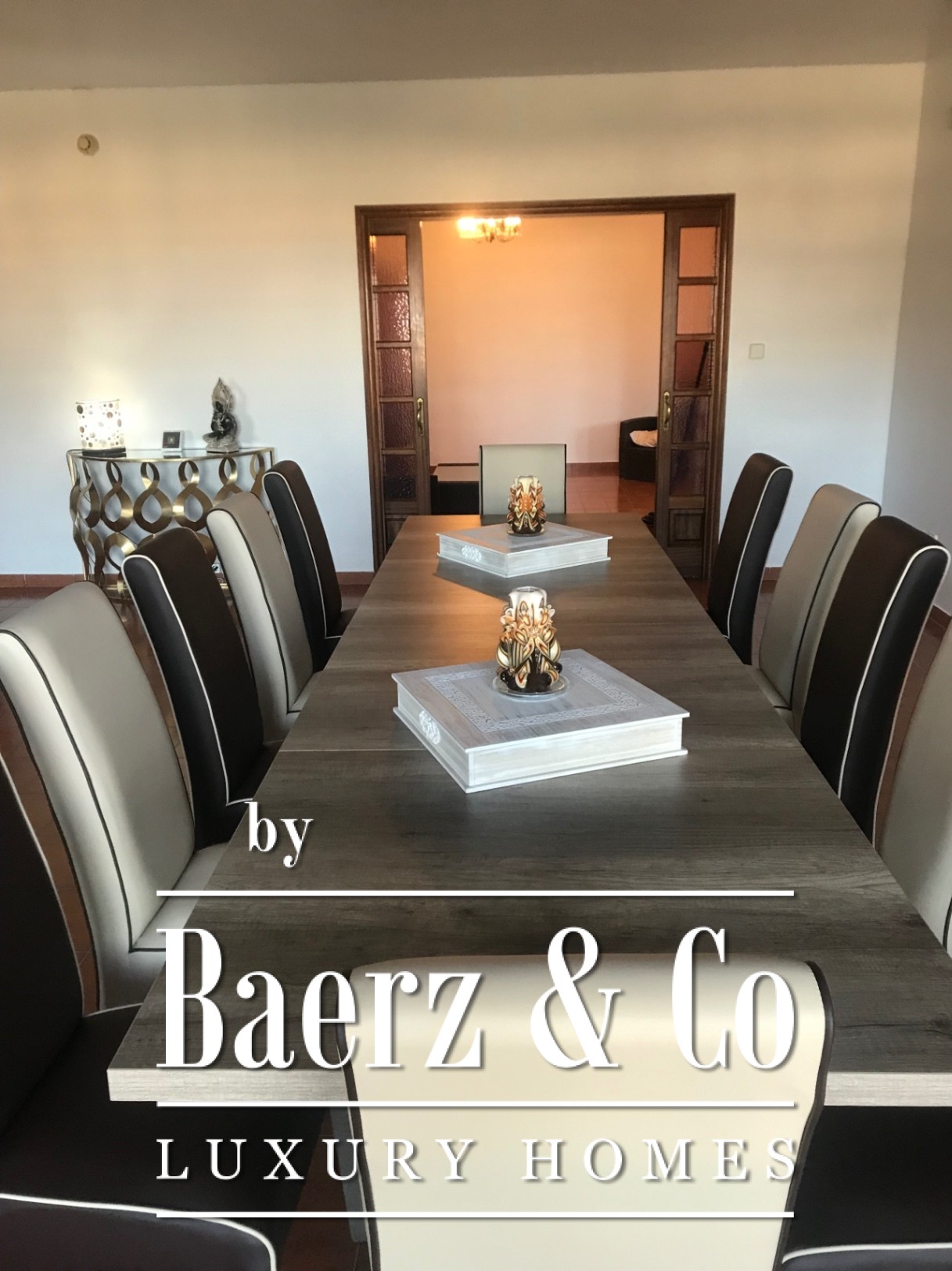 Inside, the layout flows around four generously proportioned double bedrooms and five full bathrooms, with an additional guest toilet for convenience. The main living area, a 100 m² expanse, moves seamlessly into a spacious kitchen and dining area, creating a natural rhythm for gatherings and quiet moments alike. The villa opens towards mature gardens and a swimming pool with a designated children’s area, further complemented by open and covered terraces for year-round enjoyment.