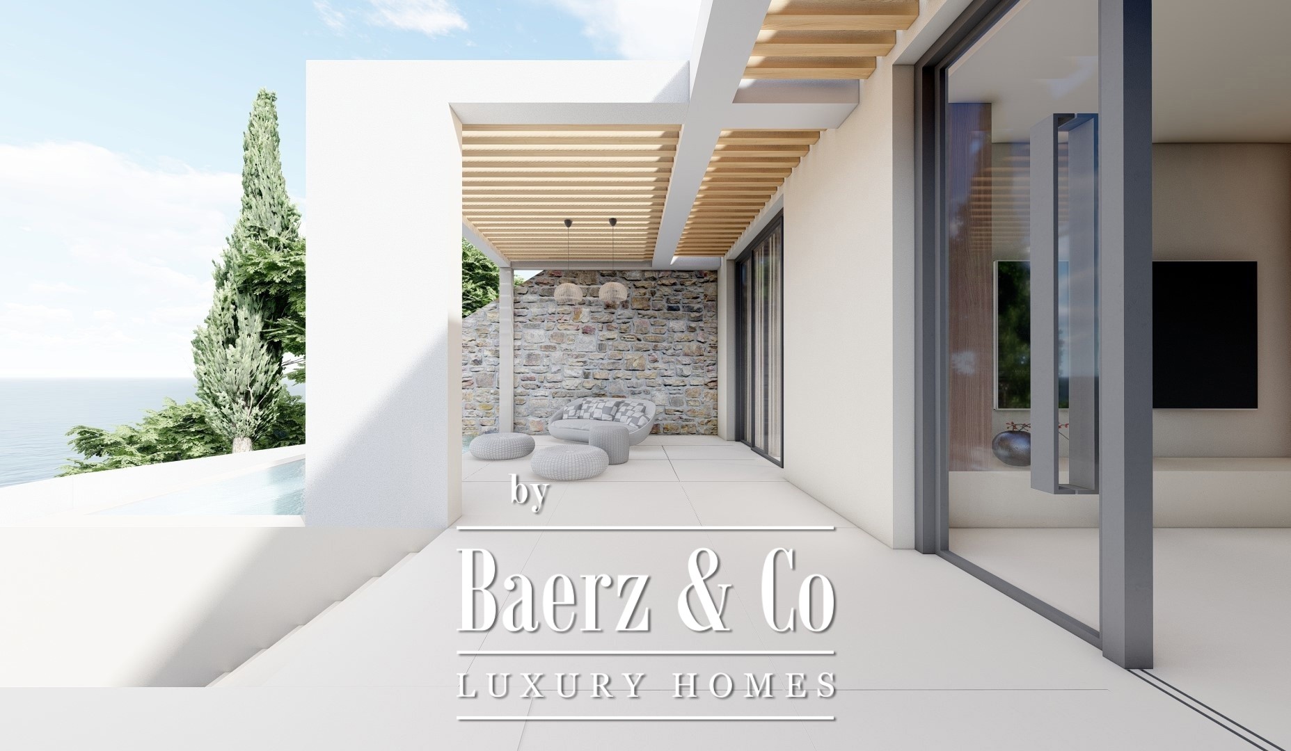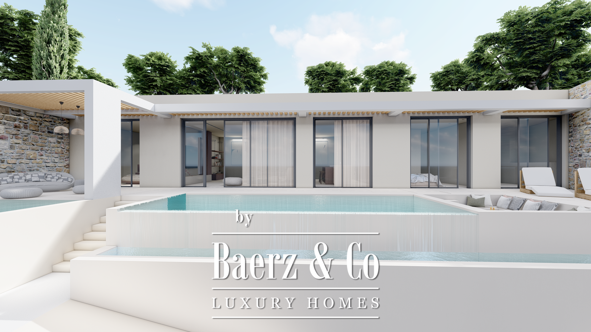 Occupying a 1,000 m² plot, the villa offers a total living area of 180 m². Each of its three bedrooms features an en-suite bathroom and walk-in closet, balancing privacy and comfort. Expansive glass surfaces invite sea light into the open-plan living space, complemented by a smartly equipped kitchen and dedicated wine cellar. Outdoor living unfolds beside an infinity seawater pool, Jacuzzi, and a stone terrace with an outdoor fireplace, all oriented toward the Ionian horizon. Mediterranean landscaping and ambient lighting shape tranquil evenings, while an outdoor shower enhances summer ease.
