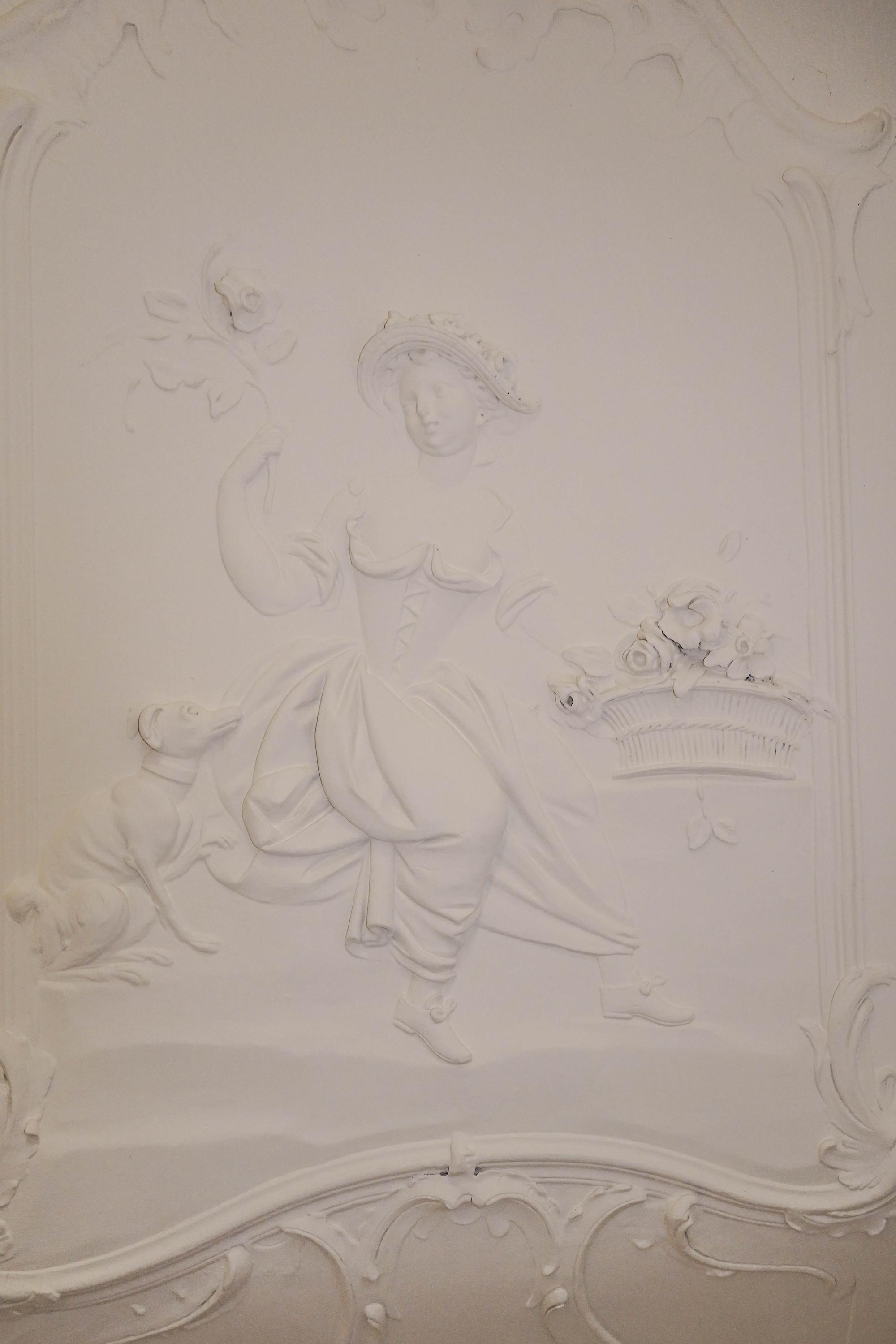 The long hallway, featuring stucco, including the family crest of