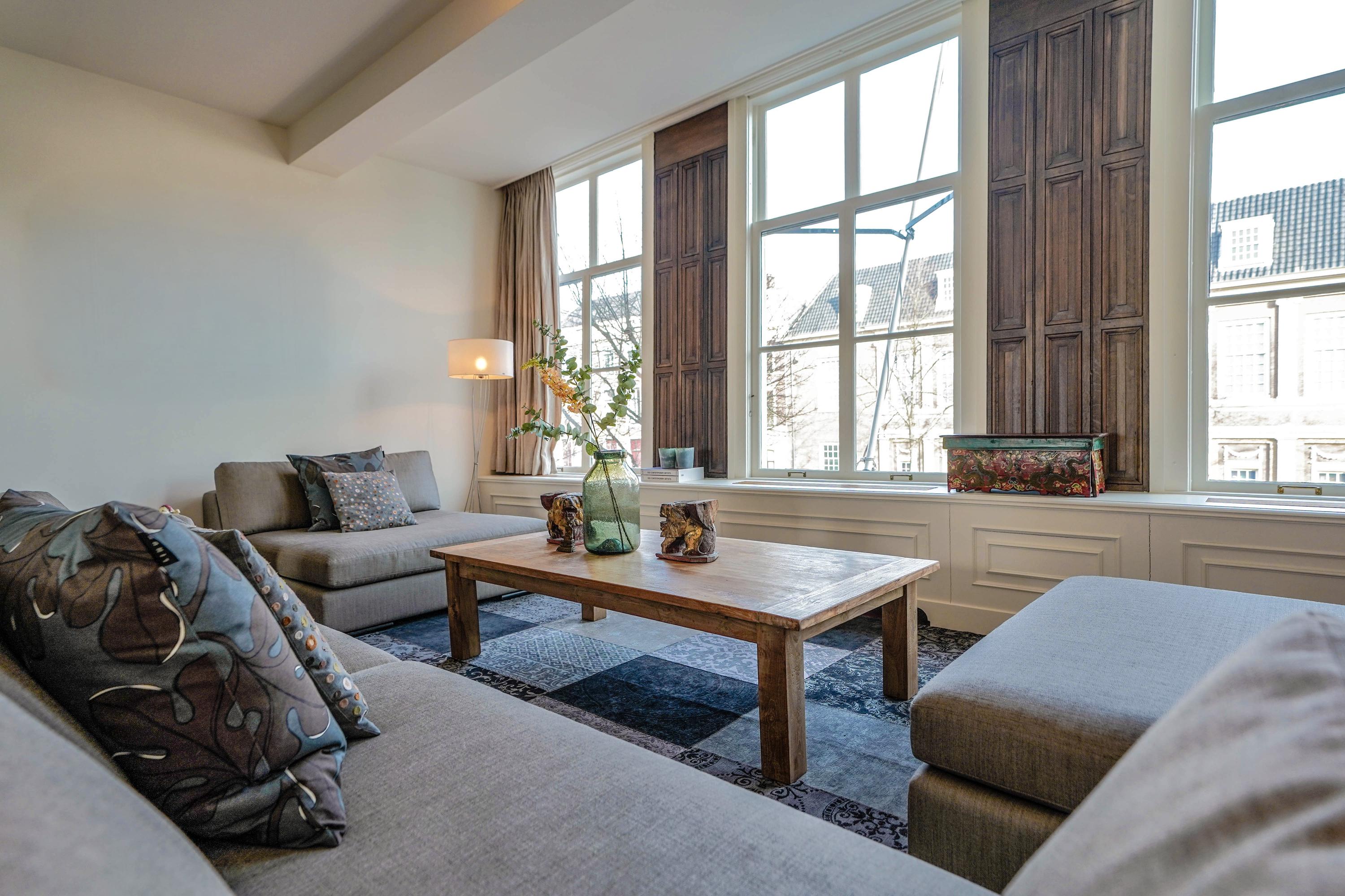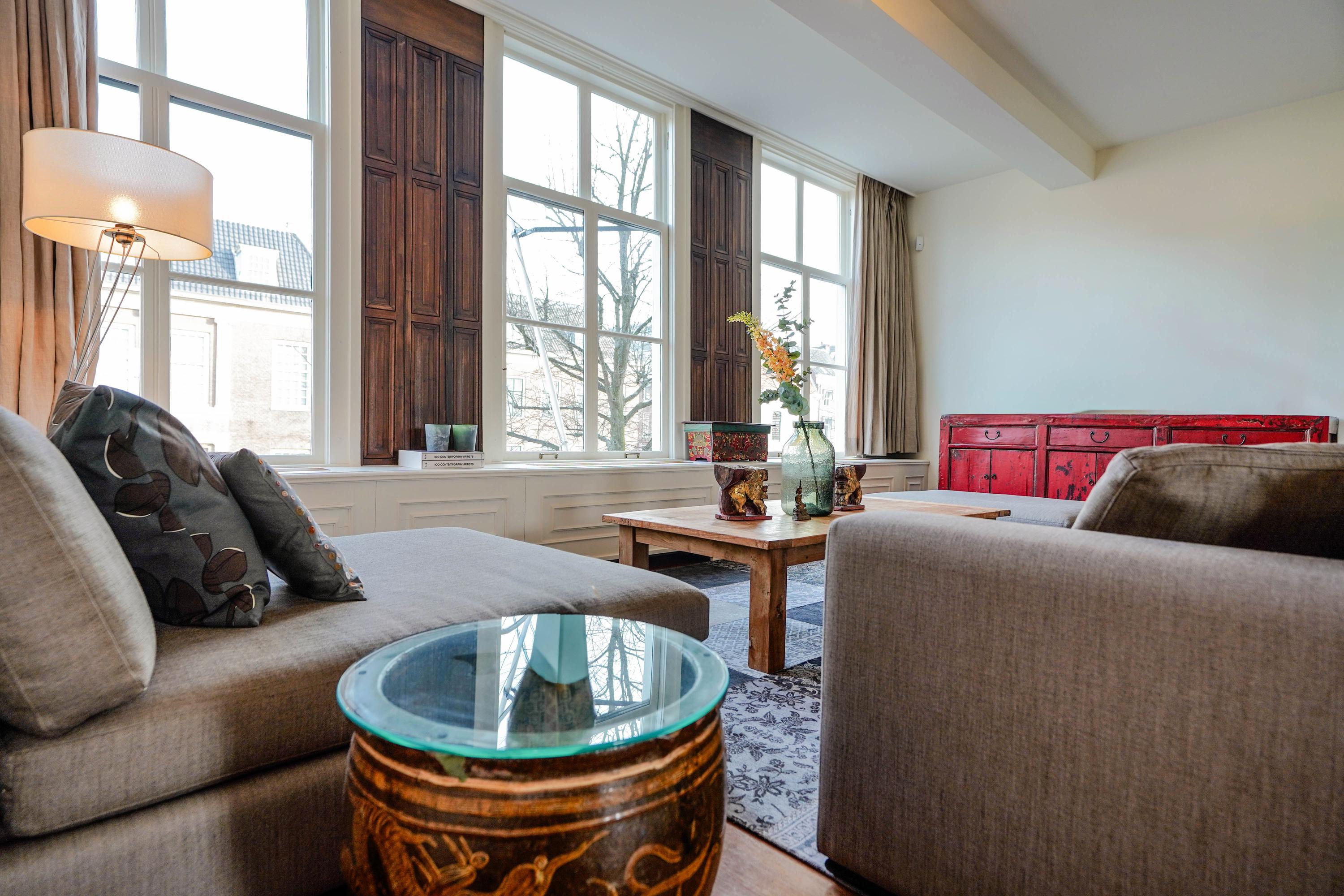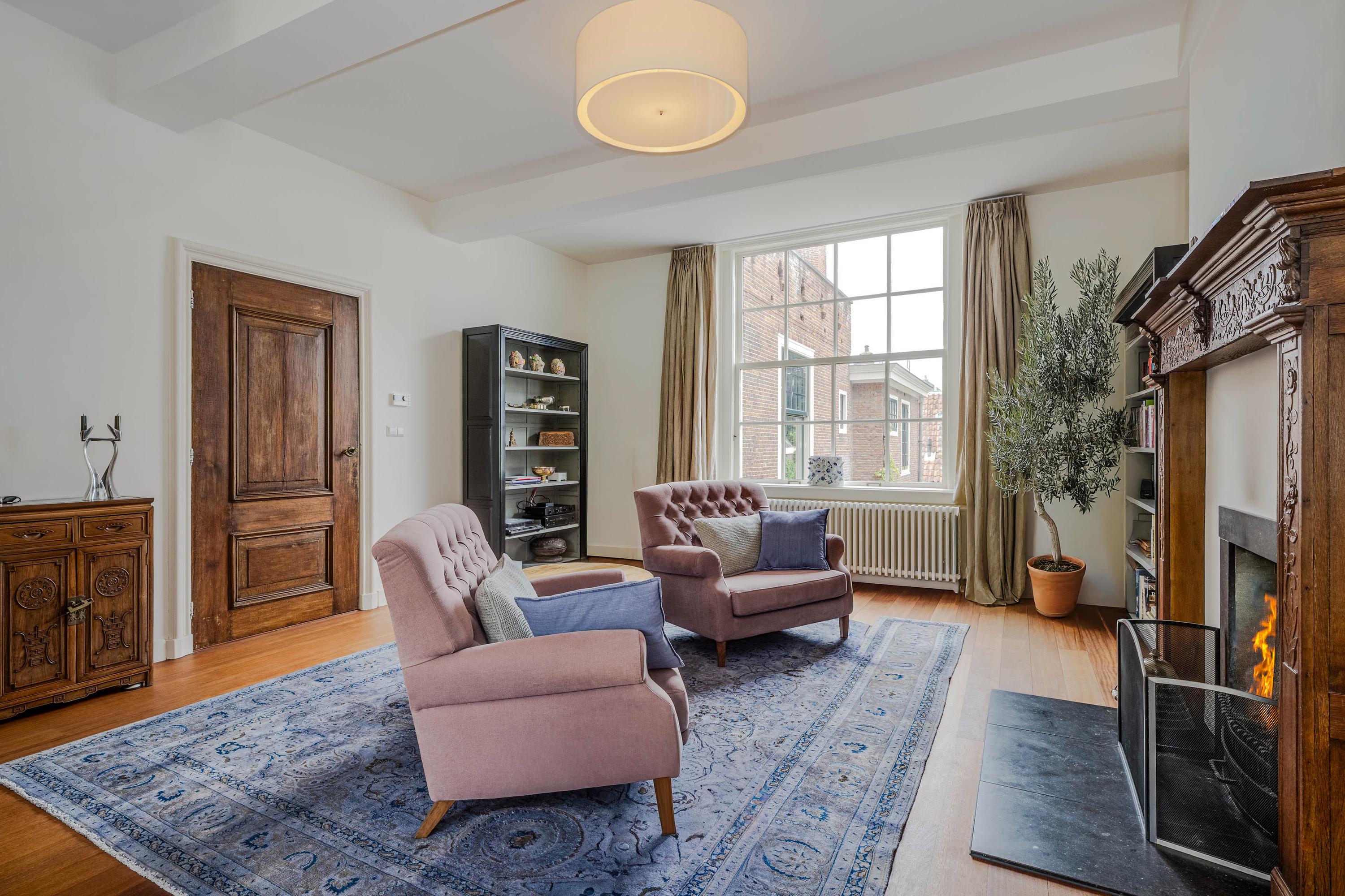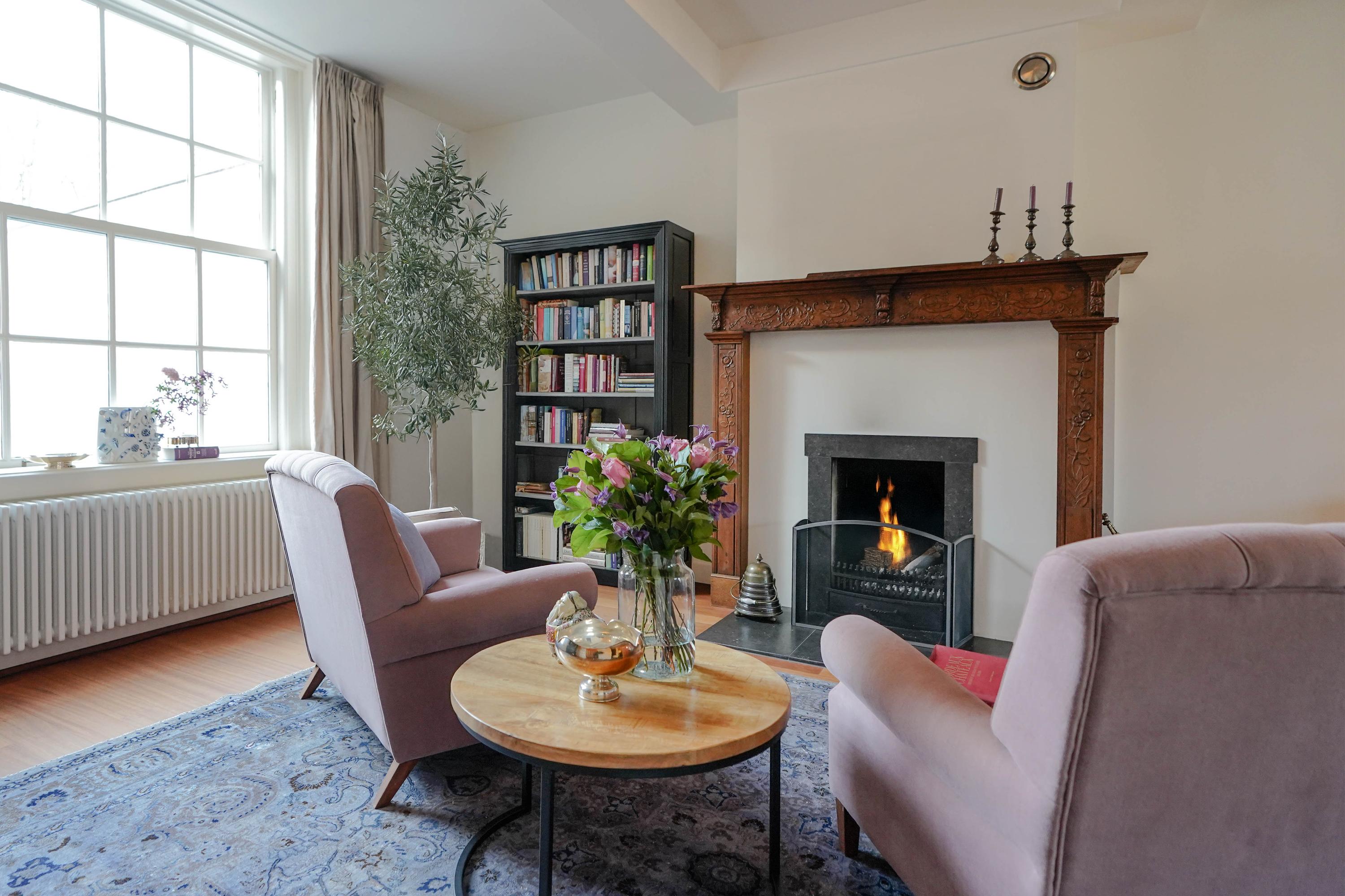 intimate sitting room surrounding the fireplace; at the front is a spacious living room, three windows wide, with a magnificent view of the canal and the historic cityscape.