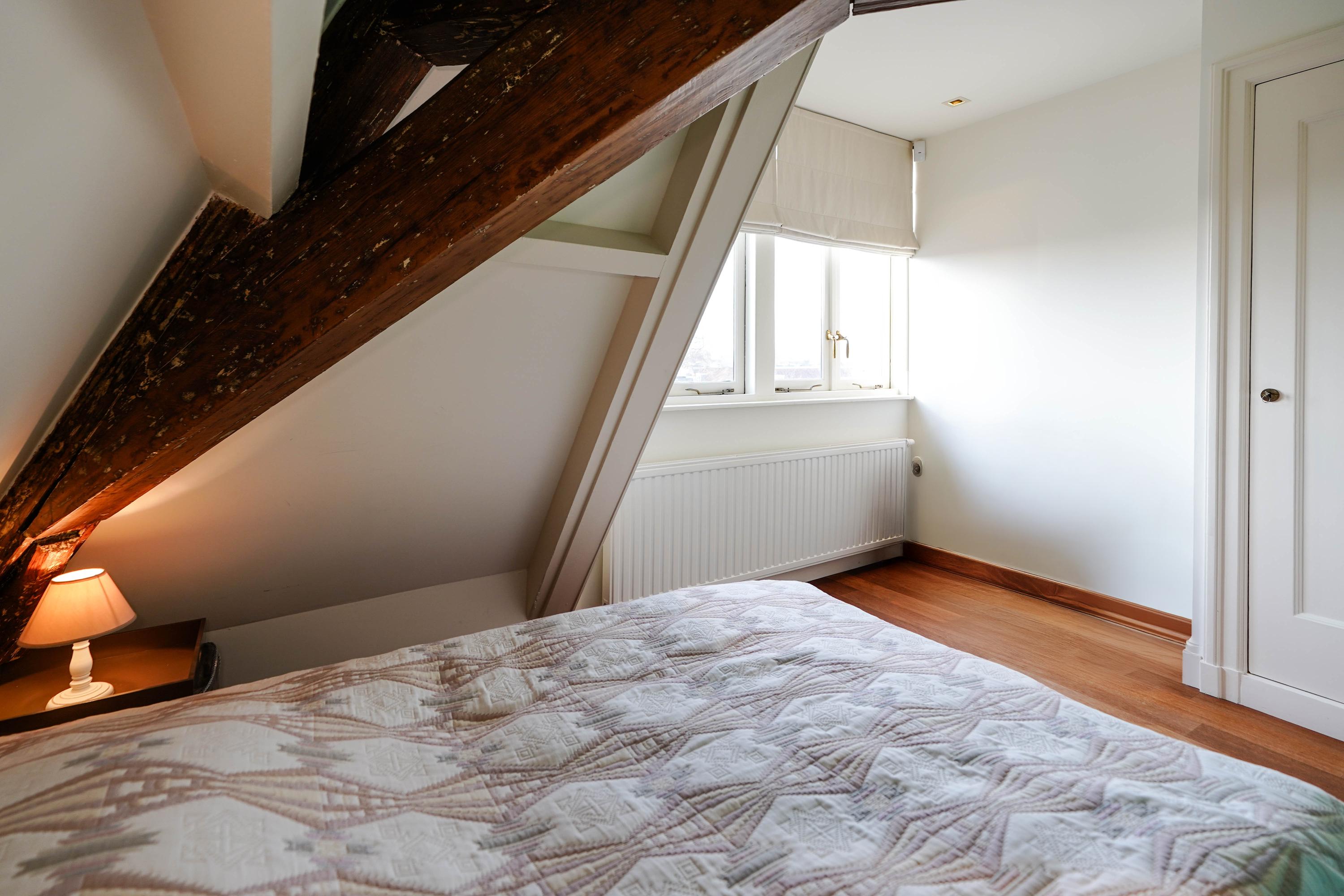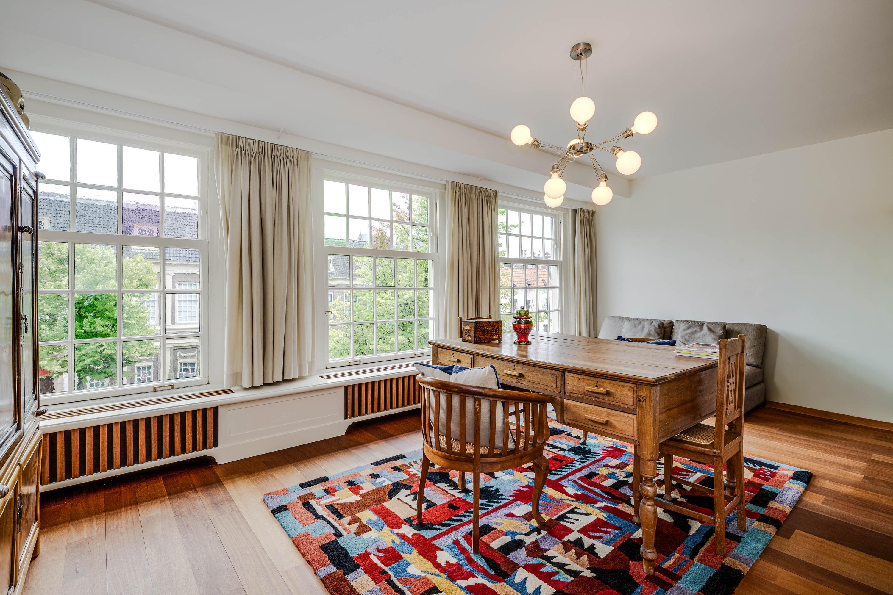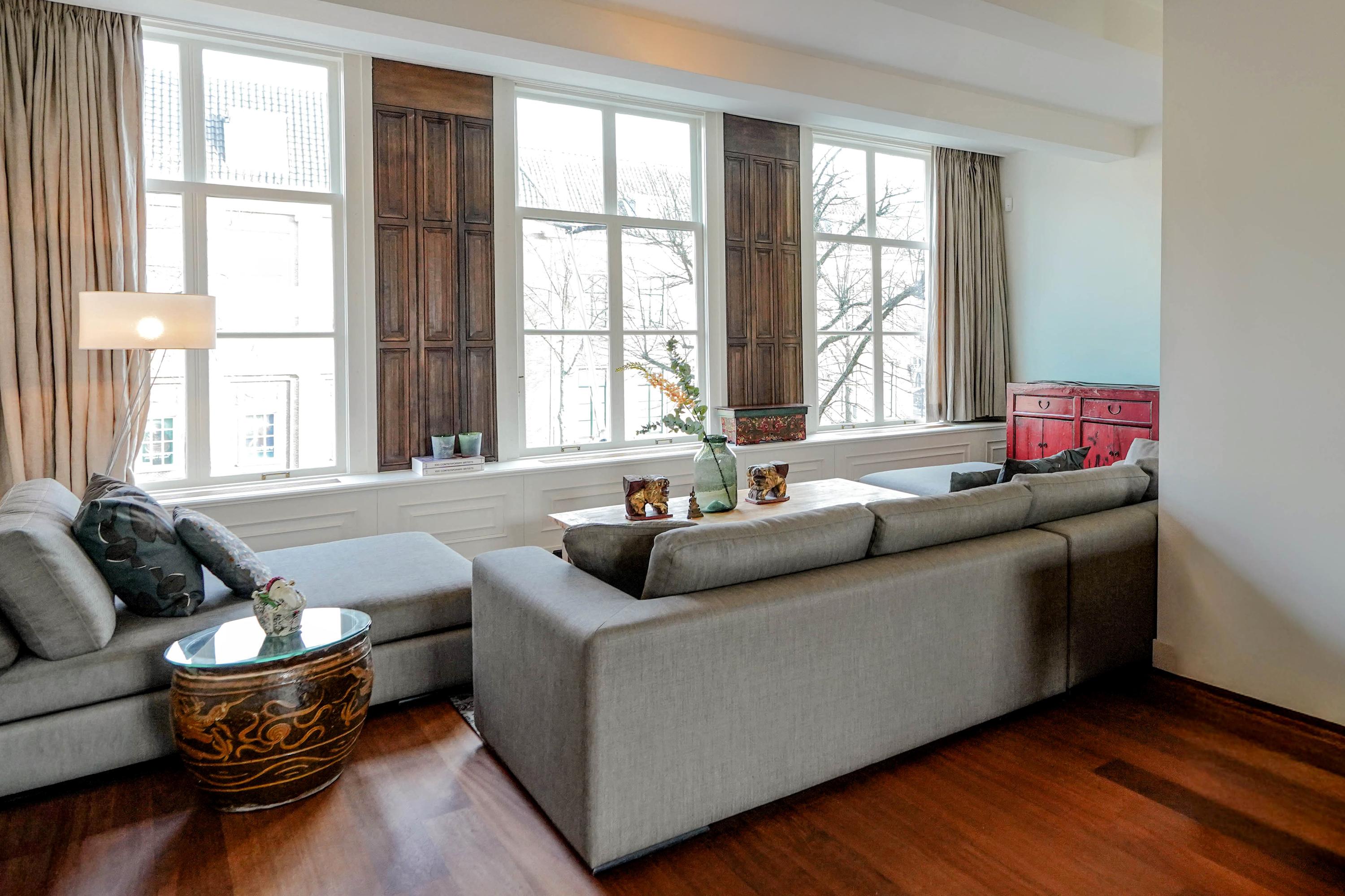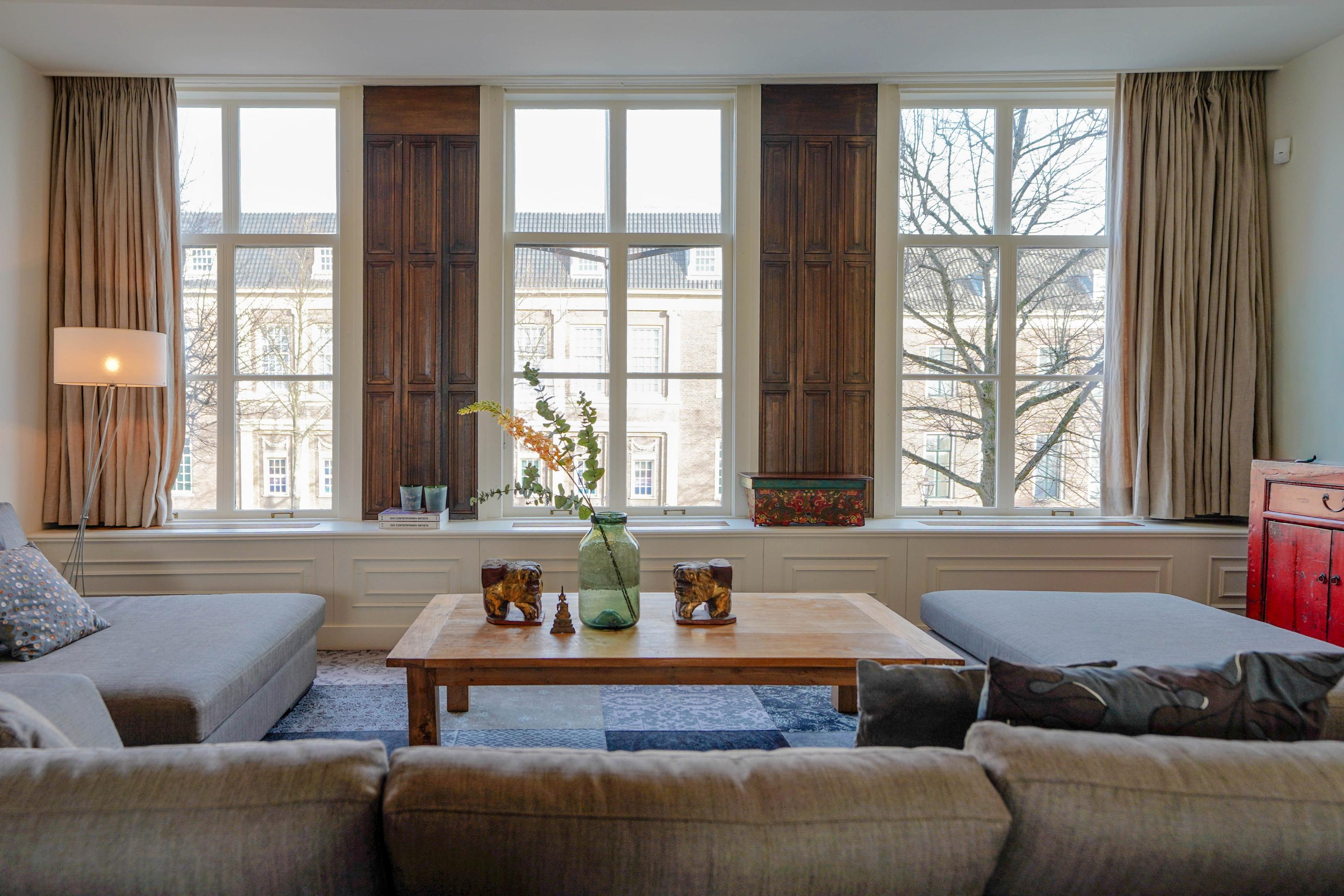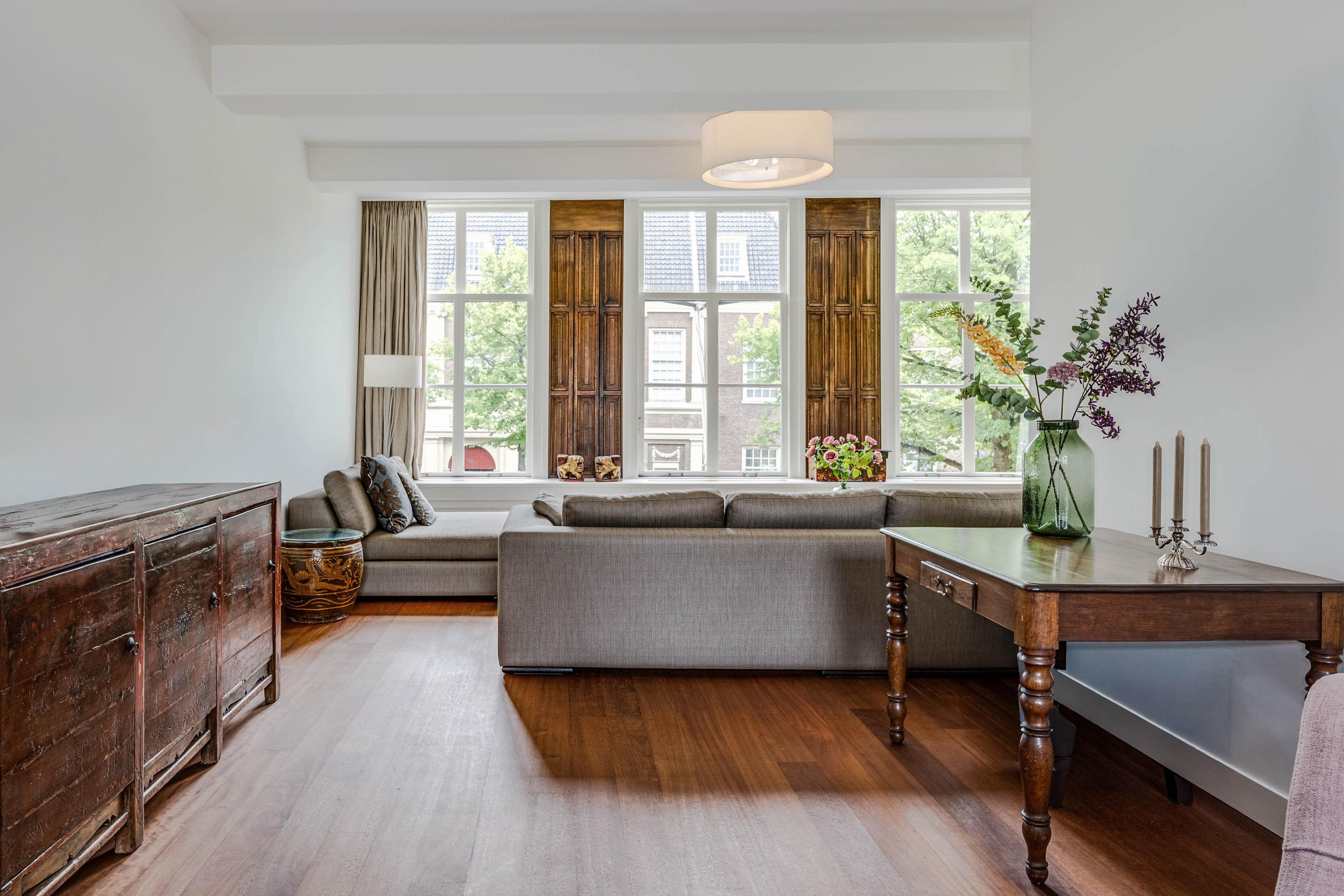 intimate sitting room surrounding the fireplace; at the front is a spacious living room, three windows wide, with a magnificent view of the canal and the historic cityscape.