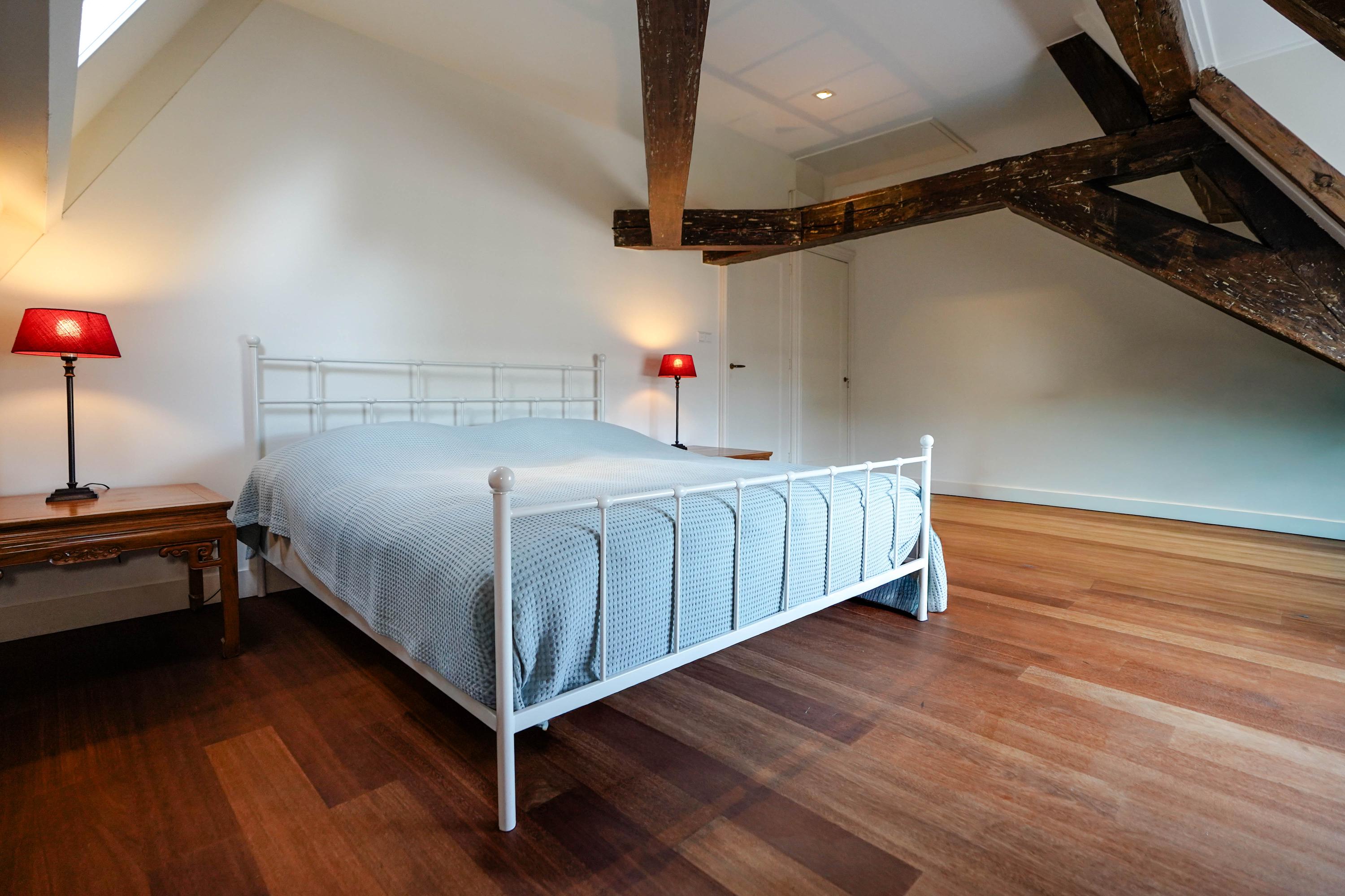 Landing, bathroom with shower and toilet. At the front is a particularly spacious and attractive bedroom with a dormer window and built-in wardrobe. Here you'll also find the hatch with a loft ladder to the large attic space, where the central heating system is located, among other things. At the rear is another bedroom with a dormer window.