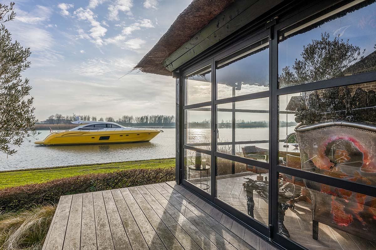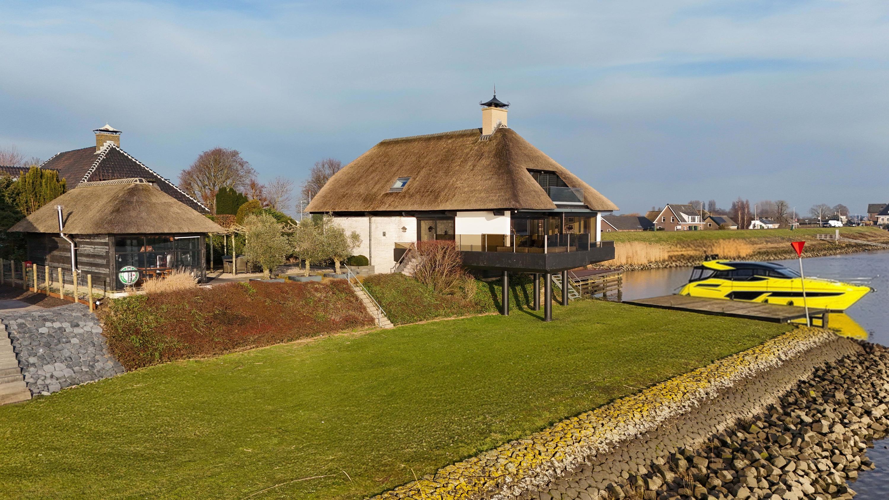 De Werf 5 in Lekkerkerk is a home for people who know what they want. Peace, space, water at your feet and comfort at a high level. This thatched villa is located in a truly rare spot, directly on the river Lek, with its own private jetty and boat lift. Here, you can step straight from your garden onto the boat and sail towards the Biesbosch, Dordrecht or Rotterdam. The view over the water never gets old and changes every moment of the day. This is living with allure, freedom and privacy.