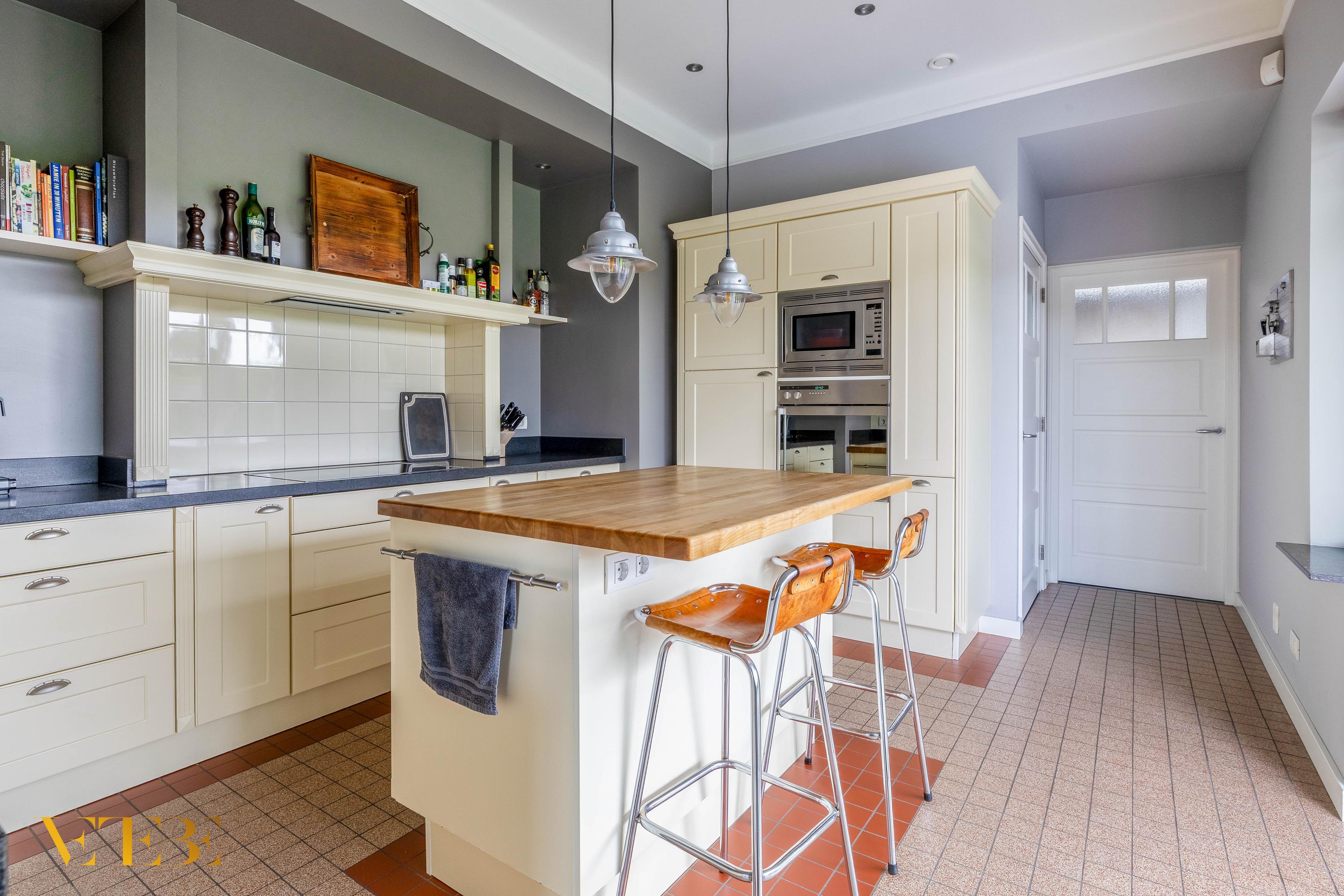 The large kitchen (approx. 16 m²) is equipped with a ceramic cooktop, extractor hood, refrigerator, dishwasher, oven, and microwave. French doors also provide access to the garden. The laundry room contains the connections for washing appliances.