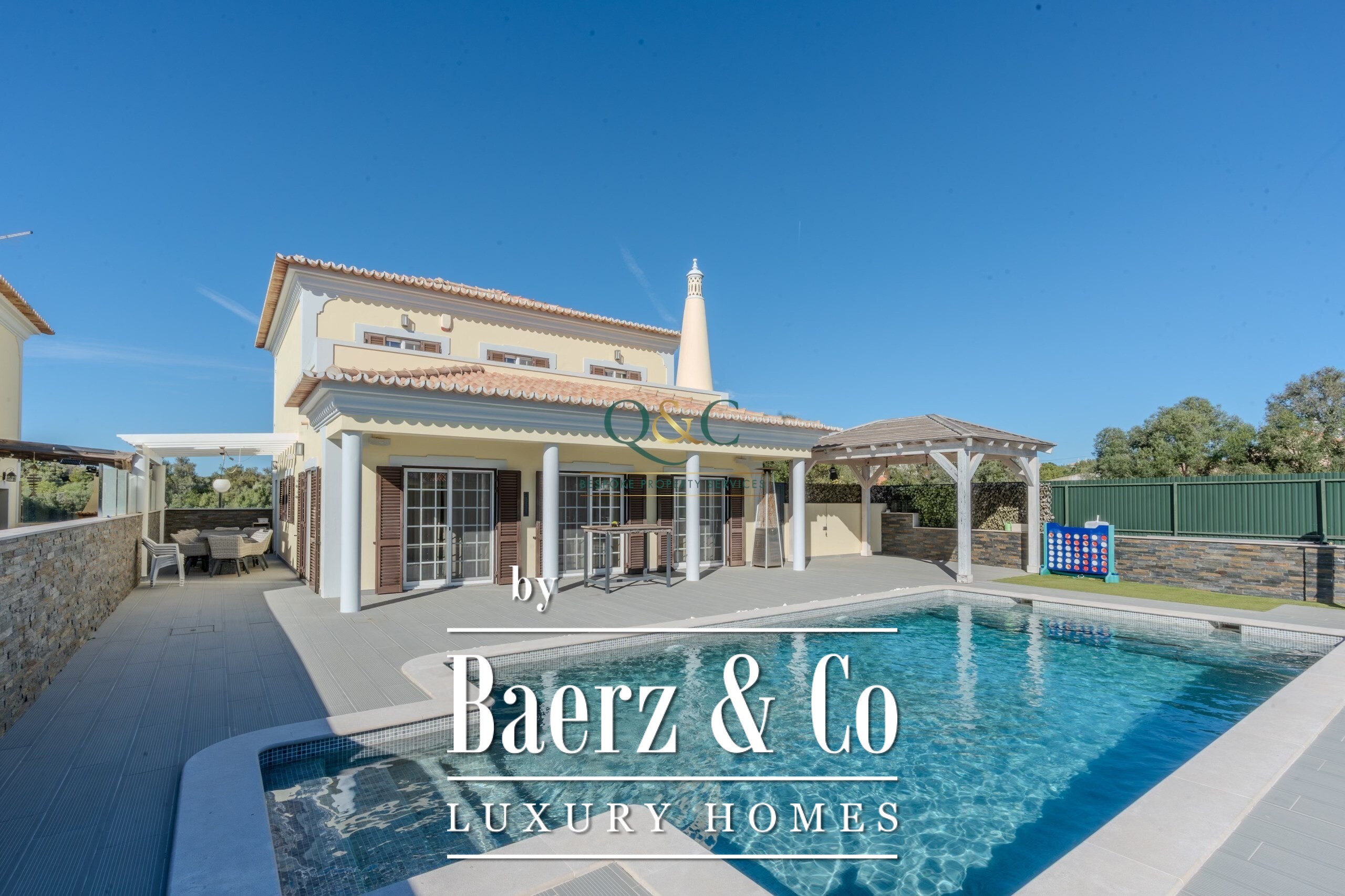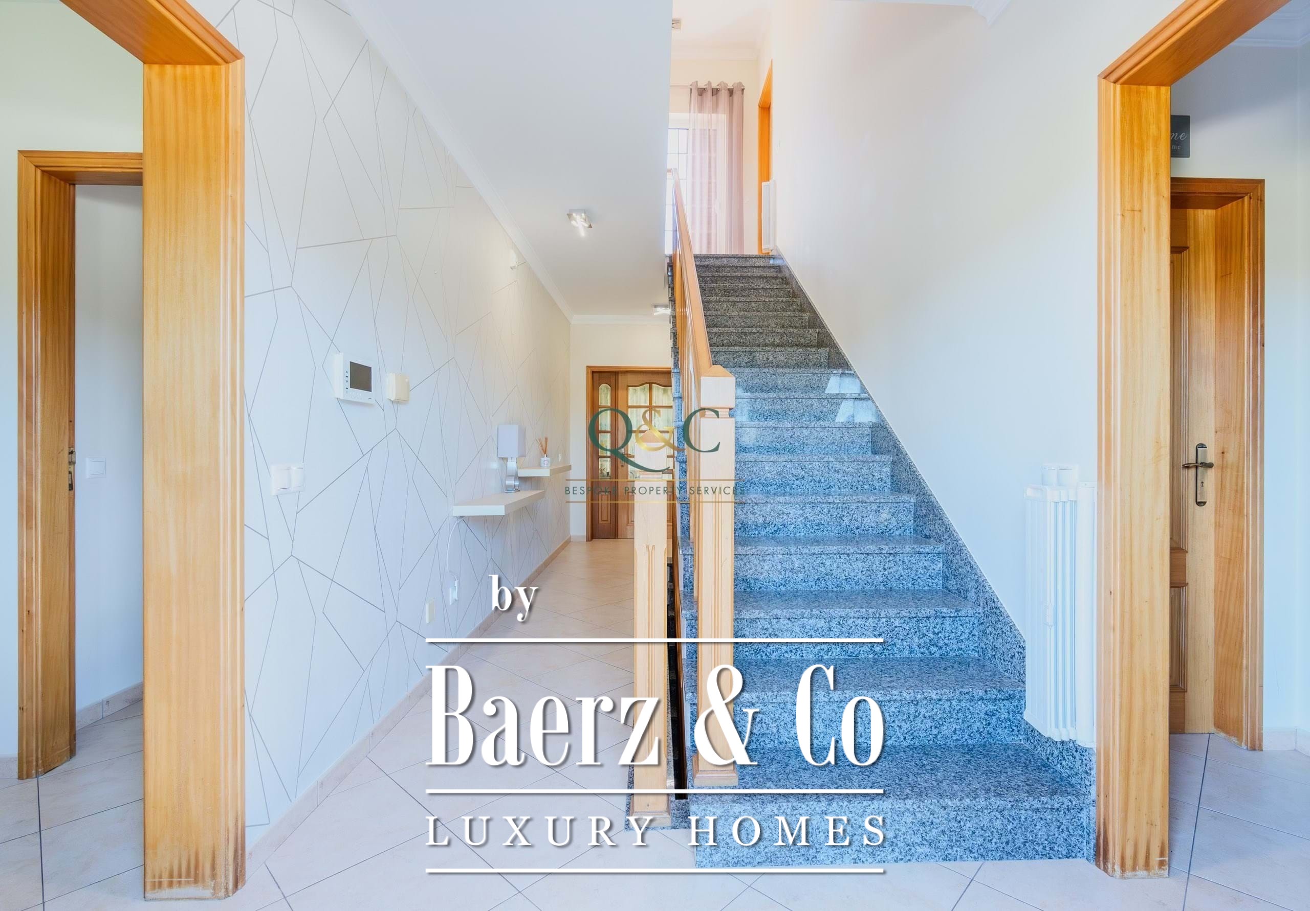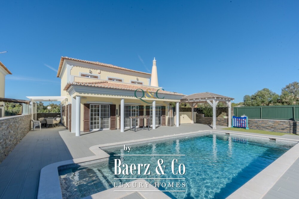 Entering Casa Oliveiras, a private swimming pool and inviting terrace welcome you, inviting quiet relaxation or effortless entertaining under the Algarve sun. The villa features a garage, basement, and dedicated laundry room, combining everyday practicality with understated comfort. Air conditioning, ambient music, double glazing, and a central vacuum system enhance the daily living experience, while a fully equipped kitchen and built-in wardrobes offer further convenience.