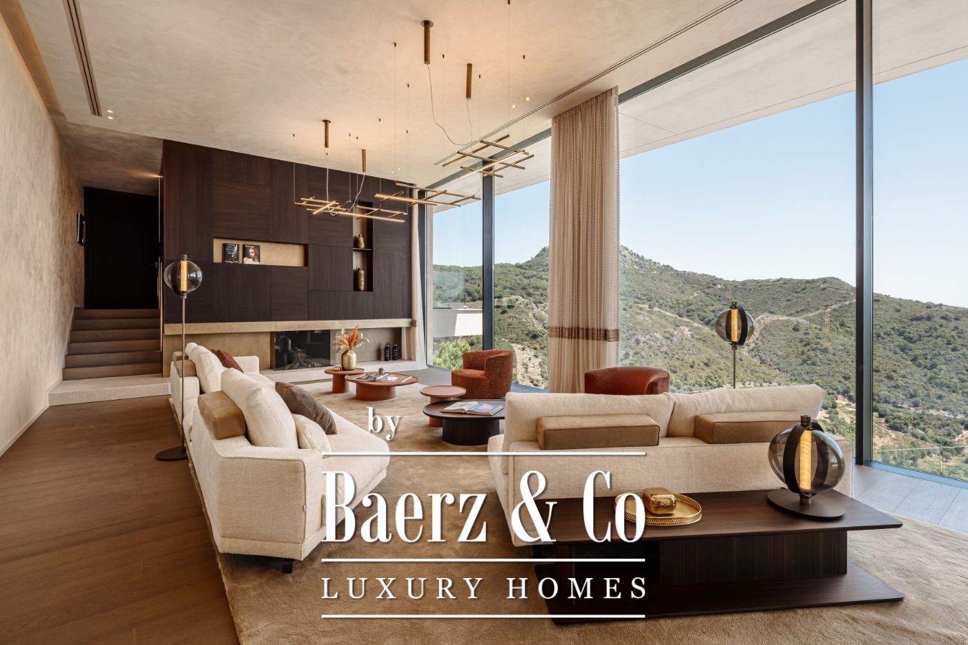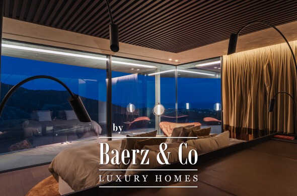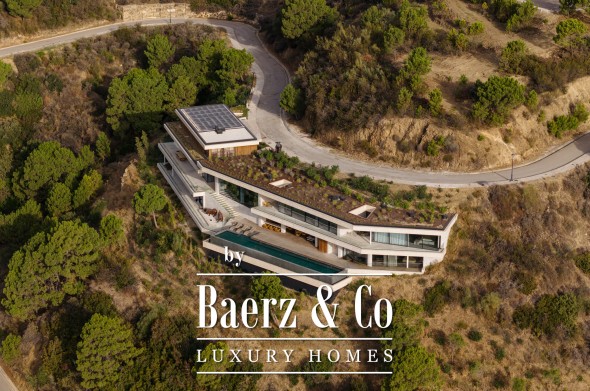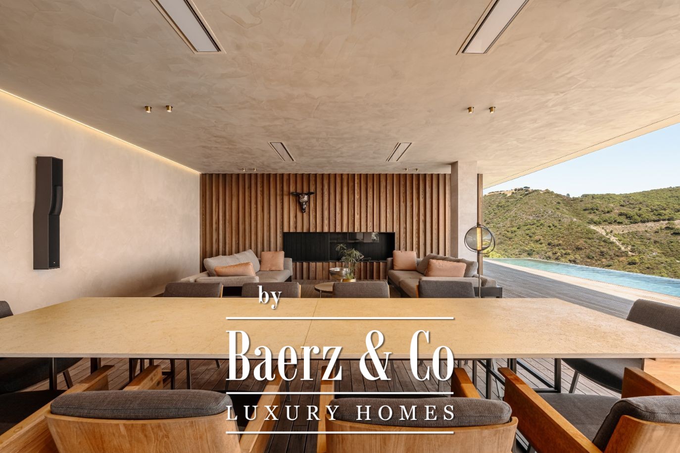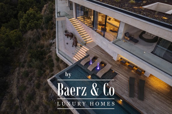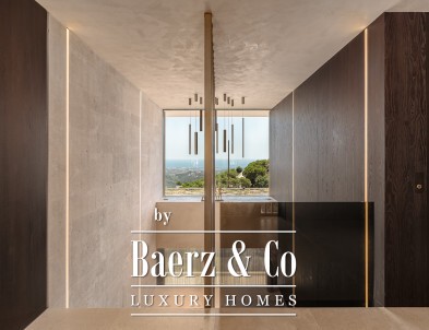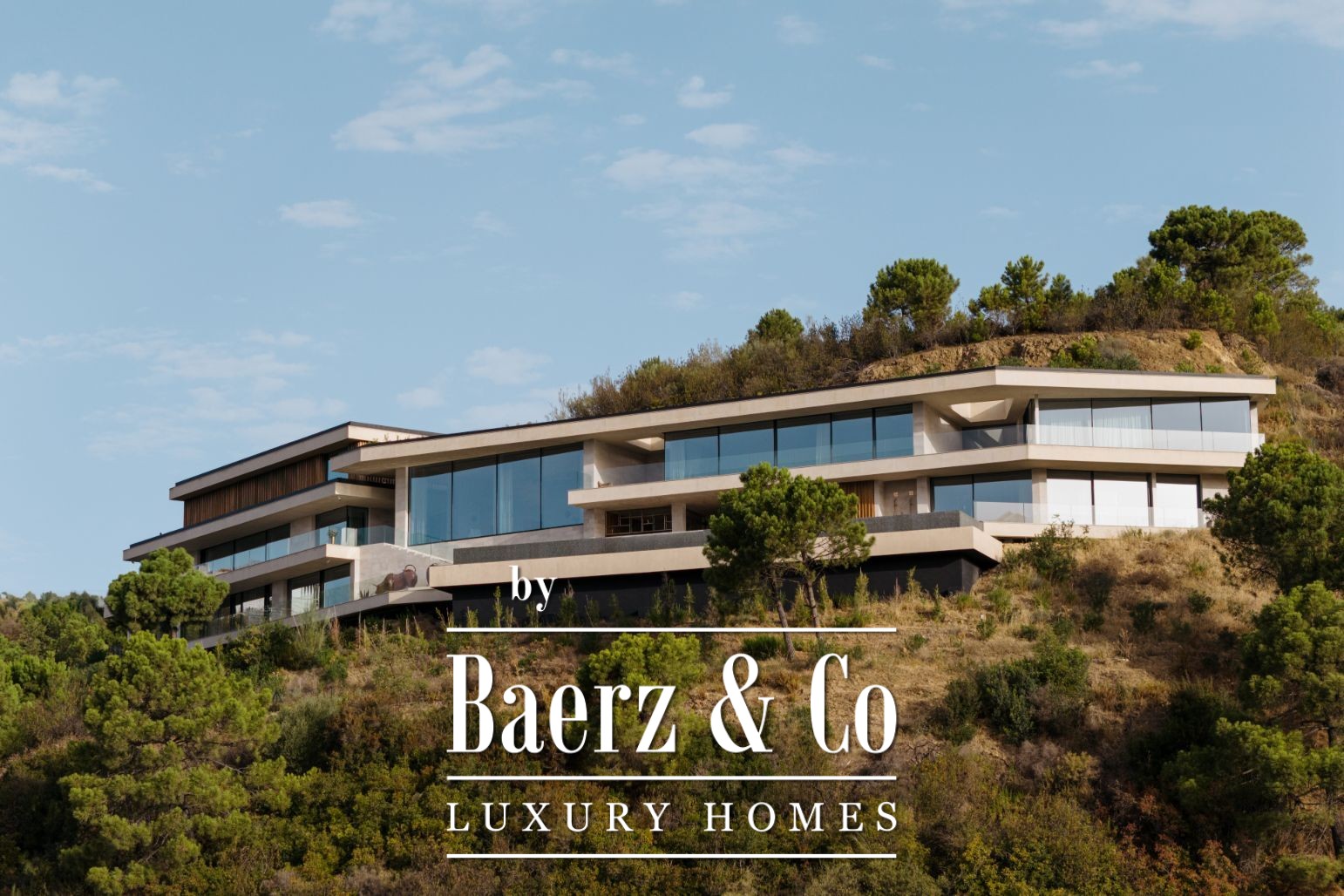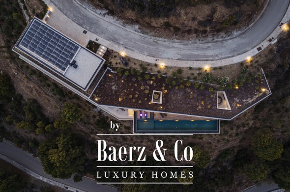 The spectacular house of 1100 m² with 500-m² terraces sits on a large plot of 5.127 m² with an indigenous garden that tolerates drought. It is unique, designed and built for comfort, enjoyment and well-being. The building is fully integrated with the mountains and personalized to the plot, orientation and views. The nature provides an idyllic setting for this luxury property that has a limited footprint on the natural environment and meets an absolute standard of excellence, guided by the principles of sustainable design. It boasts a green roof, solar panels (50 m²) and energy-efficient LED lights. The over-sized picture windows at full ceiling height with Schüco window frames let in the unforgettable, 180 degree panoramic views to the sea and mountains.