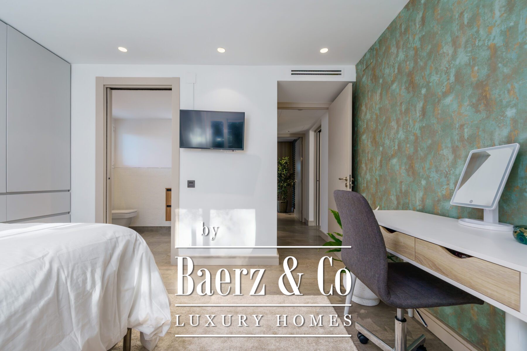 Upstairs, the master suite offers a generous walk-in wardrobe and a refined en-suite bathroom. An additional guest bedroom on this floor features its own walk-in closet and en-suite, while the living area opens to the solarium terrace, framing partial sea and mountain views. The terrace provides ample opportunity for both relaxation and entertaining.