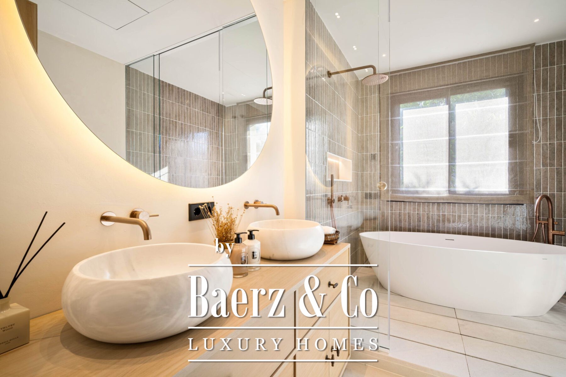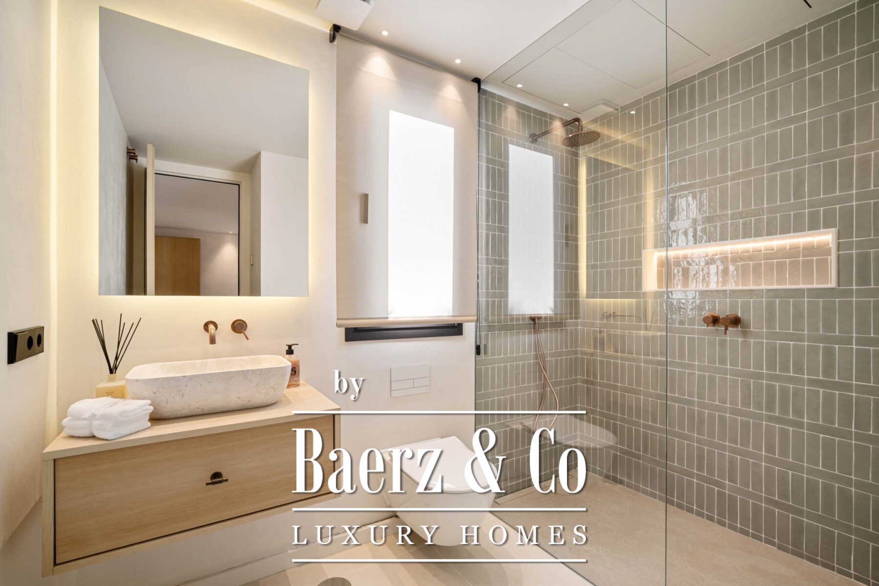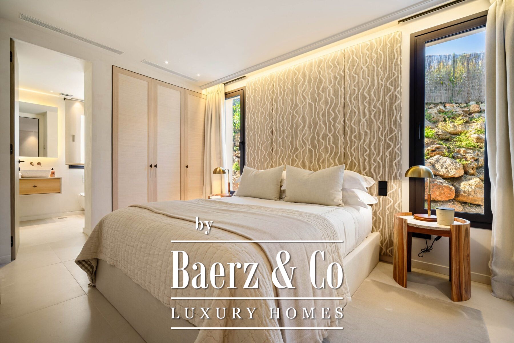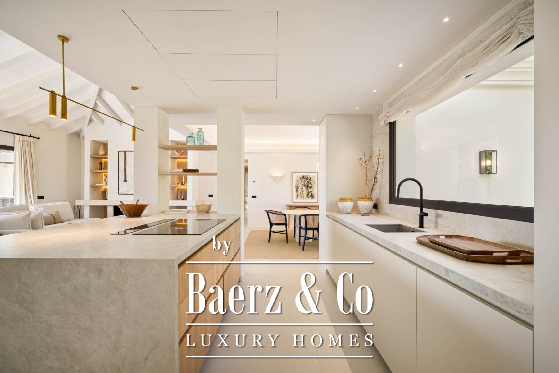Step inside to discover a calming palette of natural tones, soaring vaulted ceilings, and an open-plan living space that seamlessly flows into a modern kitchen and dining area. Each detail has been carefully curated, from the sleek finishes and custom furnishings to the high-spec appliances and ambient lighting. Floor-to-ceiling glass doors invite natural light throughout and open onto a generous terrace complete with a sunken lounge, outdoor kitchen, and a striking infinity-edge pool that appears to float above the landscape.