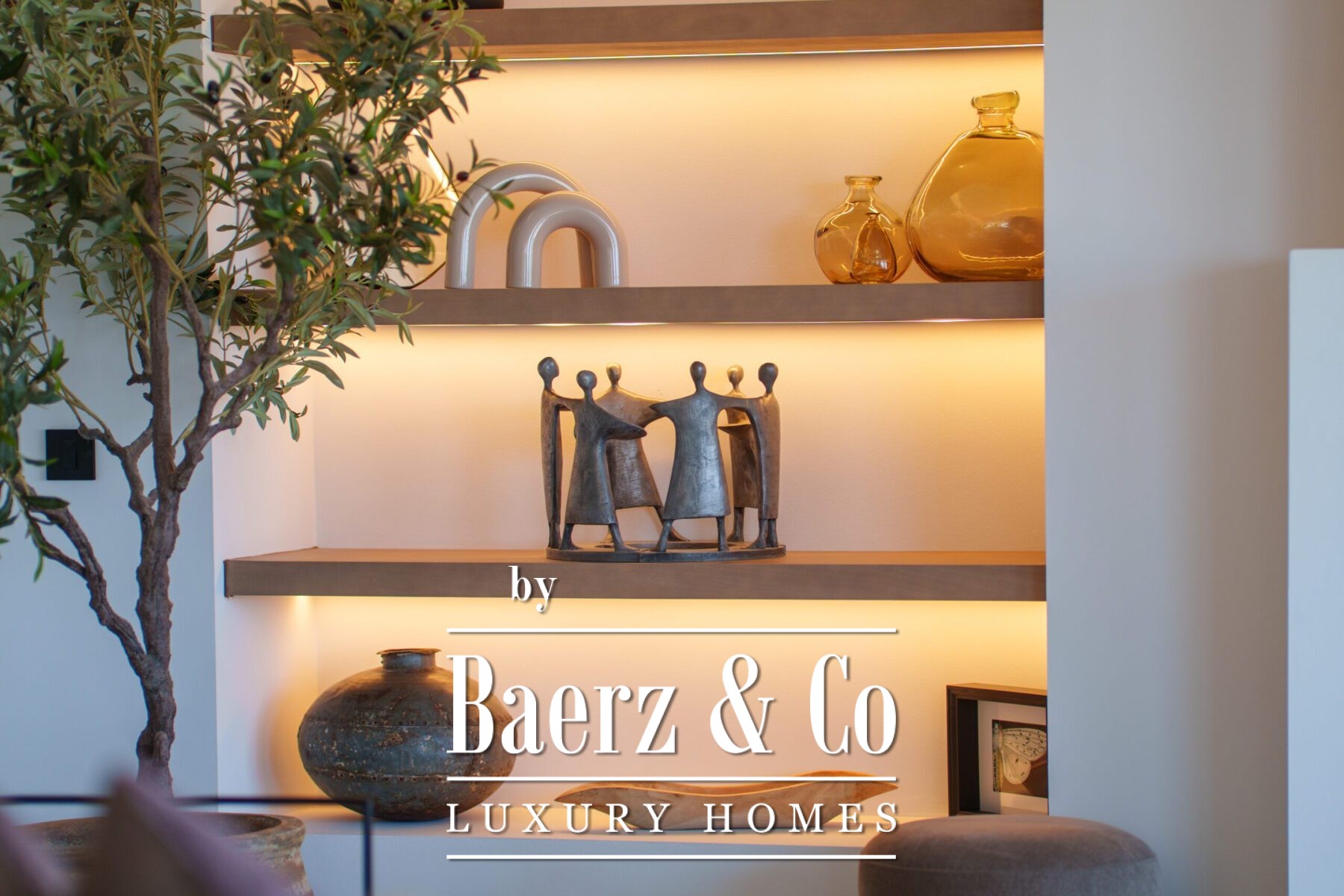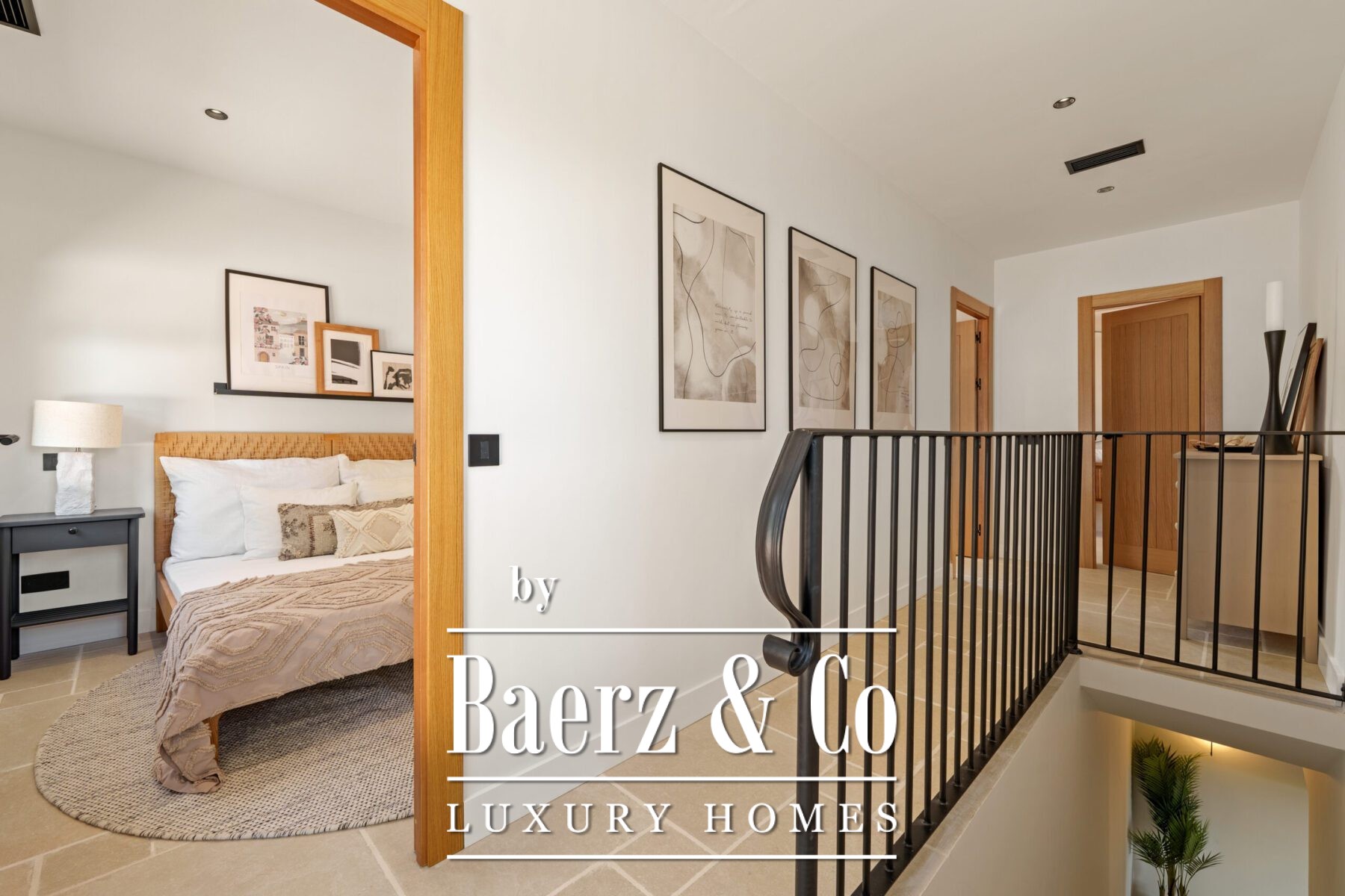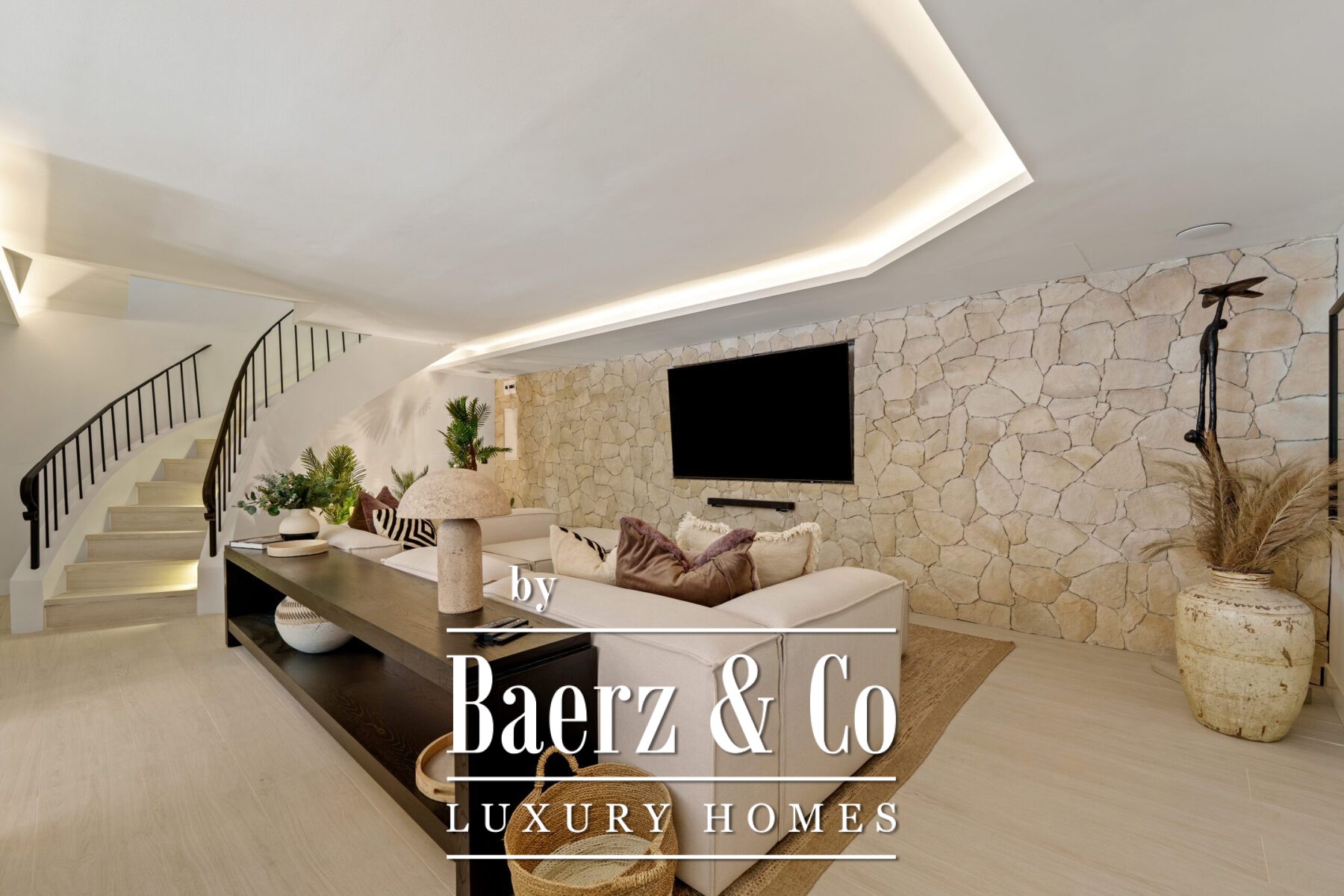 Outside, landscaped gardens embrace a private swimming pool and sunken lounge, adorned with ambient lighting and shaded spaces for tranquil reflection or social occasions. A multi-car garage, security features, and proximity to golf courses, the beach, Puerto Banús, and Marbella’s amenities complete the offering.