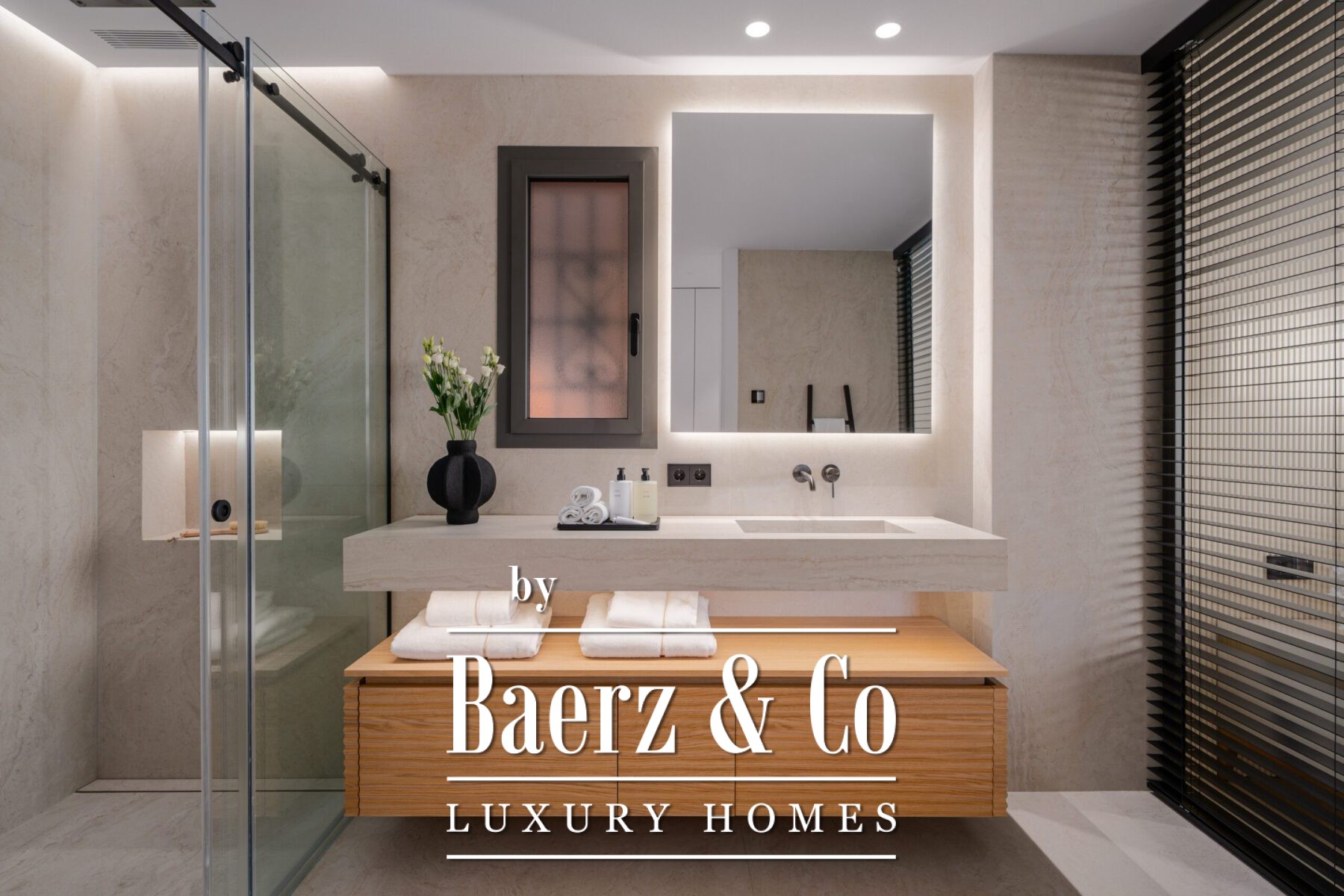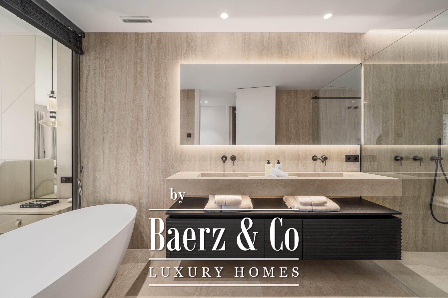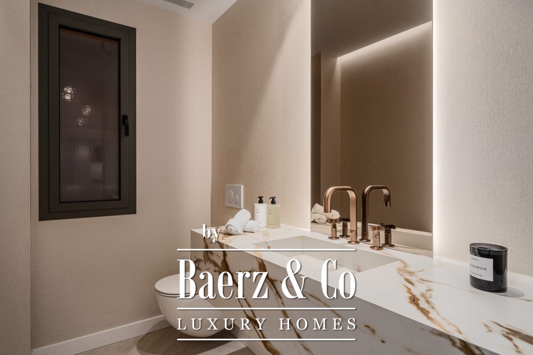 Within this secured, gated enclave with 24-hour security, the four-bedroom, four-and-a-half-bathroom home reveals refined details. Floor-to-ceiling windows illuminate the open living and dining space, seamlessly extending to a spacious terrace designed for tranquil hours or entertaining under the Marbella sky. The kitchen is appointed with Gaggenau appliances, complemented by natural oak floors and an intuitive smart home system, underlining discreet luxury and ease.
