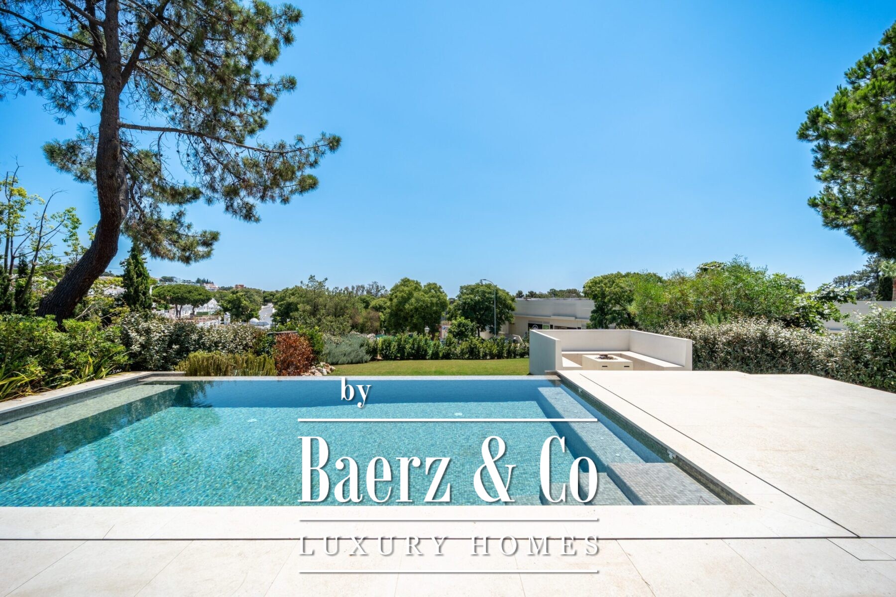The exterior offers an exceptional outdoor living experience, with a fully equipped summer kitchen, a heated infinity pool, and a cozy chill-out area with a fire pit, perfect for relaxed evenings in the garden.