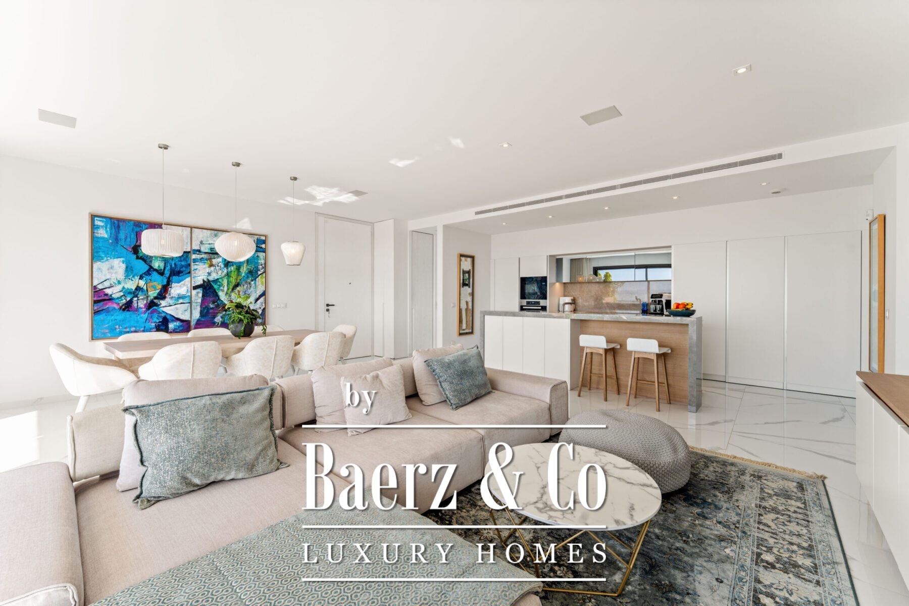 Indoors, open-plan living, dining, and kitchen areas harmonise contemporary Scandinavian tone with functional sophistication. Features such as floor-to-ceiling doors, Miele appliances, stone worktops, electric blinds, underfloor heating, and a guest WC contribute to a cohesive, comfortable atmosphere. Two underground parking spaces and a storage room ensure practical luxury.