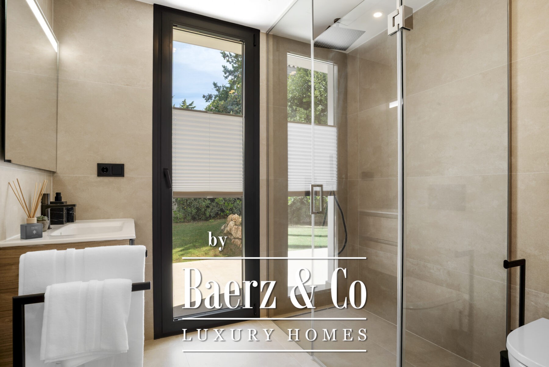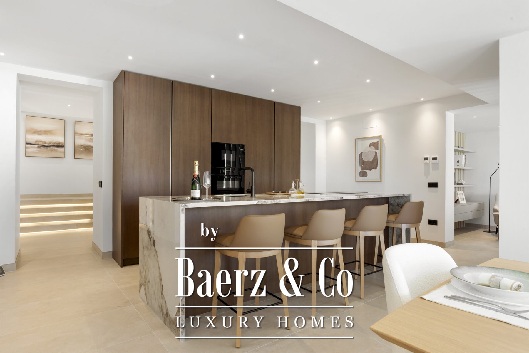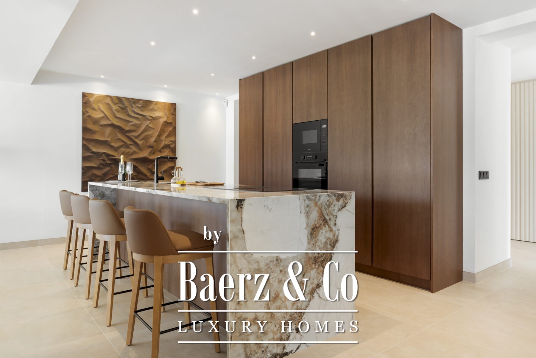 The main level features sun-filled spaces, including four generously proportioned bedrooms and four contemporary bathrooms. The open-plan kitchen, finished with a central island and premium appliances, flows into spacious living and dining areas, all oriented toward the expansive terrace. From every vantage, natural light animates the rooms, extending seamlessly to a landscaped garden with a private swimming pool.