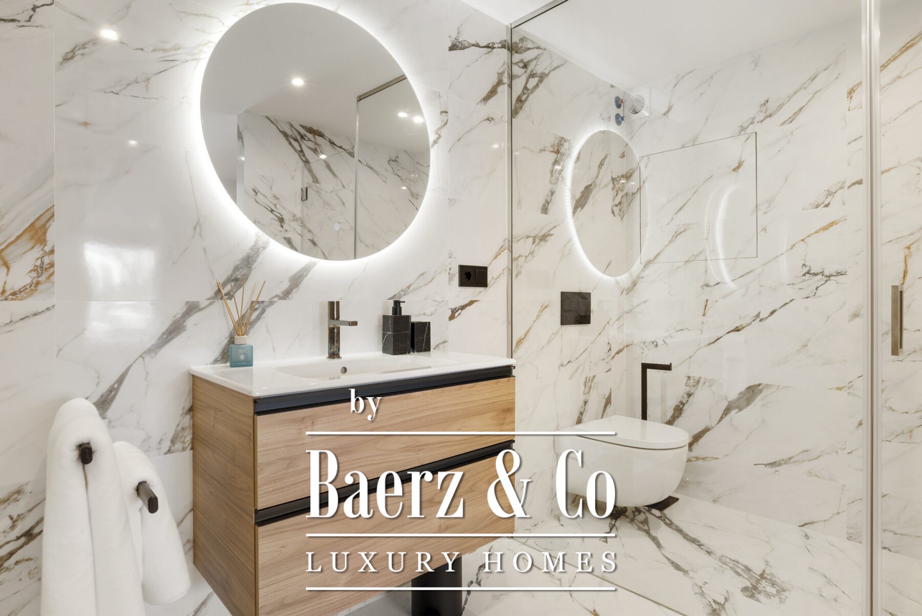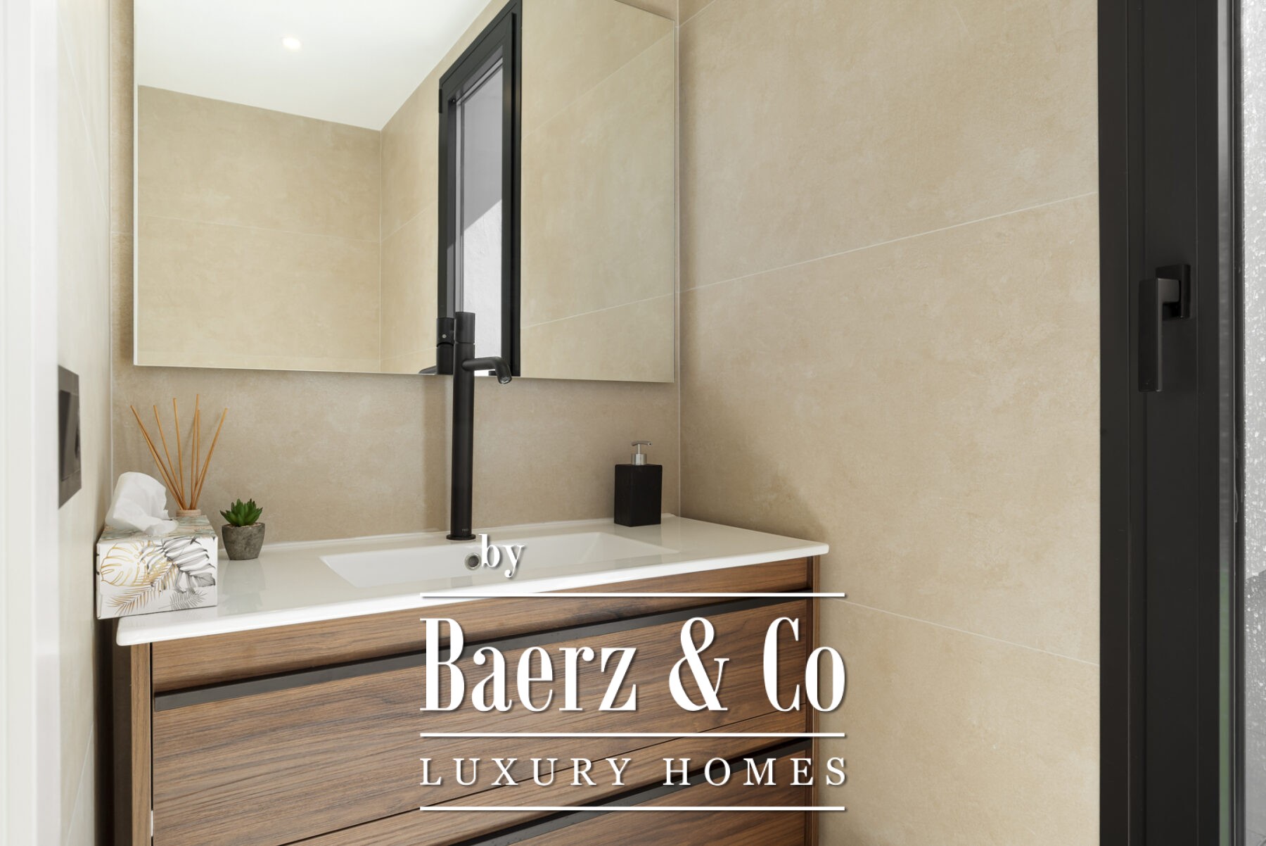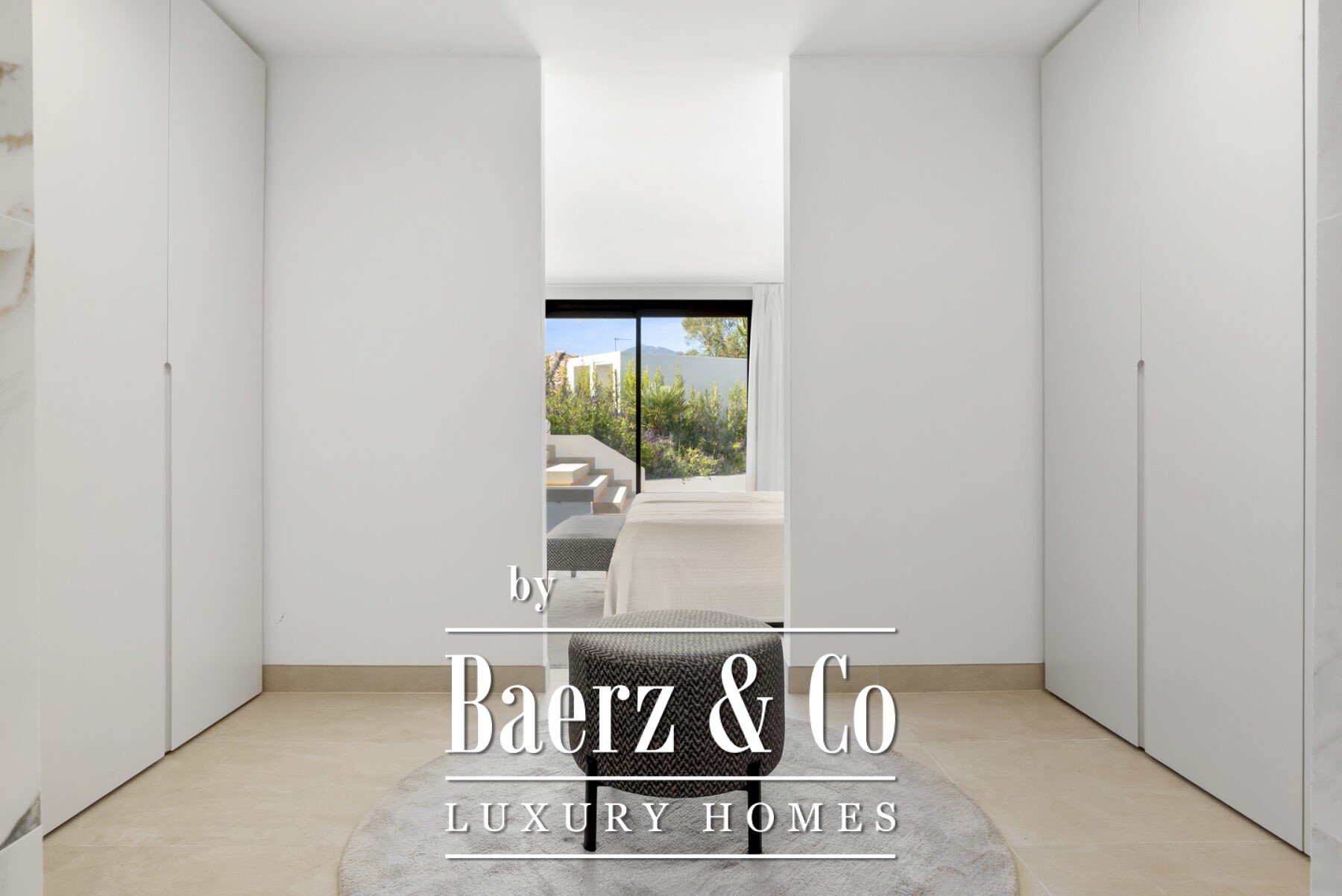 On the rooftop terrace, panoramic views of the sea and mountains invite moments of quiet reflection. Built-in wardrobes include LED illumination, combining practicality with subtle sophistication. The villa offers a garage for one car with a charging point, and additional enclosed parking for up to three further vehicles within the gate.