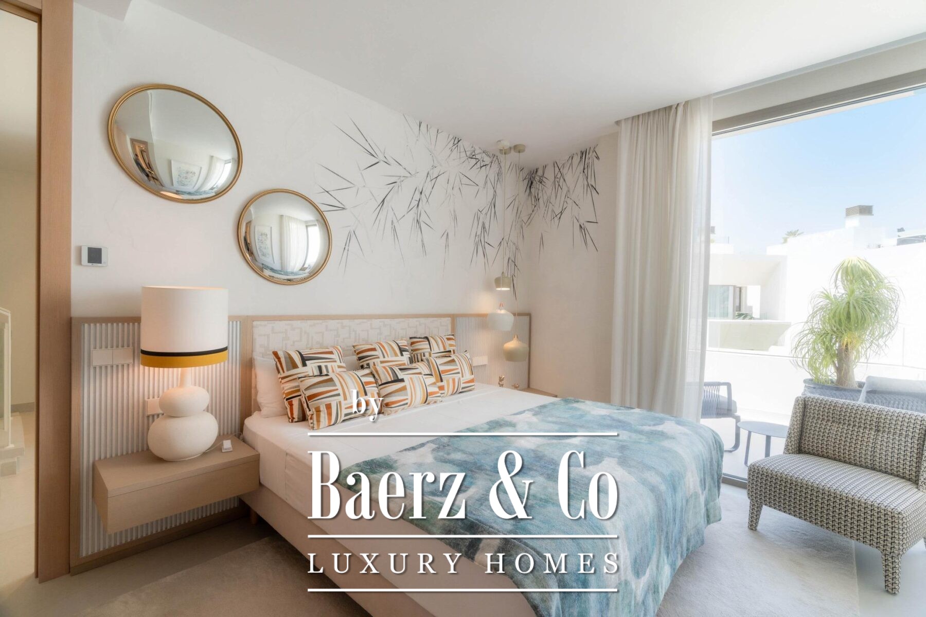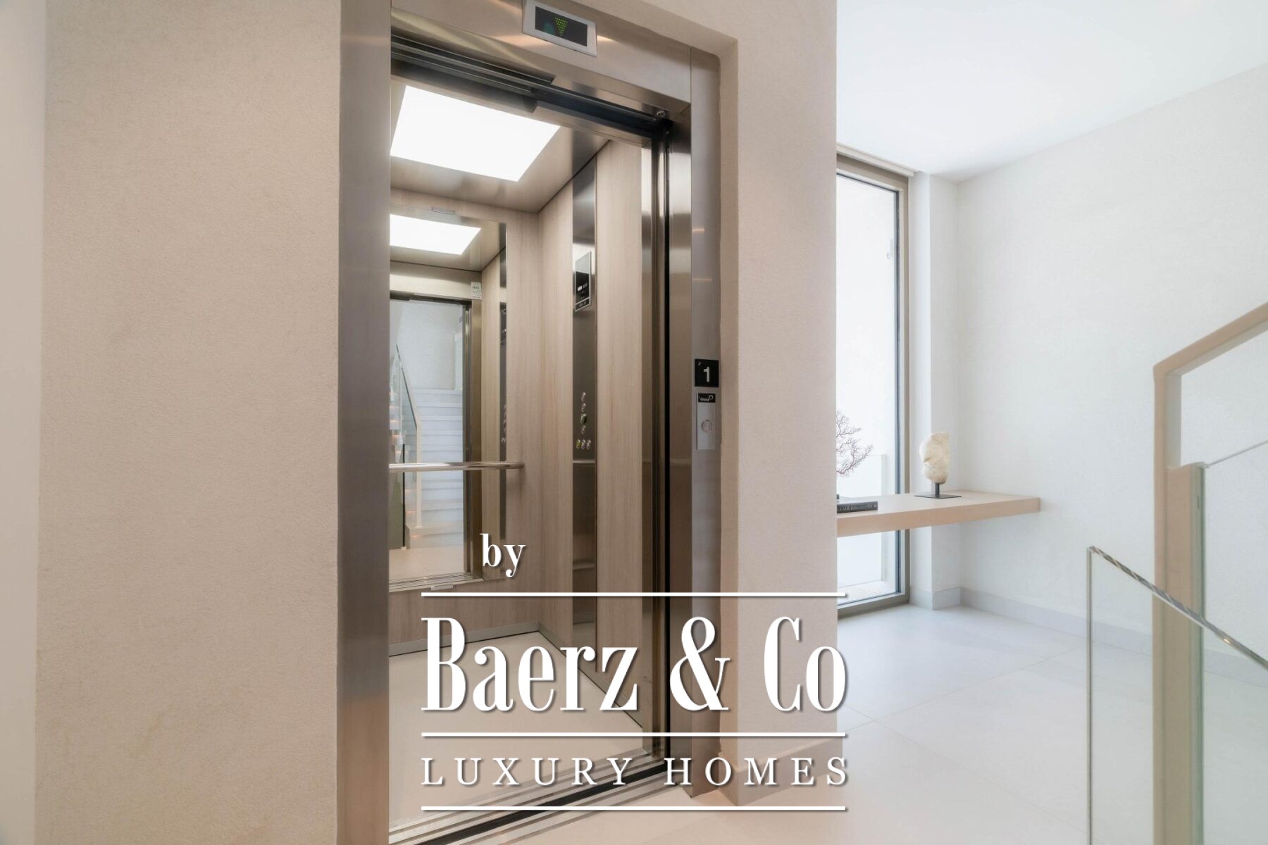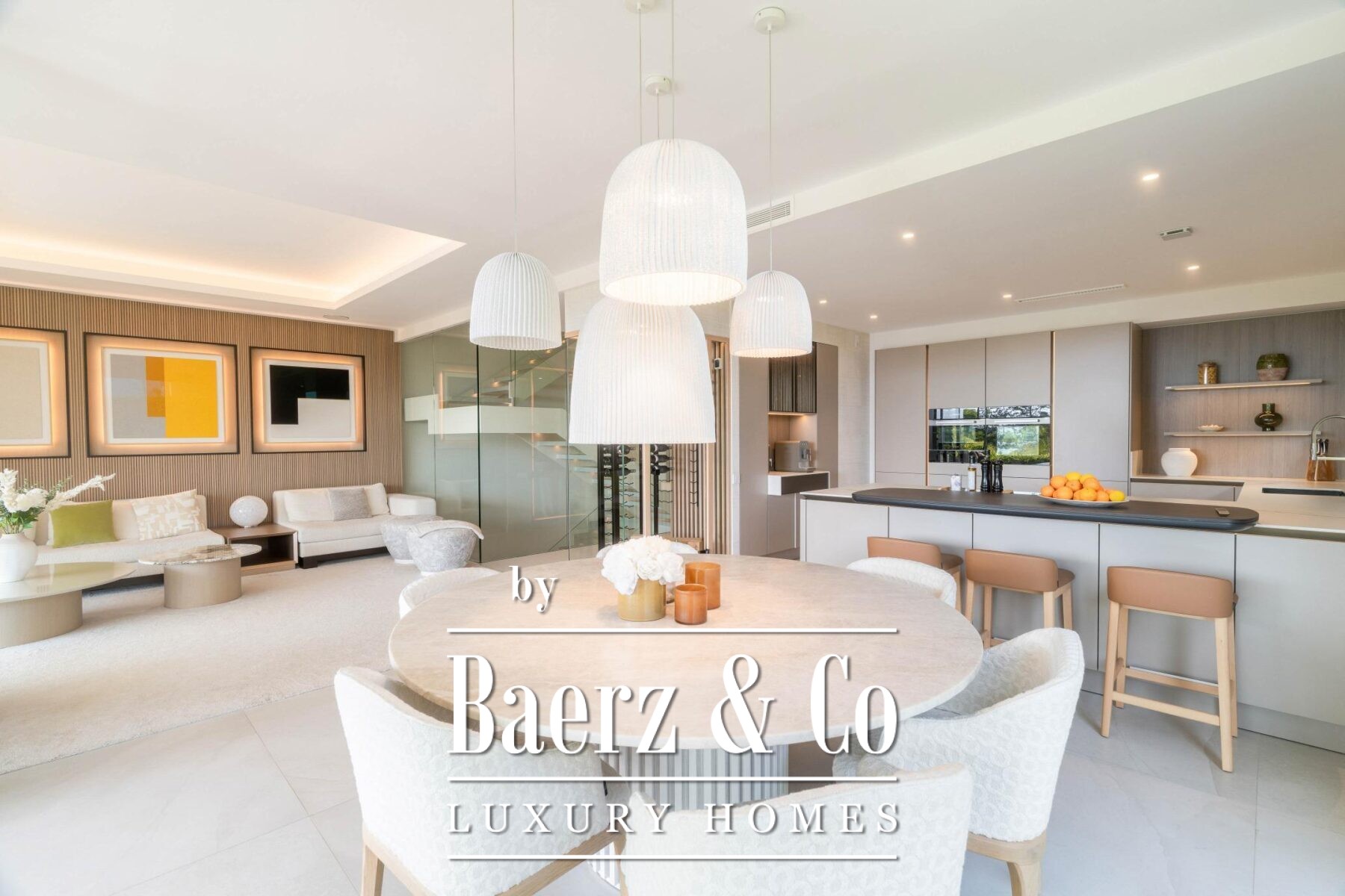 Generous living areas connect to a covered terrace designed for seamless indoor-outdoor living. The custom rooftop solarium, complete with a private plunge pool, opens up panoramic views over the Golf Valley and the iconic La Concha mountain. A private elevator links each of the four levels, allowing effortless access throughout, while the fully equipped Siematic kitchen invites convivial gatherings.