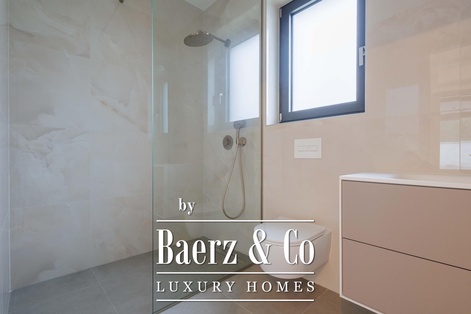 Ascending to the first floor, three bedrooms each come with private bathrooms, while four covered terraces create opportunities for quiet coastal views and privacy. The crowning rooftop terrace of 35 m² offers a secluded space for daytime sun or evenings spent by the sea. Material choices throughout are precise and premium, complemented by air conditioning, underfloor heating, and a heat pump system for year-round comfort. Four parking spaces, including two covered, underscore convenience and discretion.