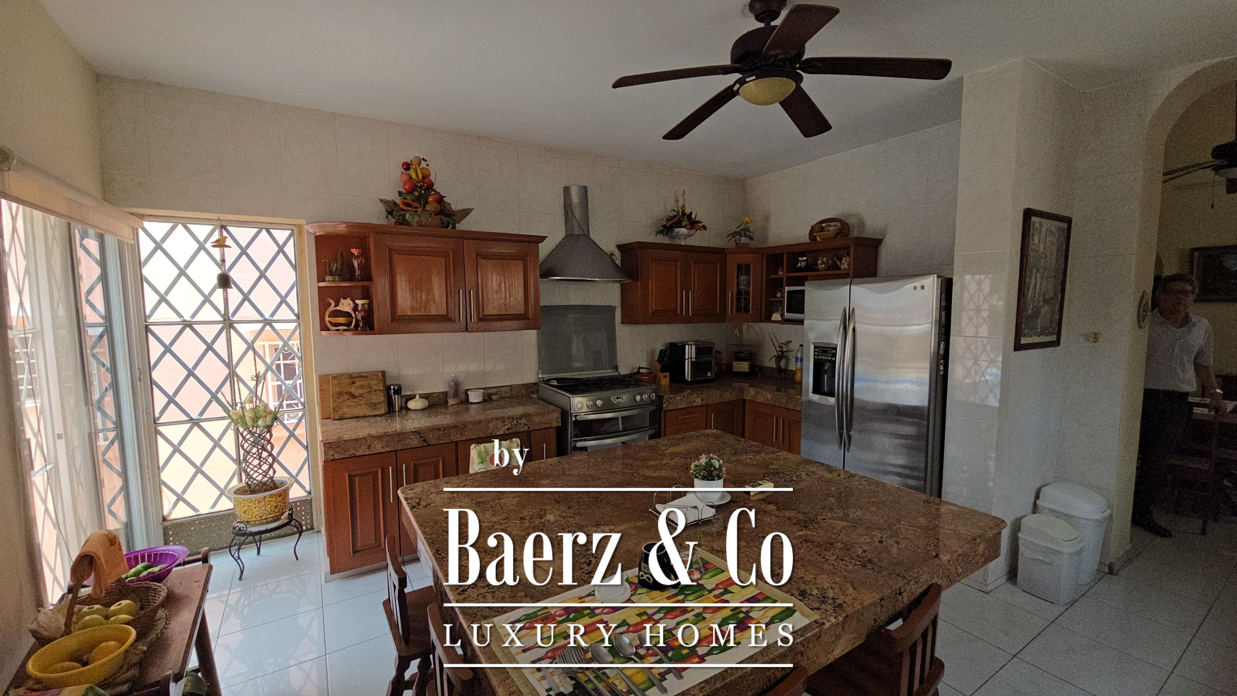 Beyond its grand façade, the residence offers four bedrooms, each with a dedicated bathroom, with the main suite enjoying a walk-in closet. The layout is both classic and accommodating, with a sequence of living and dining rooms, a granite-fitted kitchen, two family rooms, a studio, service quarters with bath, and ample storage and laundry spaces. Wide foyers and a generous porch invite openness, while the private pool and covered garage for four cars enhance everyday luxury. The property integrates contemporary comforts such as hydro system, inverse osmosis, electric gate, and essential connectivity.