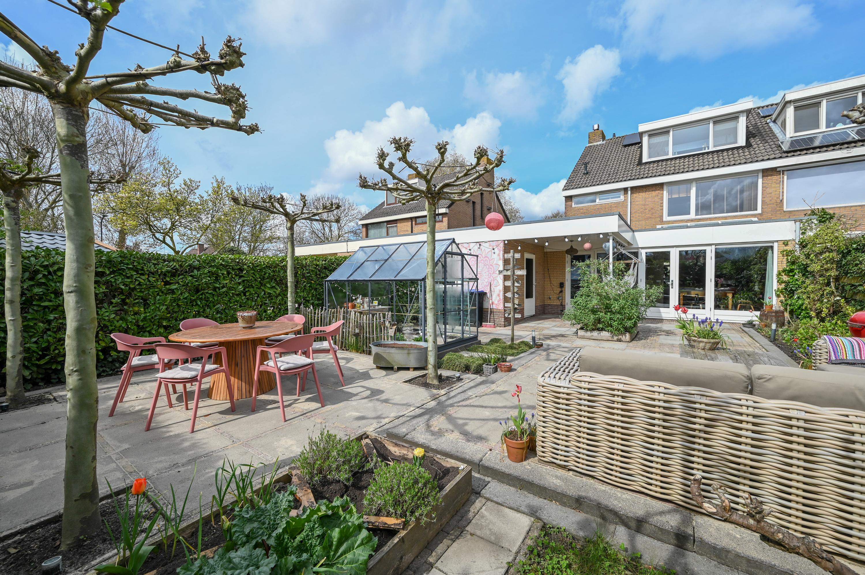 The garden has been thoughtfully landscaped with a mix of terraces, borders, and greenery. A small greenhouse offers space for homegrown produce and hobbies, while fruit trees add a playful and natural character. The layout provides multiple seating areas, each offering a different experience of sun and privacy.