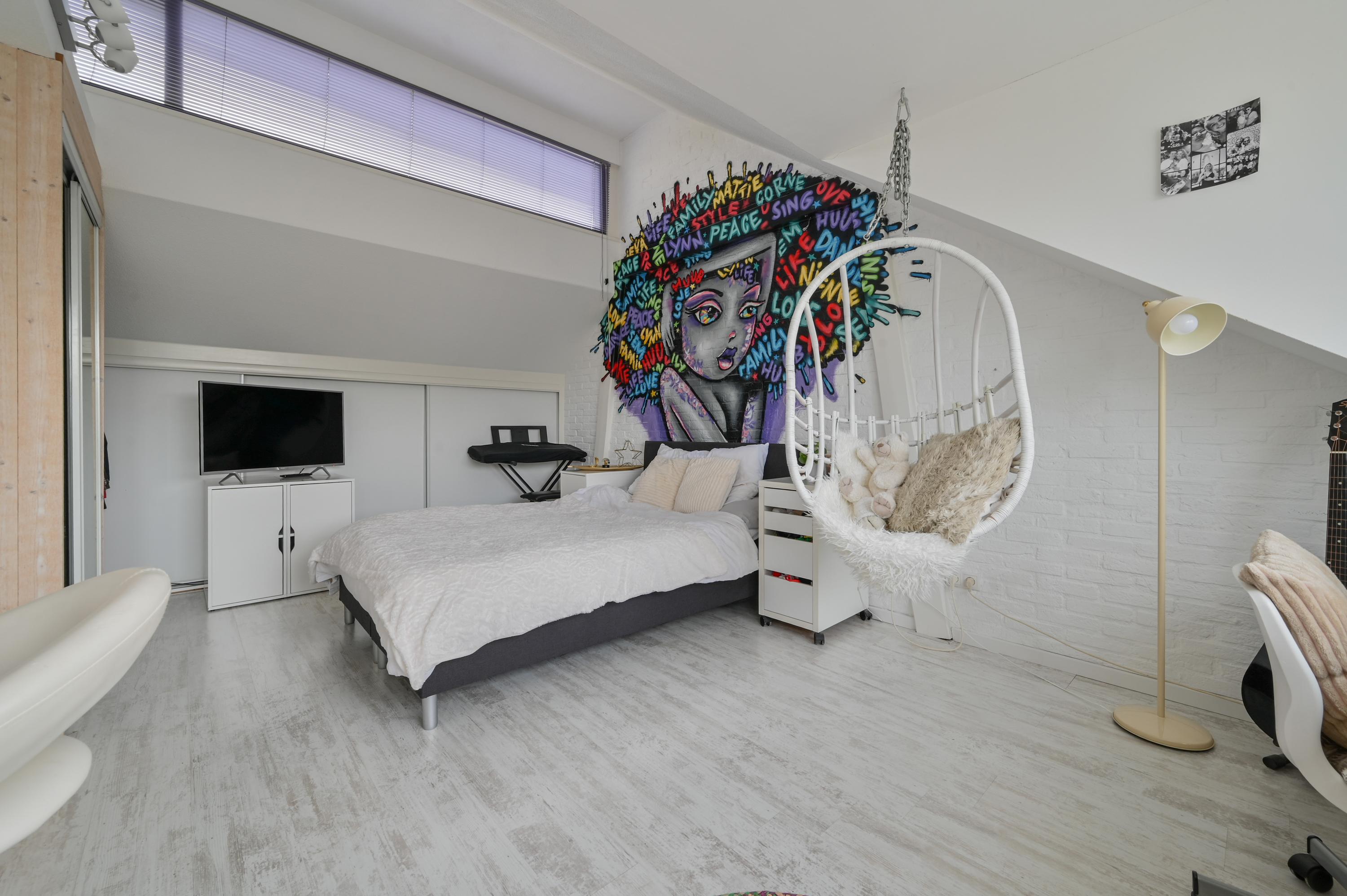 The bedroom on this floor has a playful layout. A high window provides beautiful light, while the dormer adds extra space and comfort. The room also features a built-in mirrored wardrobe and additional storage in the sloped ceiling area. There is also a convenient sink and unobstructed views over the meadows, further enhancing the sense of space and freedom.