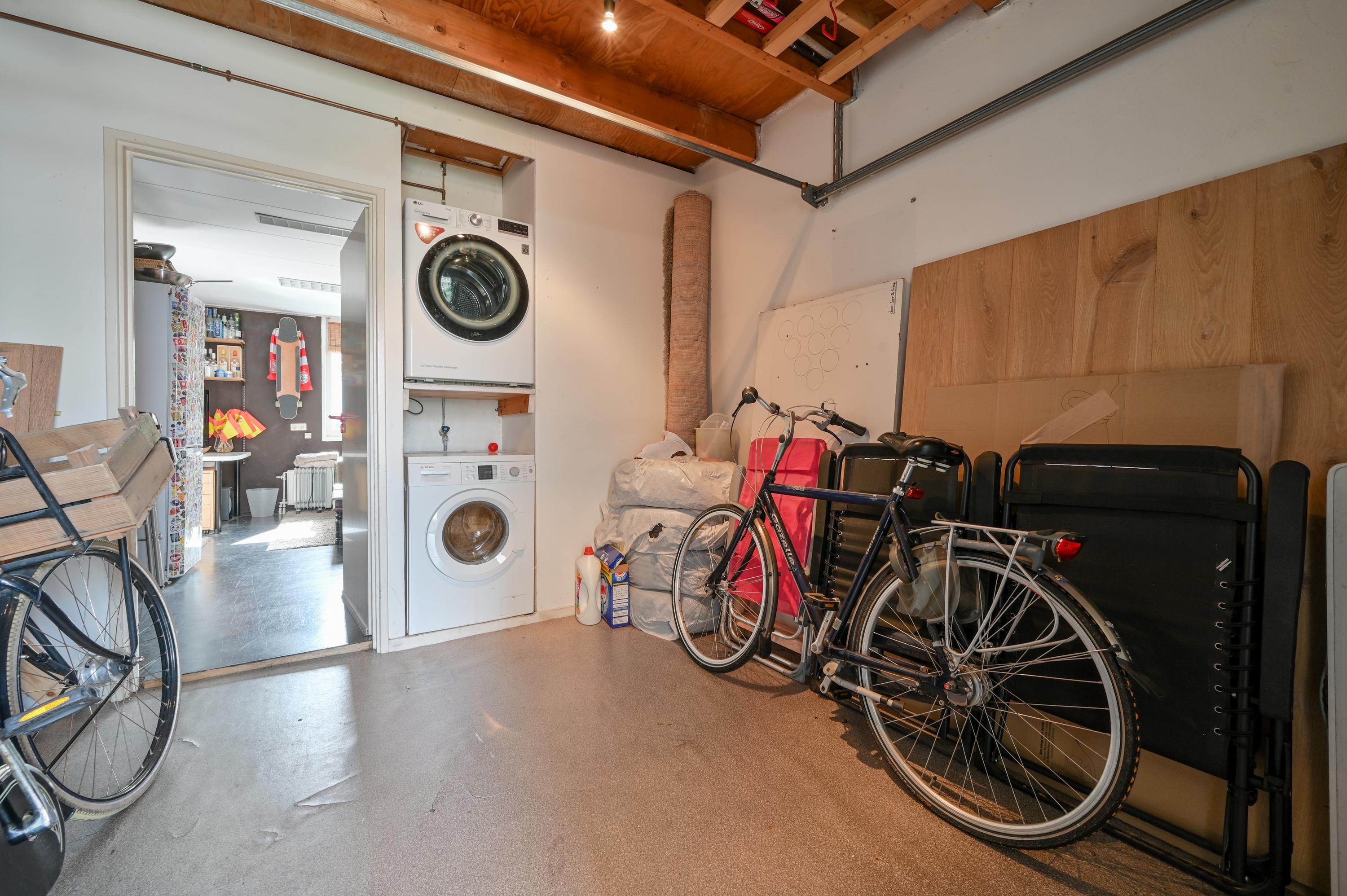 The former garage has been cleverly divided into two functional areas. At the front, there is a practical storage space with washing machine connection and heating — ideal as a utility room or additional storage.