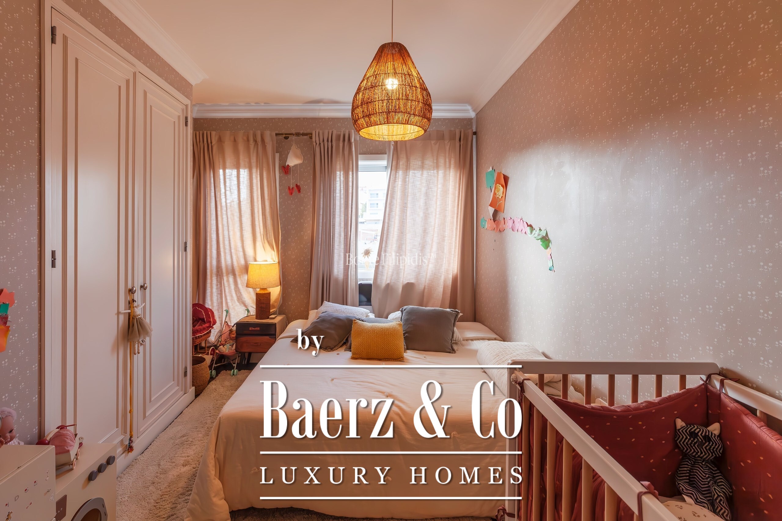 Each of the four bedrooms retains an understated sense of scale, complemented by three full bathrooms. The apartment merges traditional Lisbon elegance—high ceilings, wooden floors, original detailing—with considered modern comfort. The building provides lift access, secure parking, and thoughtful amenities.