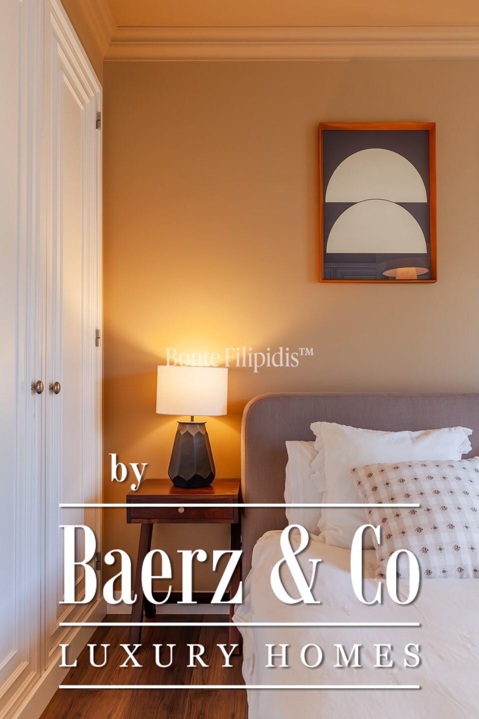 Wide windows in the living and dining room invite serene river views and lead to a spacious balcony, creating a seamless connection between interior and exterior space. A fireplace anchors the room, offering warmth and a gathering point during Lisbon’s cooler evenings. The kitchen is fully equipped with contemporary appliances and an integrated laundry, delivering both function and discretion.