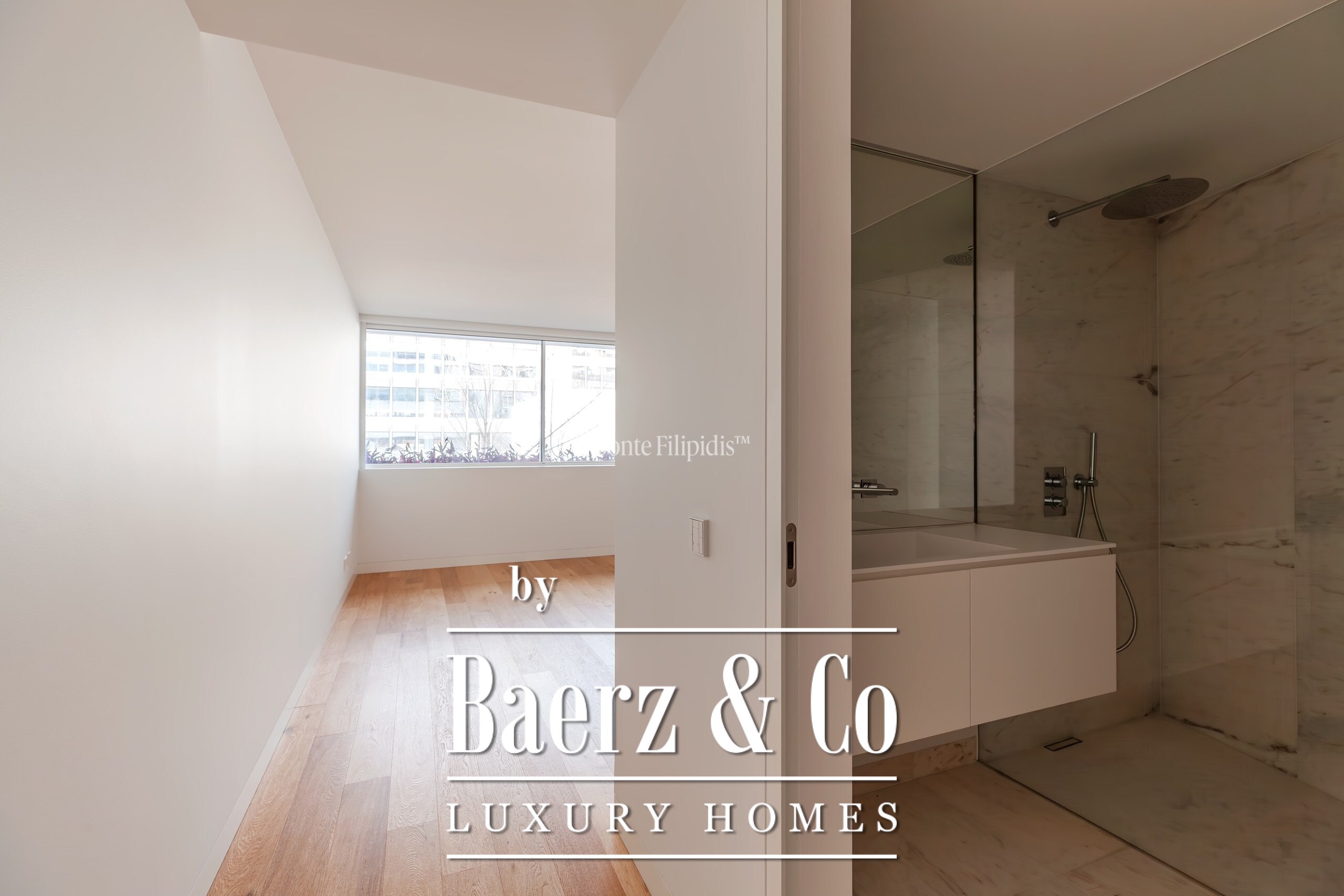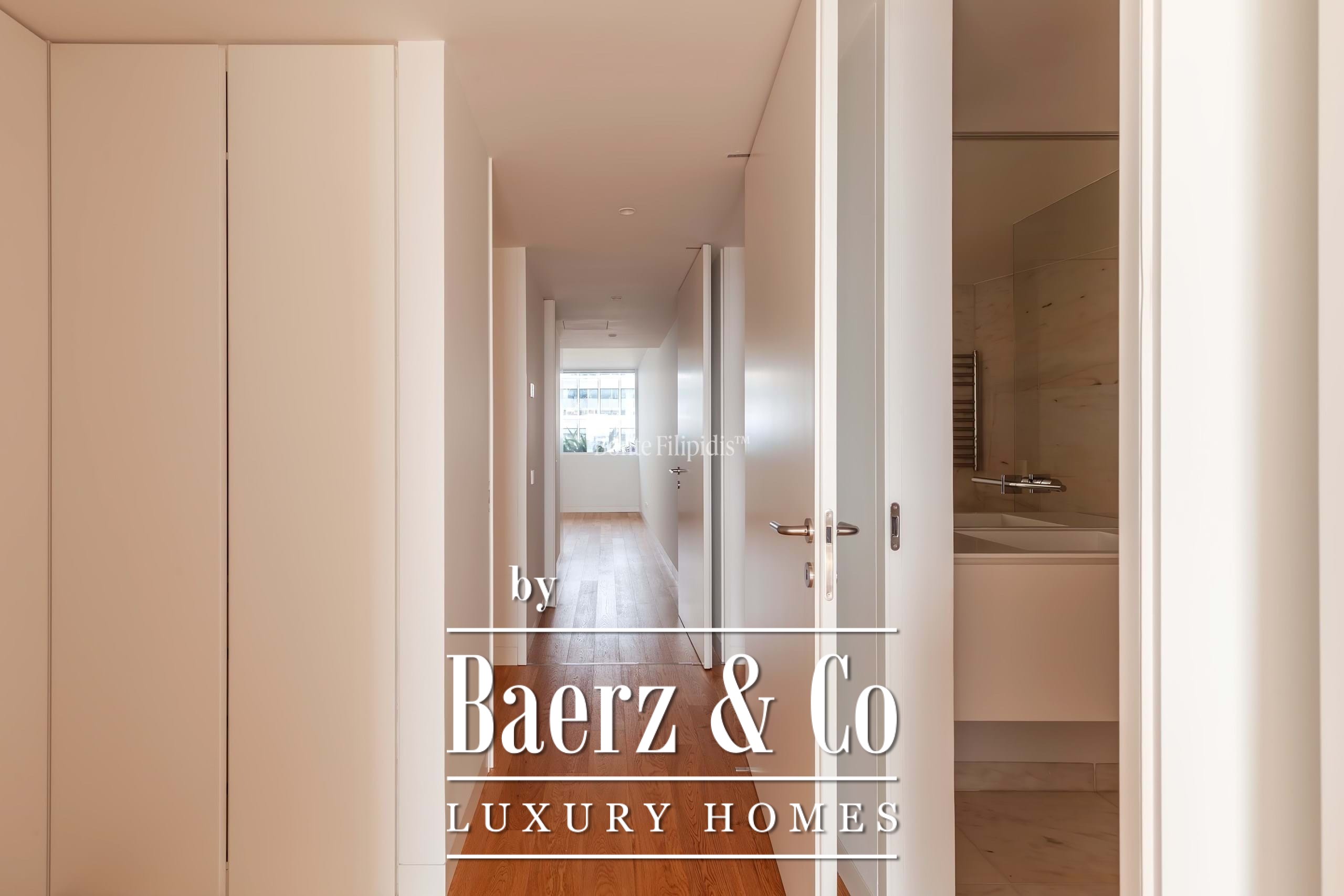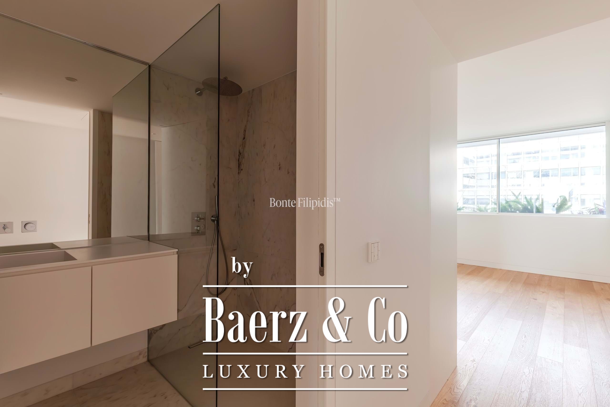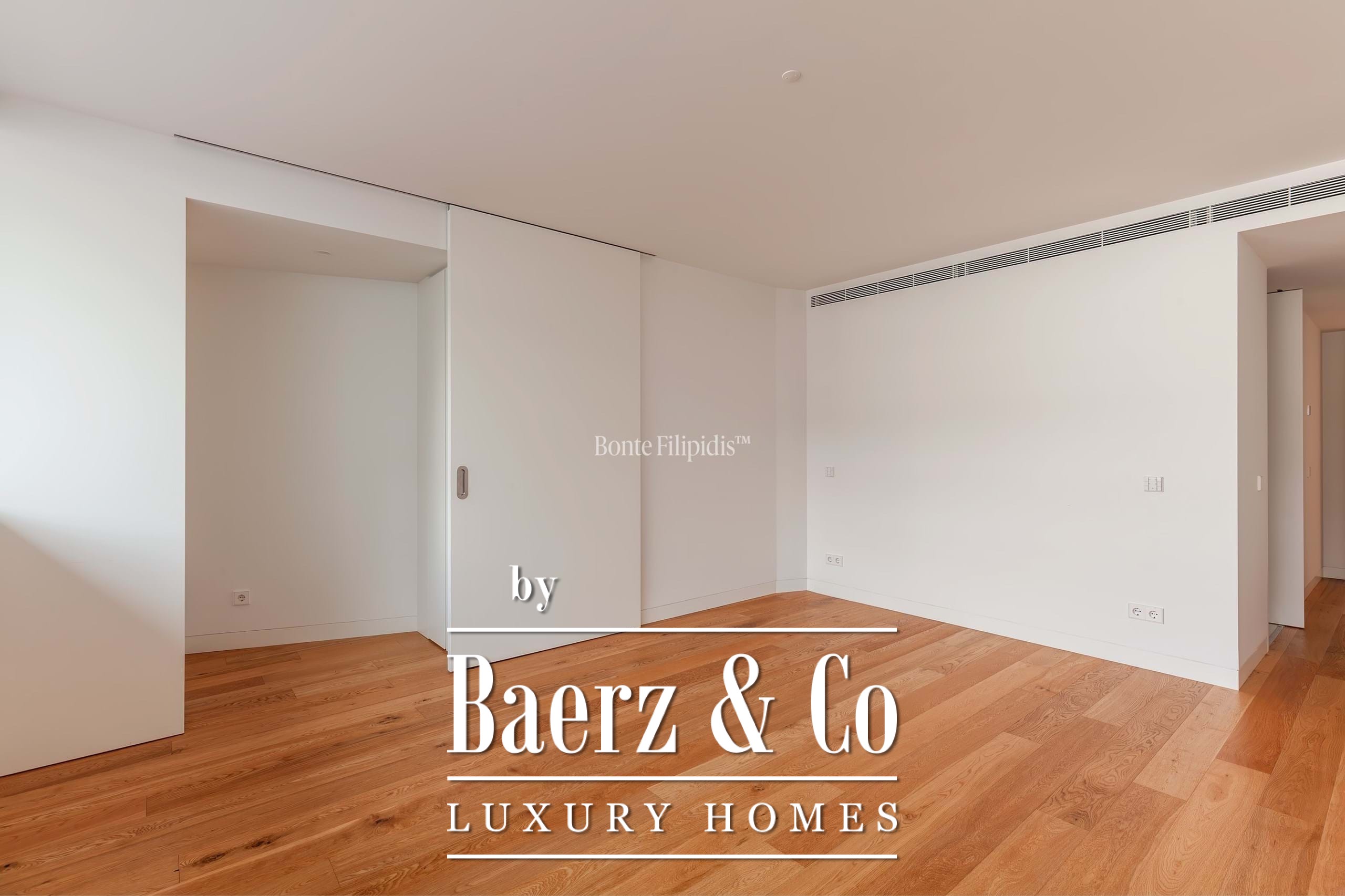 The principal suite is finished with fitted wardrobes and an en suite bath in natural stone. Two additional bedrooms offer generous proportions, wide windows and integrated storage, complemented by a total of three bathrooms. Solid wood flooring, refined cabinetry, and a fully equipped kitchen with high-quality appliances underline a focus on modern comfort.