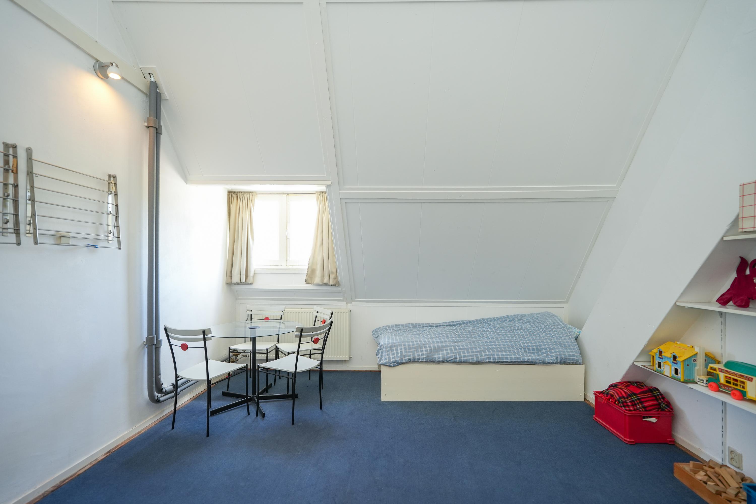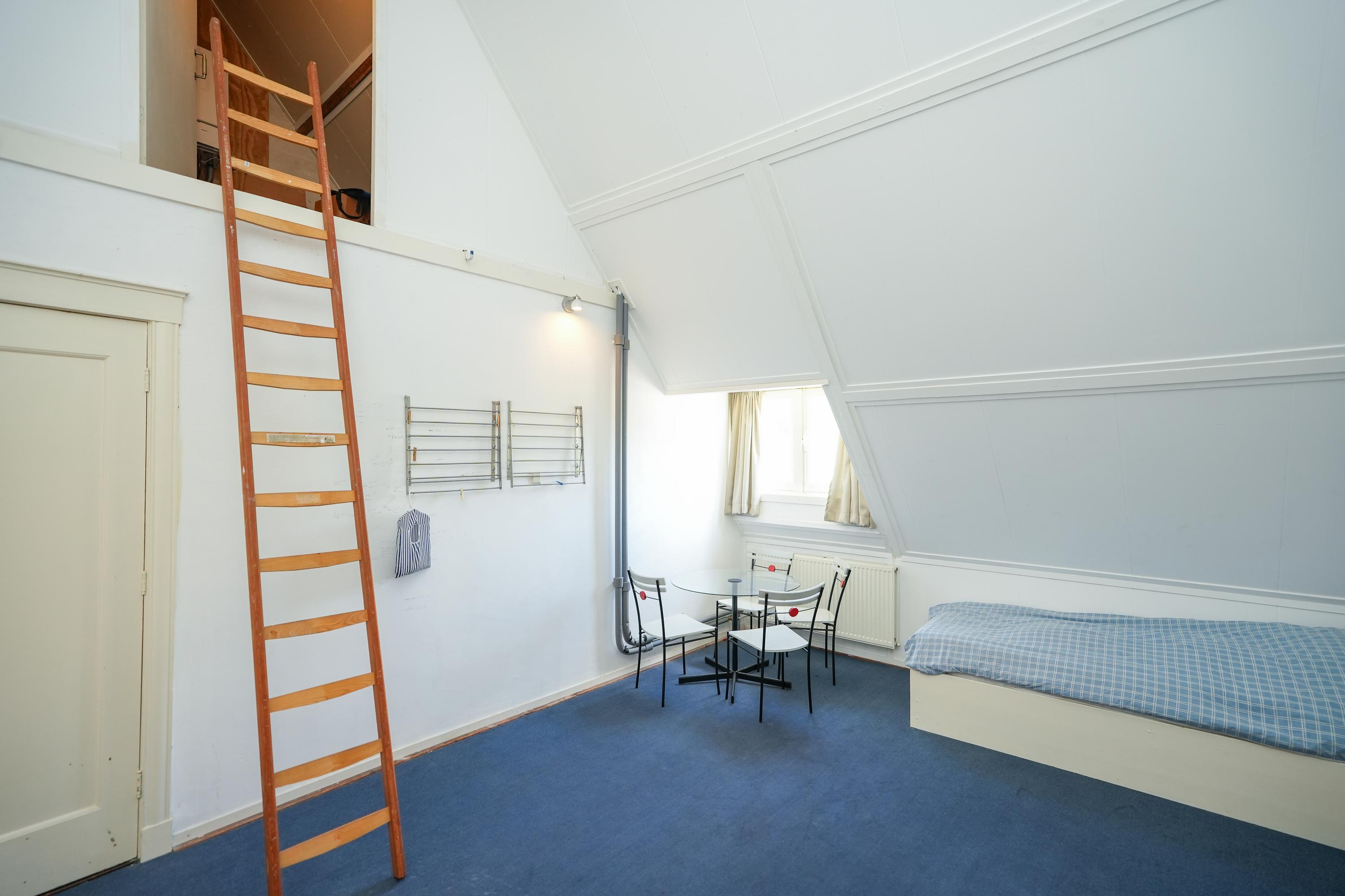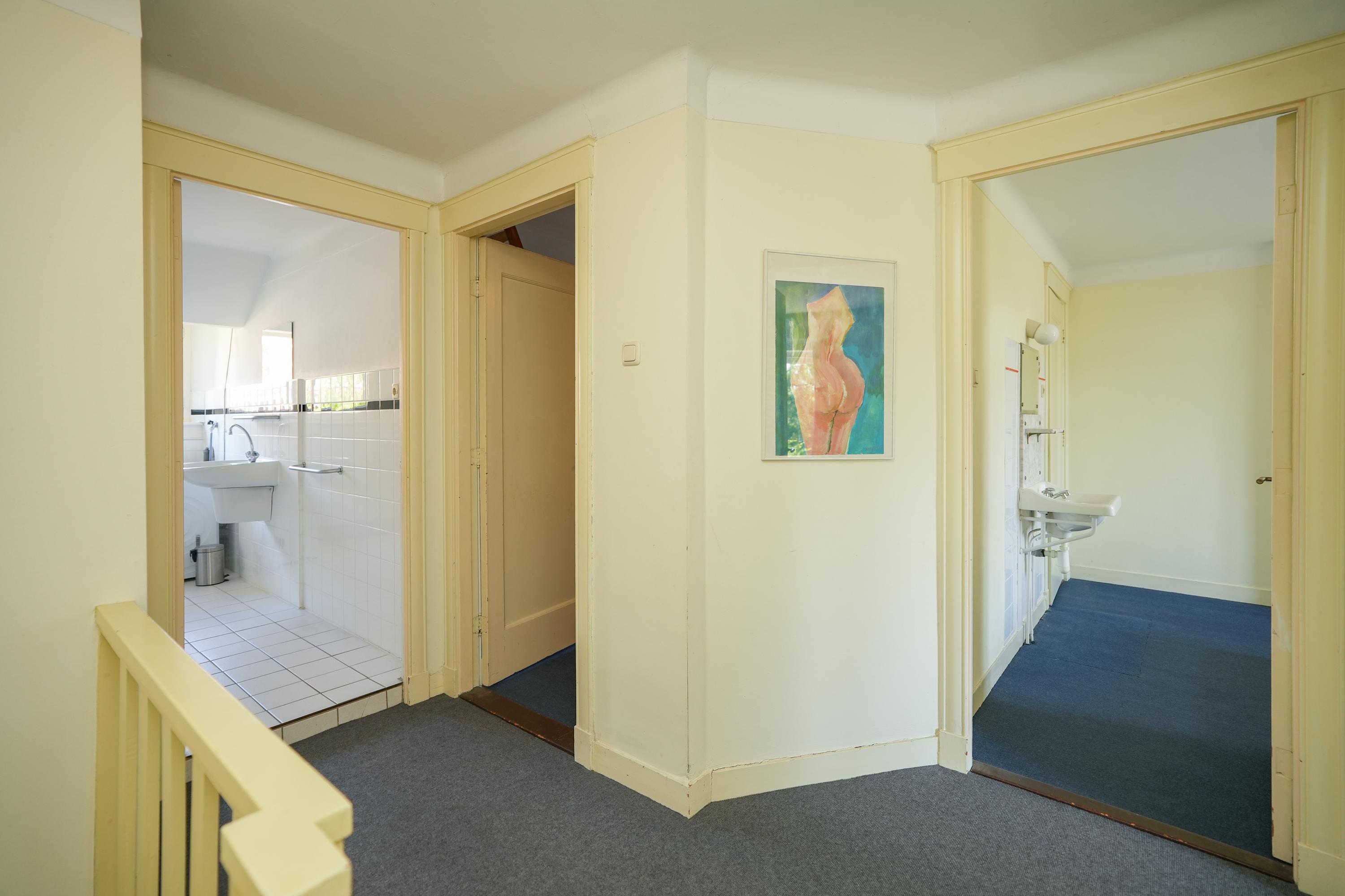 Overloop met bergkast en vaste trap naar de 2e verdieping. Op deze etage bevinden zich drie van de zes slaapkamers. De slaapkamer aan de voorzijde beschikt over vaste kasten en openslaande deuren naar het balkon. De grootste slaapkamer aan de achterzijde is voorzien van vaste kasten, een fraaie schouw en openslaande deuren naar het dakterras, vanwaar je mooi uitkijkt over de groene achtertuin. De derde slaapkamer heeft een praktische kastenwand. De ruime badkamer is uitgerust met een ligbad, een douche en een dubbele wastafel. Daarnaast is er een separaat toilet met fonteintje.