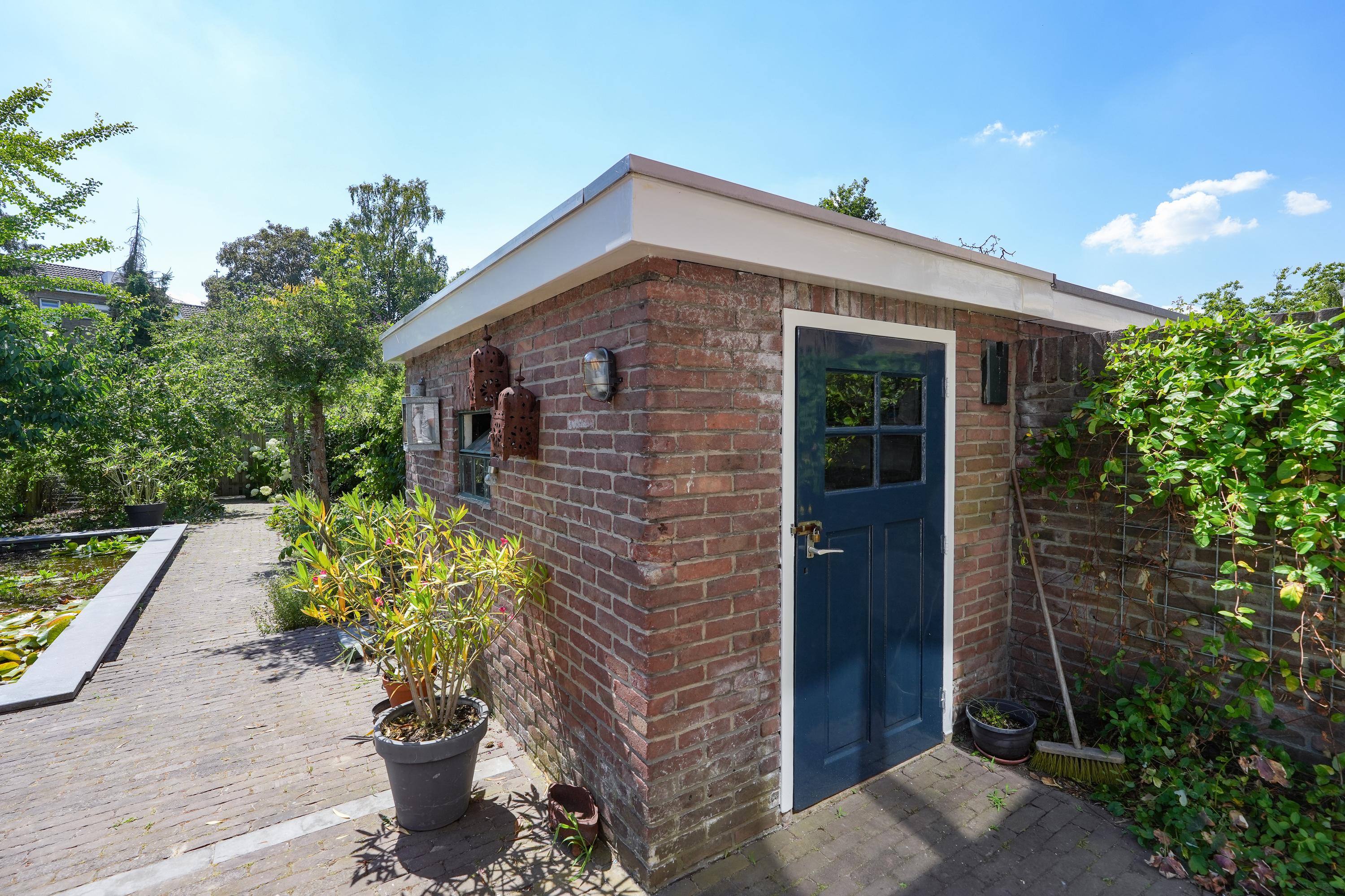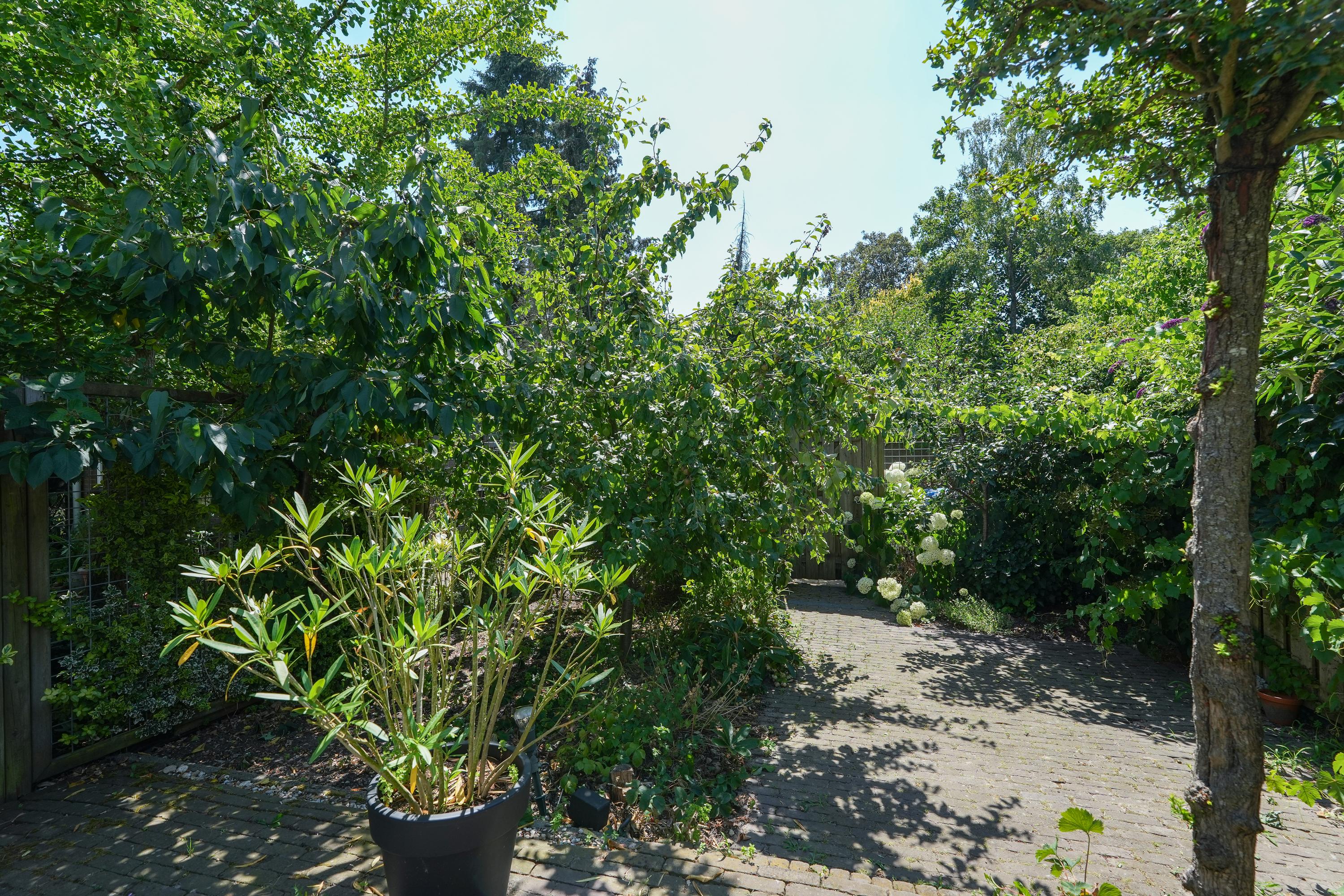 De achtertuin is diep, groen en biedt volop privacy. Dankzij de ligging op het zuidwesten is het een fijne plek om van de zon te genieten. Een moderne, langwerpige vijver voegt een stijlvol element toe aan het geheel. De tuin beschikt verder over een stenen berging en is bereikbaar via een achterom.