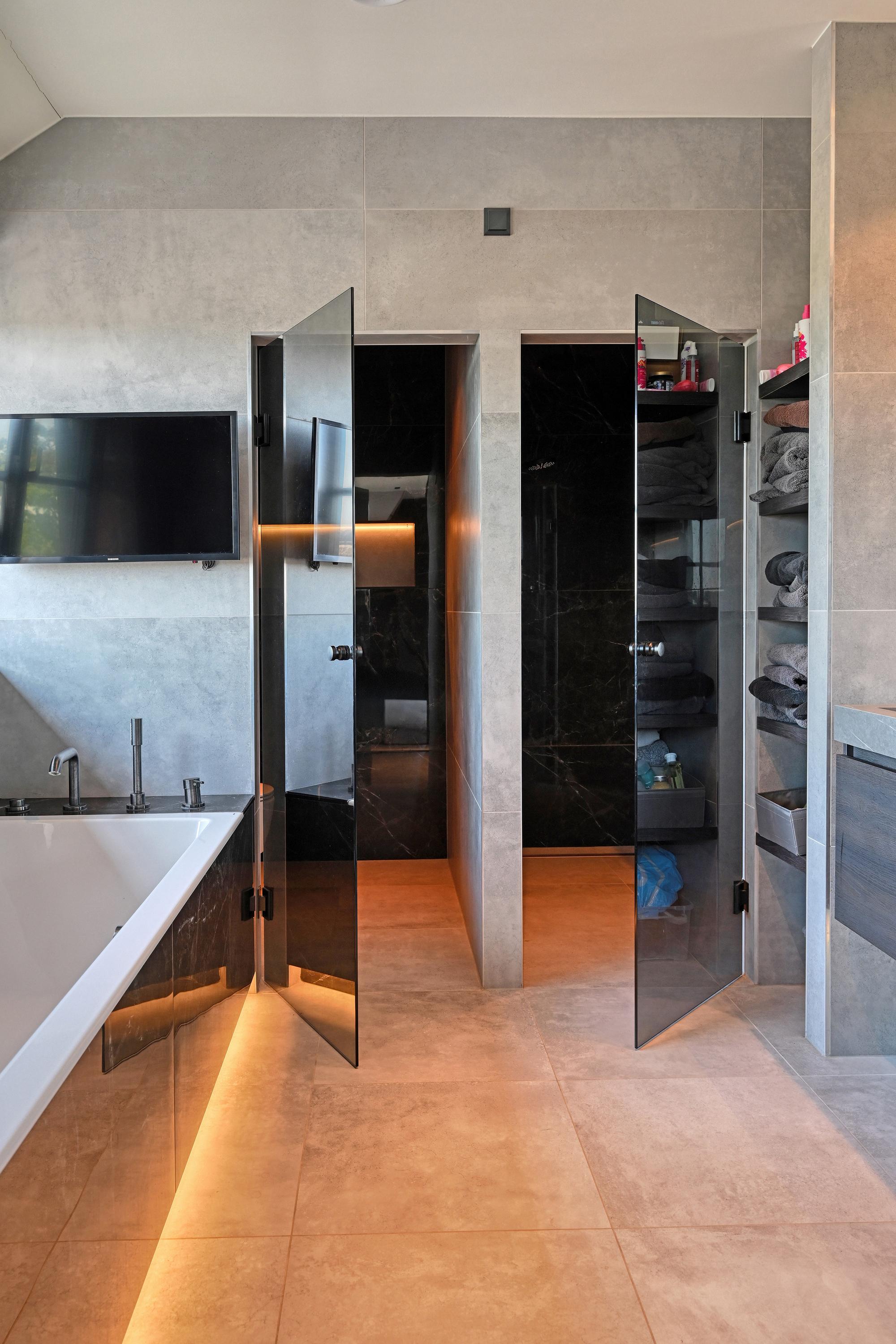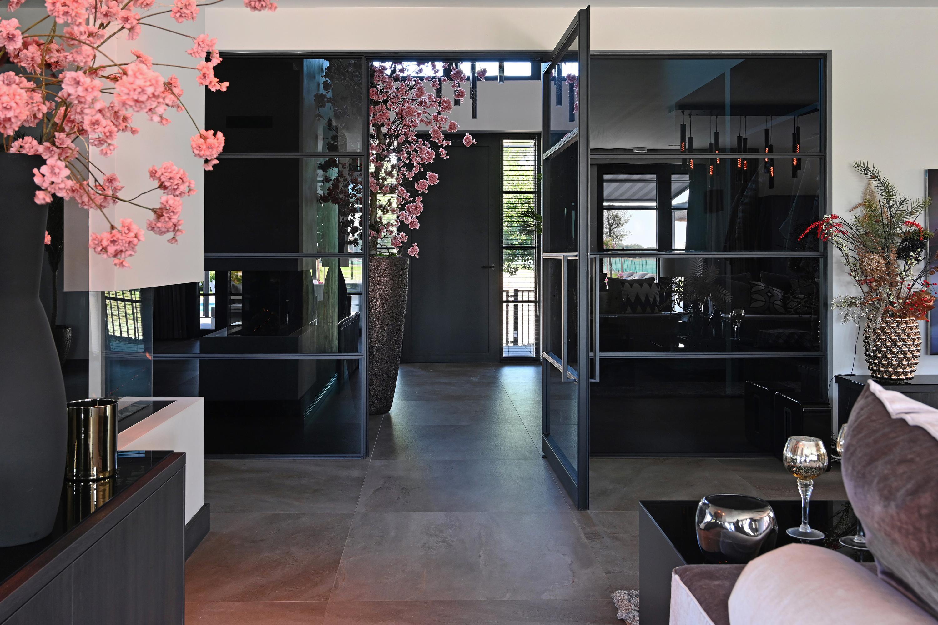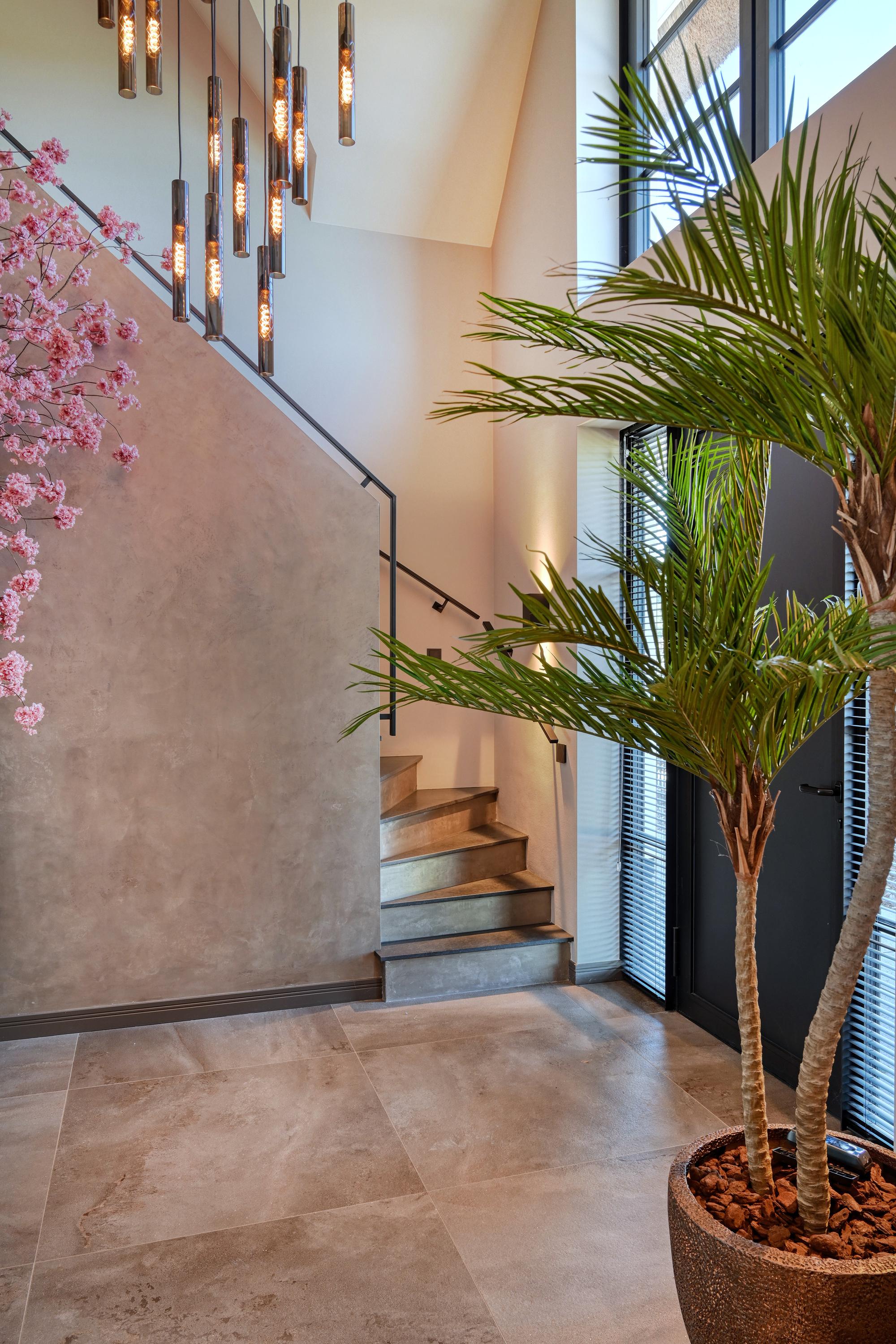 Upon entering, you’ll find a spacious entryway with a loft and a beautiful staircase; it immediately becomes clear that this villa was designed with a sense of space and elegance. Steel doors with smoked glass provide access to the living room.