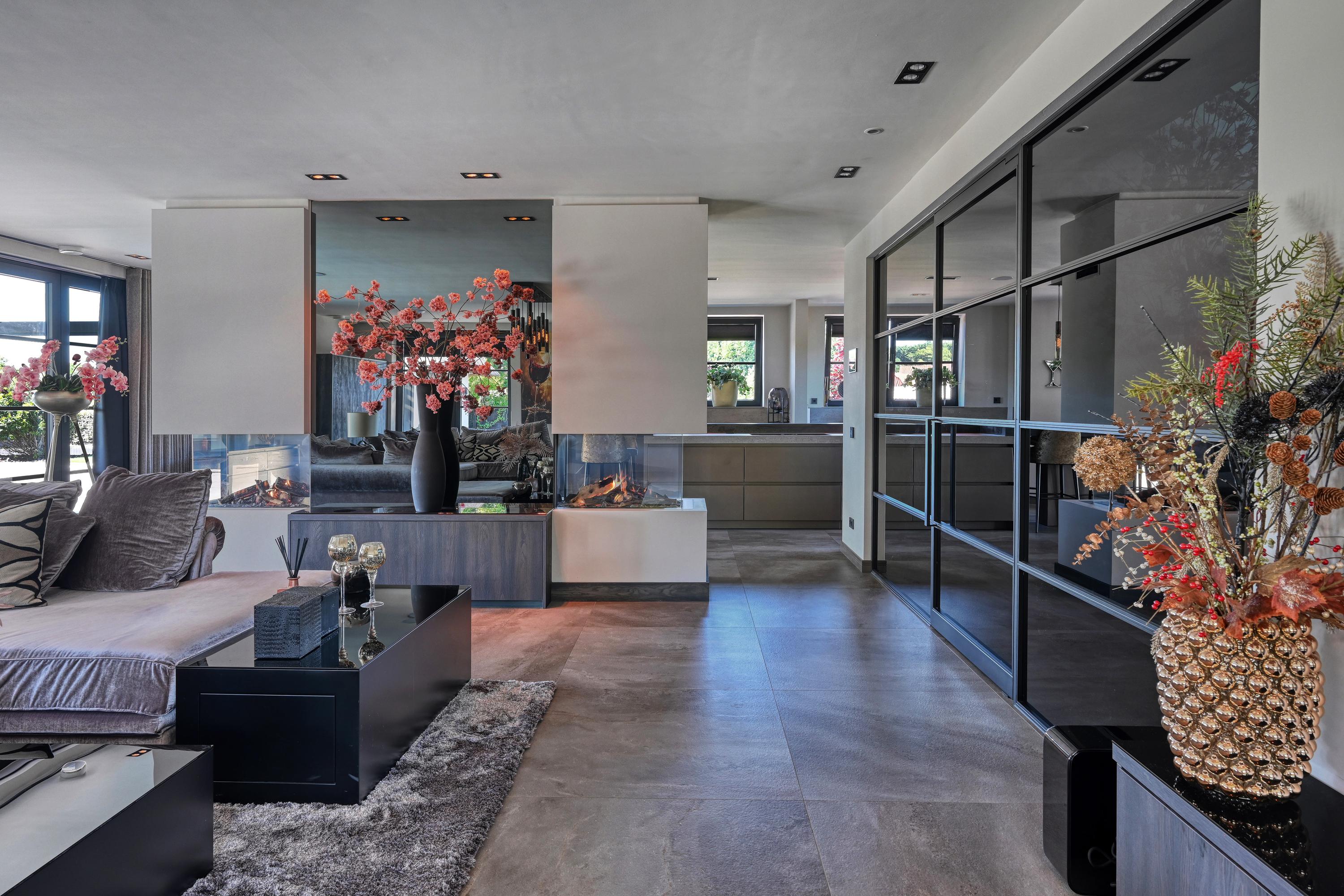 The spacious living room, featuring a room divider with two gas fireplaces, has a warm and inviting atmosphere and direct access to the garden.