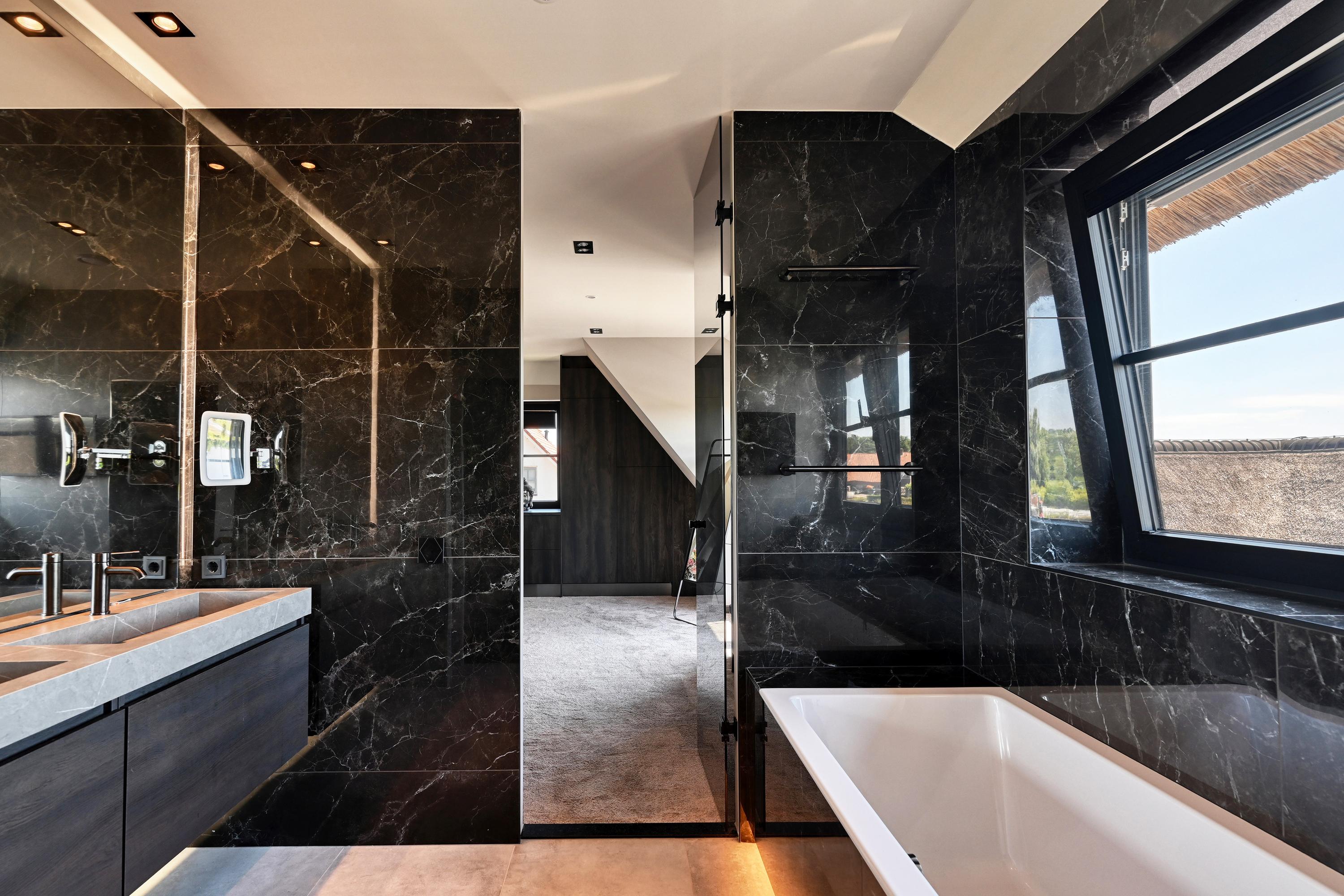 The first floor features two spacious bedrooms and two luxurious bathrooms, both exuding the same warm ambiance but offering varying views of bulb fields and dunes. The master bedroom has its own elegant walk-in closet, leading directly to an en-suite bathroom equipped with a bathtub, a luxurious double vanity, a shower, and a separate toilet.
