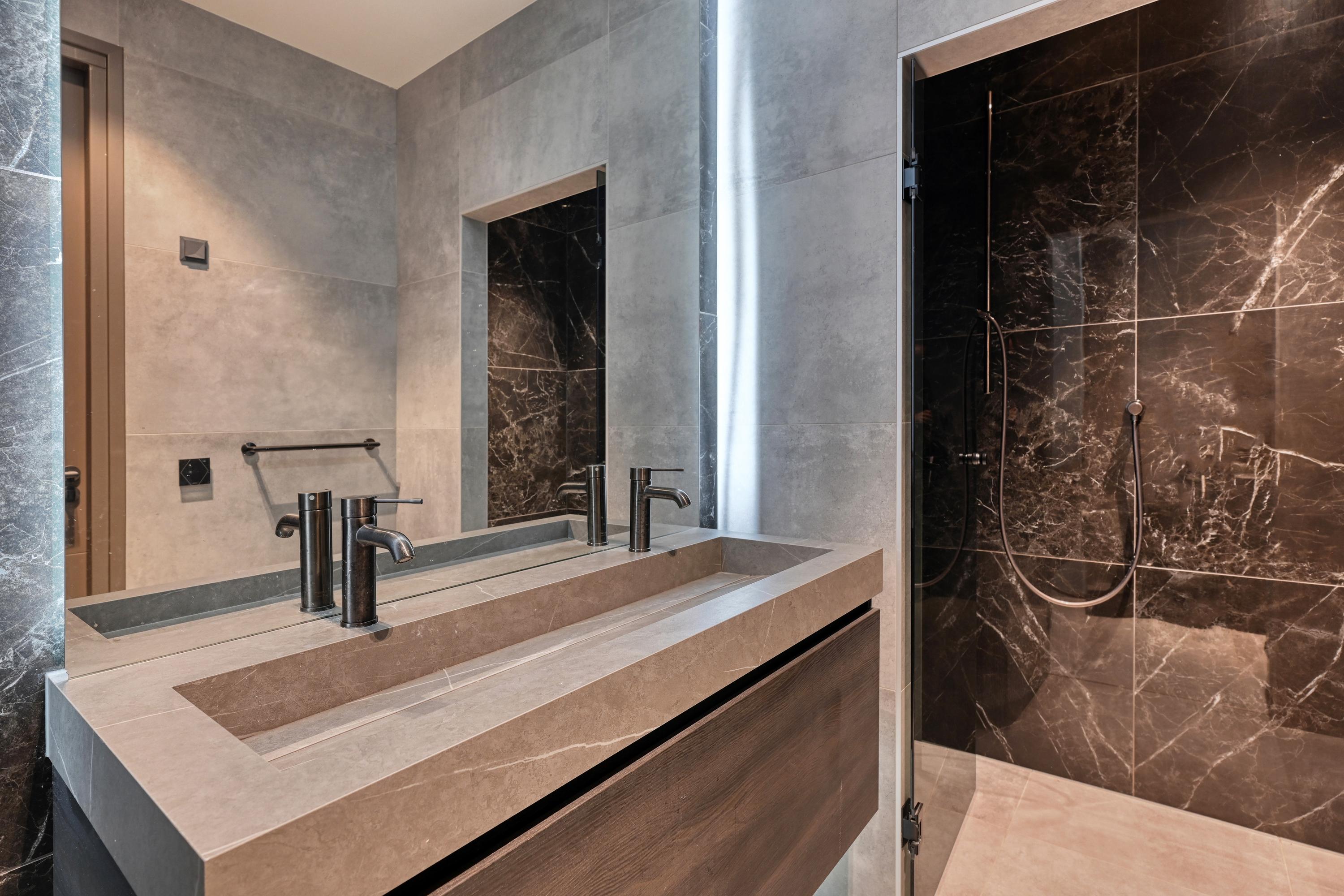 The adjacent kitchen is very generously laid out with a large cooking island and a long breakfast bar, creating a lovely spot for socializing. Equipped with professional appliances such as two refrigerators/freezers, two ovens, two combination microwave/ovens, a spacious induction cooktop with an integrated Bora exhaust system, two dishwashers, and a Quooker for boiling, purified, and sparkling water, this kitchen is truly equipped with every convenience.