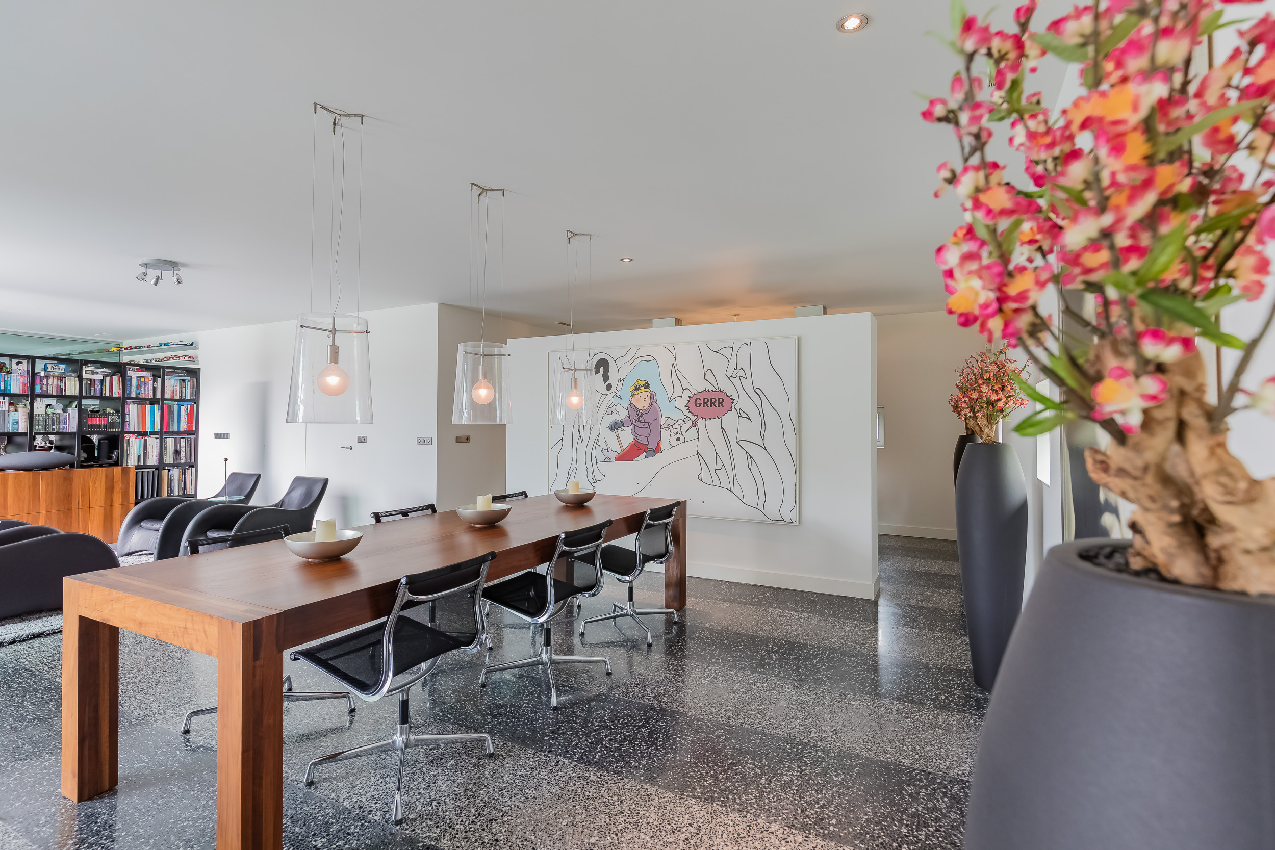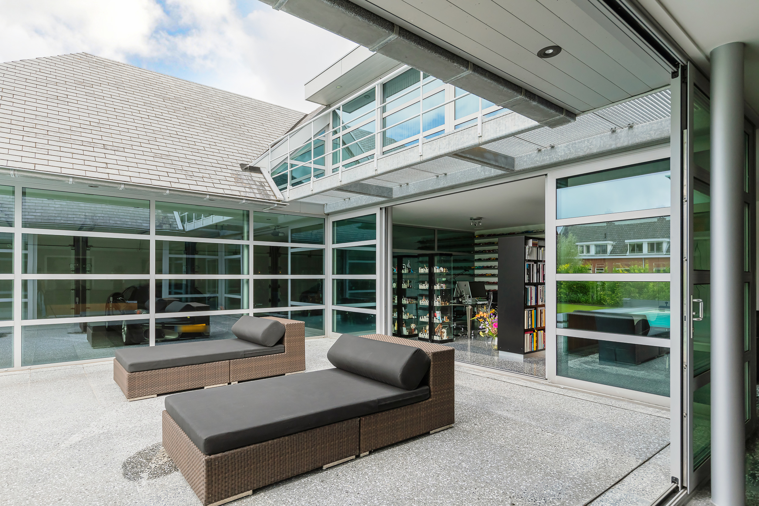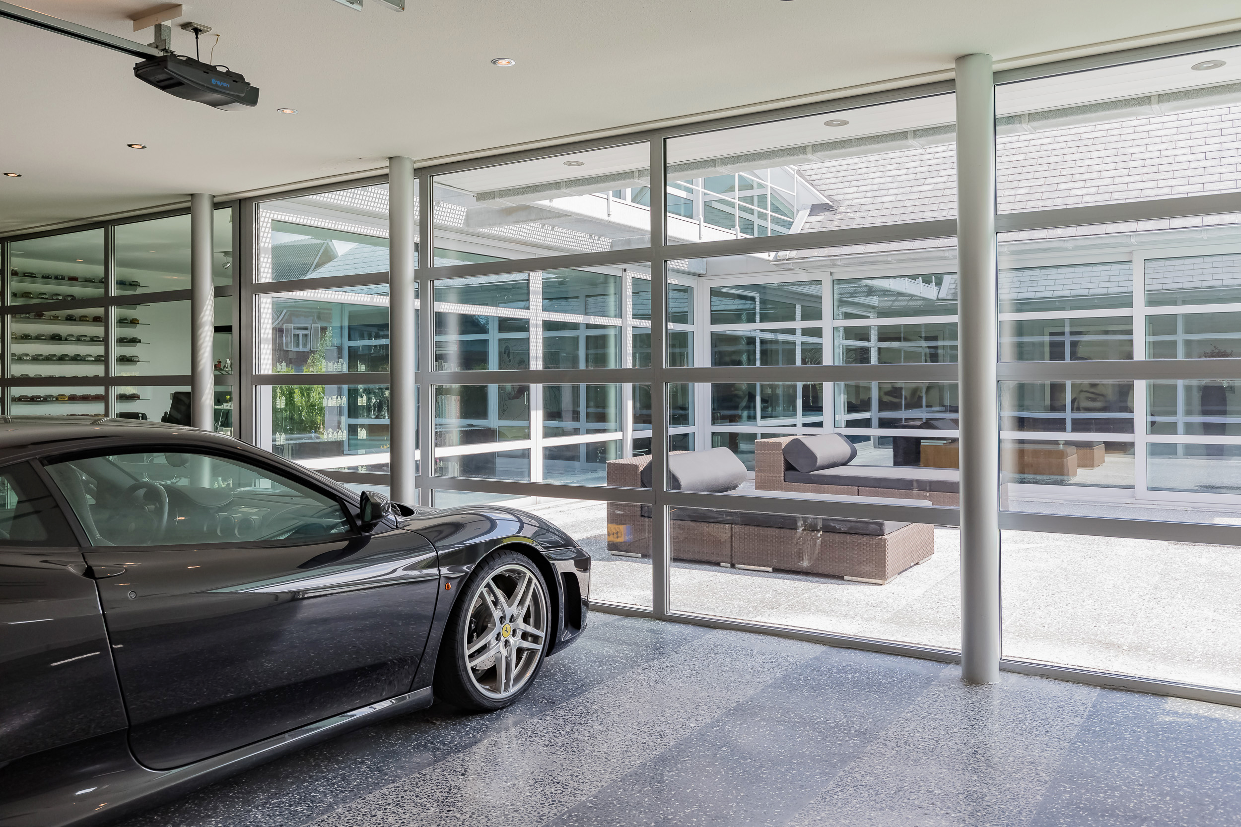 The indoor garage of 76 m2 is fully insulated and also here the terrazzo floor has floor heating. The glass inner wall is easily removed so that the entire first floor becomes one space. The living area thus comes to 356m2 (€ 7.008,43 m2)