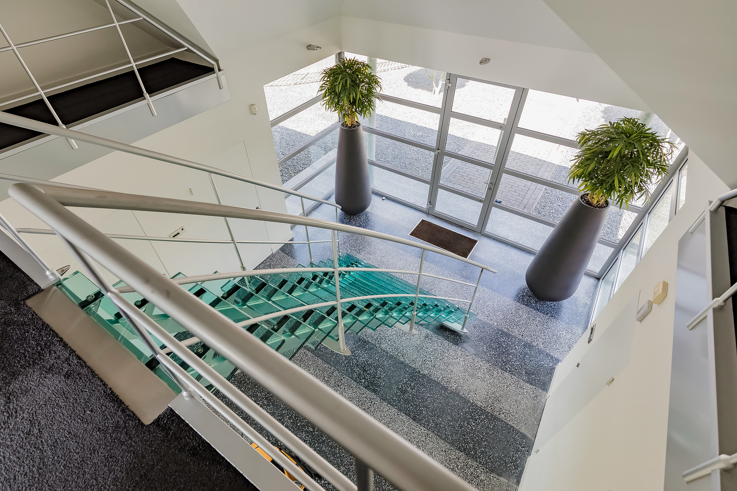Large bright hall with loft and the impressive glass staircase to the top. The hall has tinted glass so there is no view from outside to the inside.