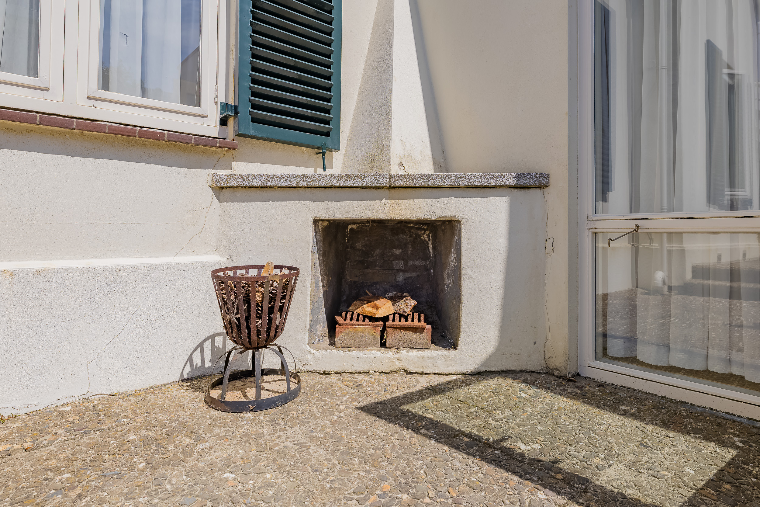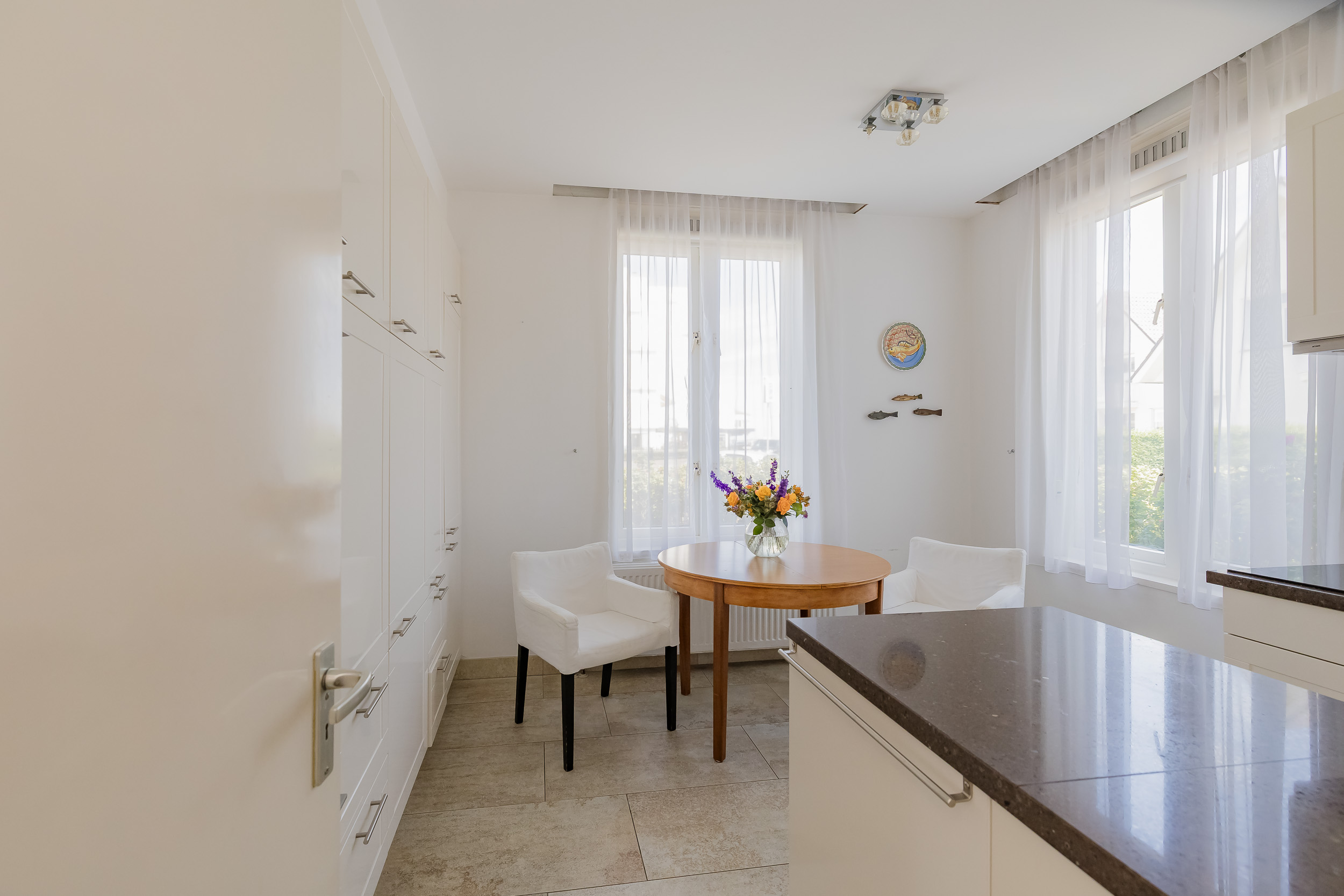 The kitchen, equipped with built-in appliances, is practically furnished with plenty of cupboard space. Furthermore, on the ground floor, you will find a bright second living room with a gas fireplace, ideal for relaxation or as a spacious study. In addition, the ground floor has a comfortable bedroom with a built-in wardrobe. The spacious, sunny south-facing terrace is accessible from both living rooms. The bathroom in the hall is ideal for rinsing off the sand after a day at the beach.