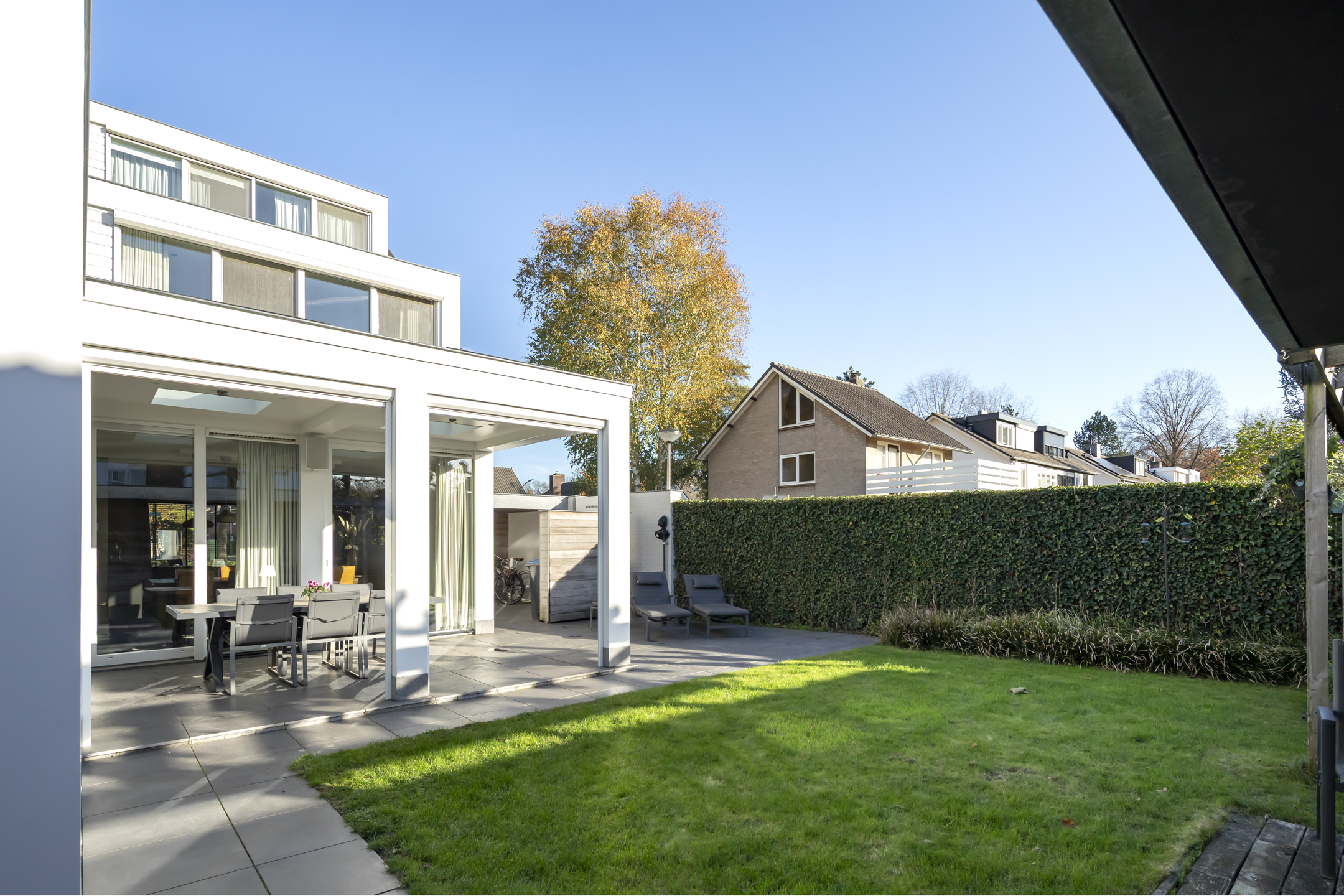 A lovely garden, facing the sunny southwest. You can enjoy the sun here year-round, both under the spacious covered terrace and in the lovely garden. The covered terrace is essentially an extra garden room, equipped with eight electrically operated Velux flat glass skylights, built-in speakers, and electrically operated screens, providing complete shelter from the wind. The covered area, adjacent to the house, is approximately 25 m².