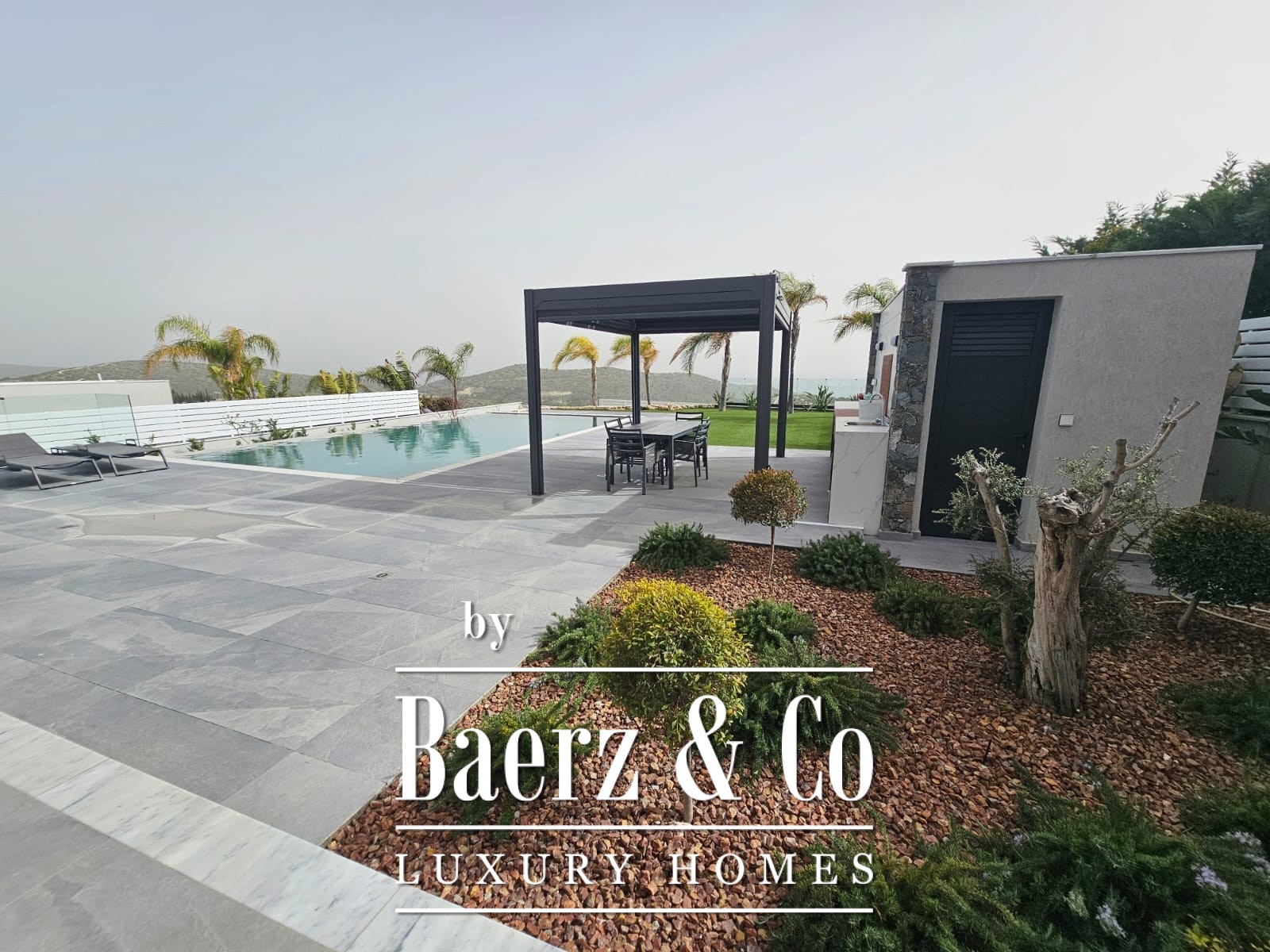 Outdoors, the landscaped garden frames a private swimming pool and BBQ area, complemented by a poolside shower and toilet. Eight parking spaces, ample storage, a security door, and a dedicated service room complete the offering. This villa defines high-end living for those drawn to the unique panorama and tranquility of Parekklisia.