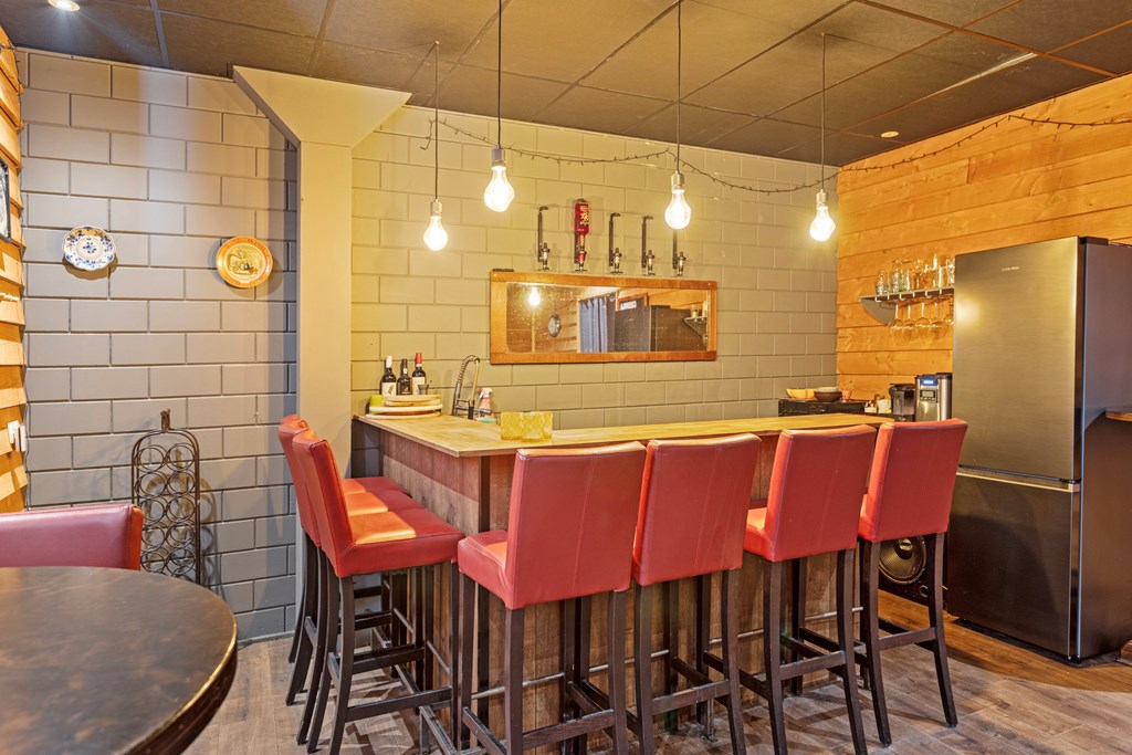 Aangrenzend ligt de royale garage, bereikbaar via een elektrische overheaddeur, met ruimte voor meerdere auto's. Achterin de garage bevinden zich een praktisch keukenblok en een toiletruimte met fontein.