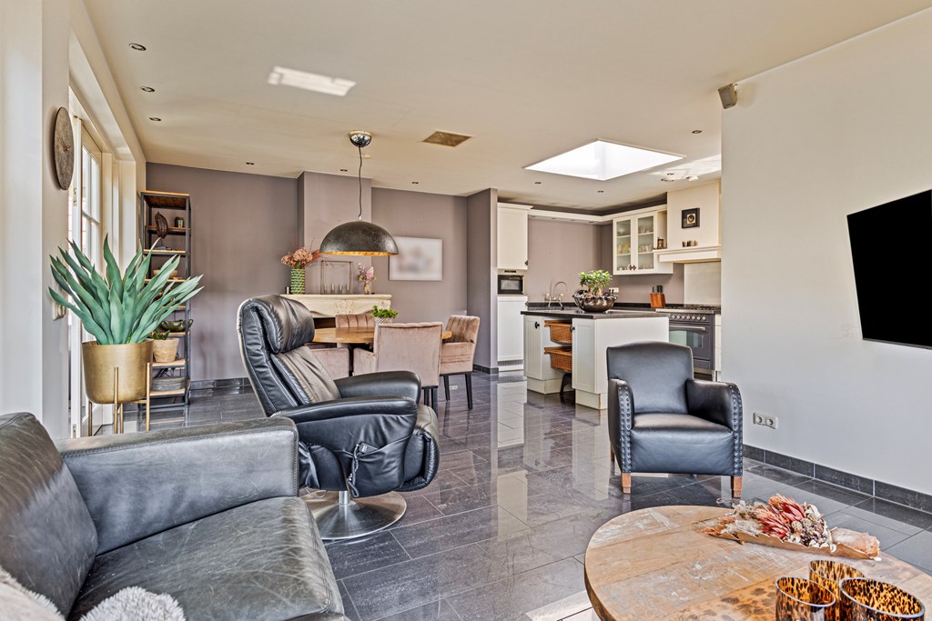 Op de eerste verdieping komt u via de trap of de geplaatste lift in de hal. Door de hal kom je bij de riante living met open keuken die is voorzien van een stijlvolle natuurstenen vloer. Het kookeiland in de keuken biedt meer dan voldoende werkruimte en geeft een fraai uitzicht op de eethoek. De open keuken is voorzien van een modern kookeiland en uitgerust met luxe apparatuur, waaronder een Boretti gasfornuis.