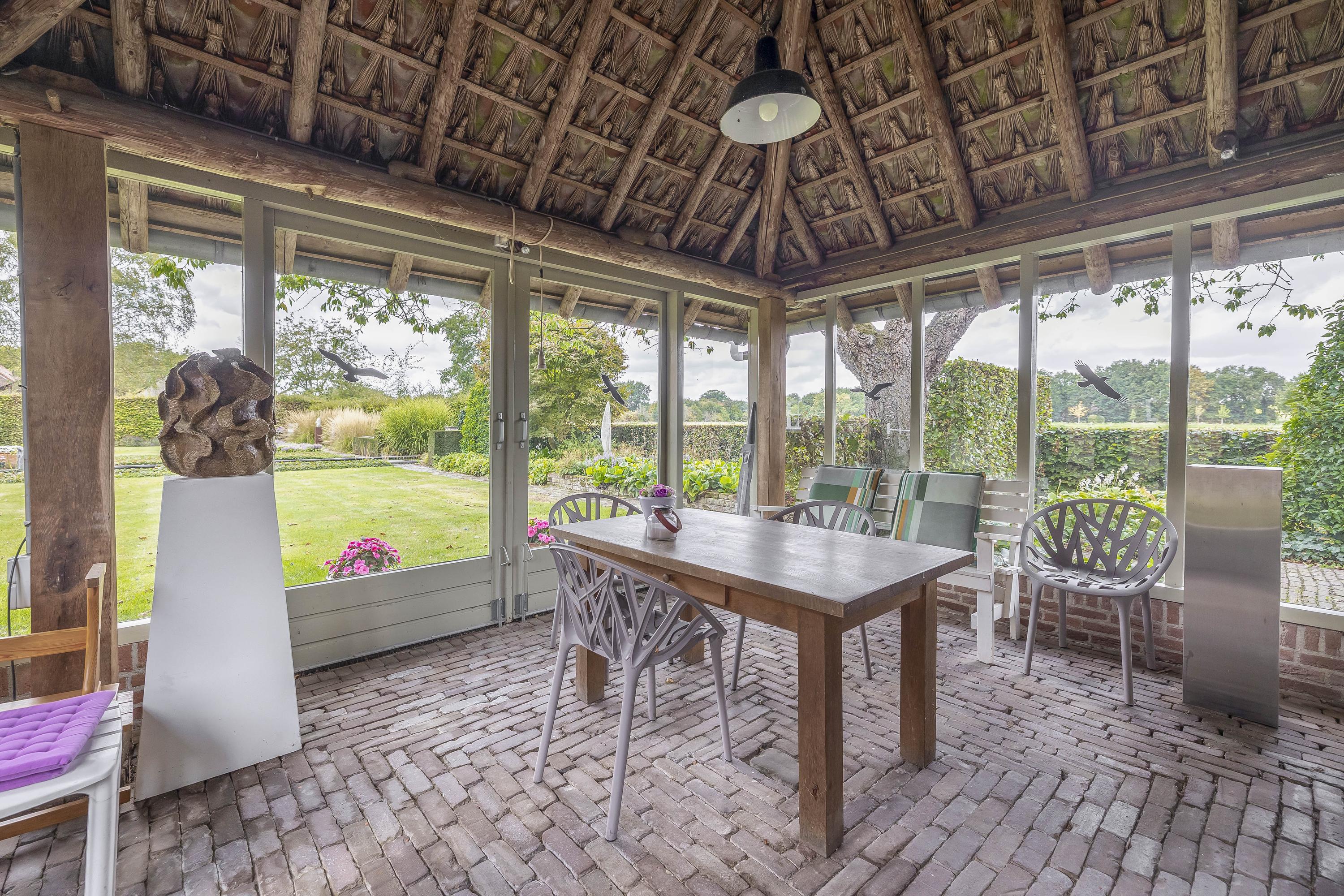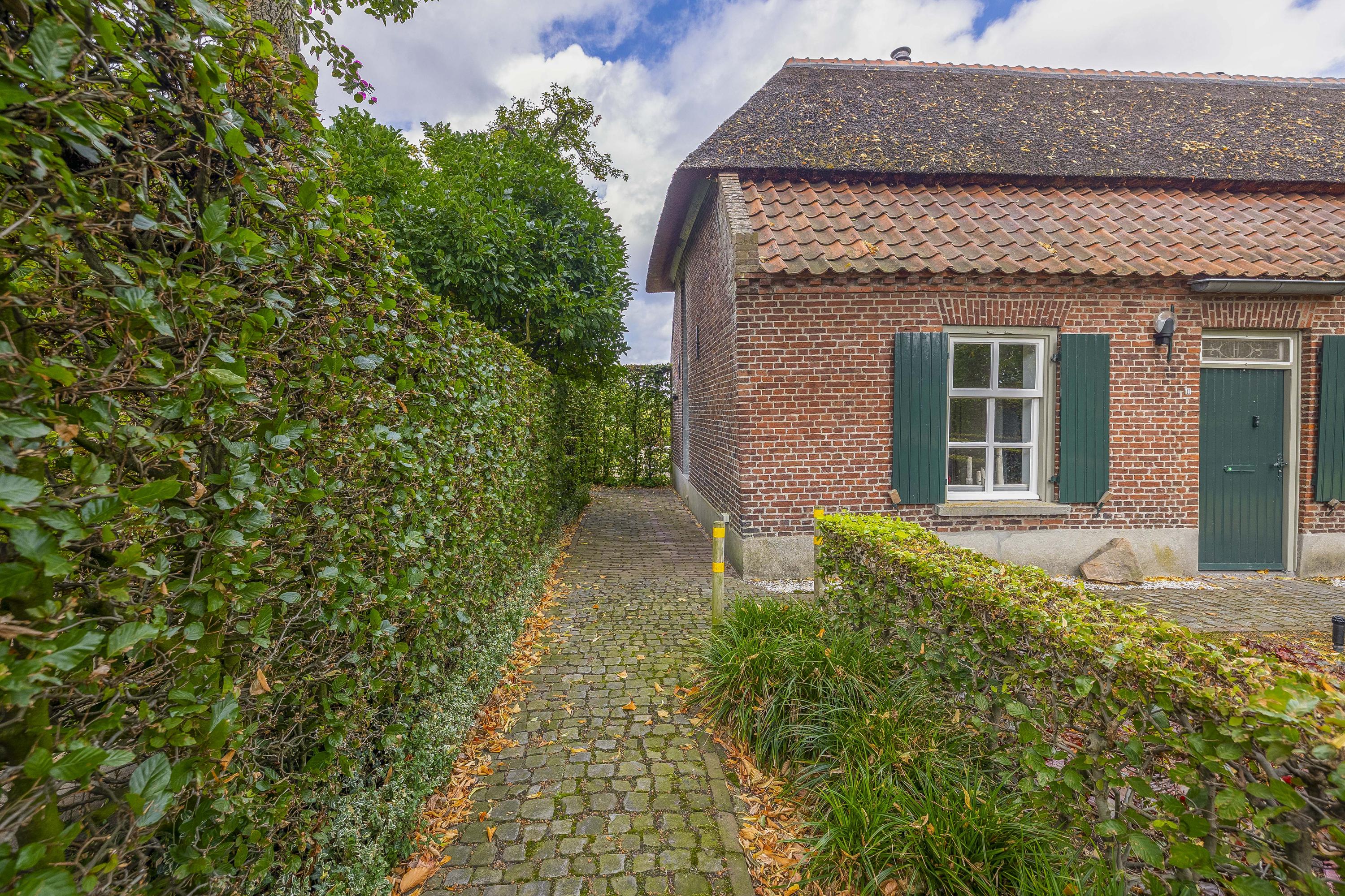 Behind the house and on the sides is a beautifully landscaped garden. On the left side is a nice, spacious area with a lawn, plant borders, old baked clinker paving, and various beech hedges. At the rear, you can enjoy a beautiful view, a large pond (with biological filter), a spacious lawn, plant borders, and mature vegetation. The garden is well laid out and well maintained. There is a double driveway on the right side of the property. The garden even offers the possibility of keeping small animals. There is also a section of the garden with a “lovers' lane.” To the left of the house is a landscaped jeu-de-boules court.