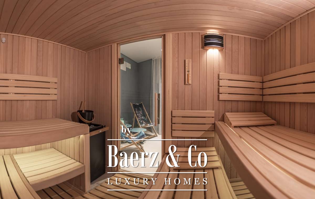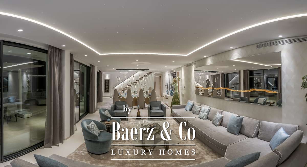 The villa comprises nine bedrooms and eleven bathrooms, each designed with precision for both comfort and privacy. The designer kitchen is equipped with Miele appliances, a walk-in refrigerator, and an advanced osmosis water system, marrying functionality with understated luxury. Smart-home automation, underfloor heating, American fridge, and a dedicated heating pump ensure year-round comfort. The living area, anchored by a sophisticated fireplace, opens toward panoramic views, while a private spa, fitness and yoga room, and cinema offer sanctuary and recreation.