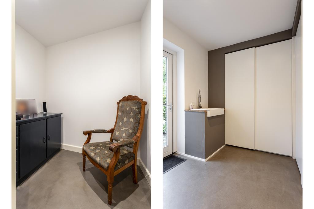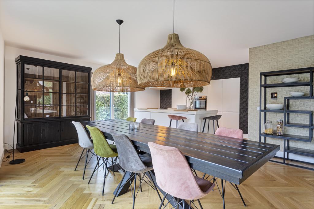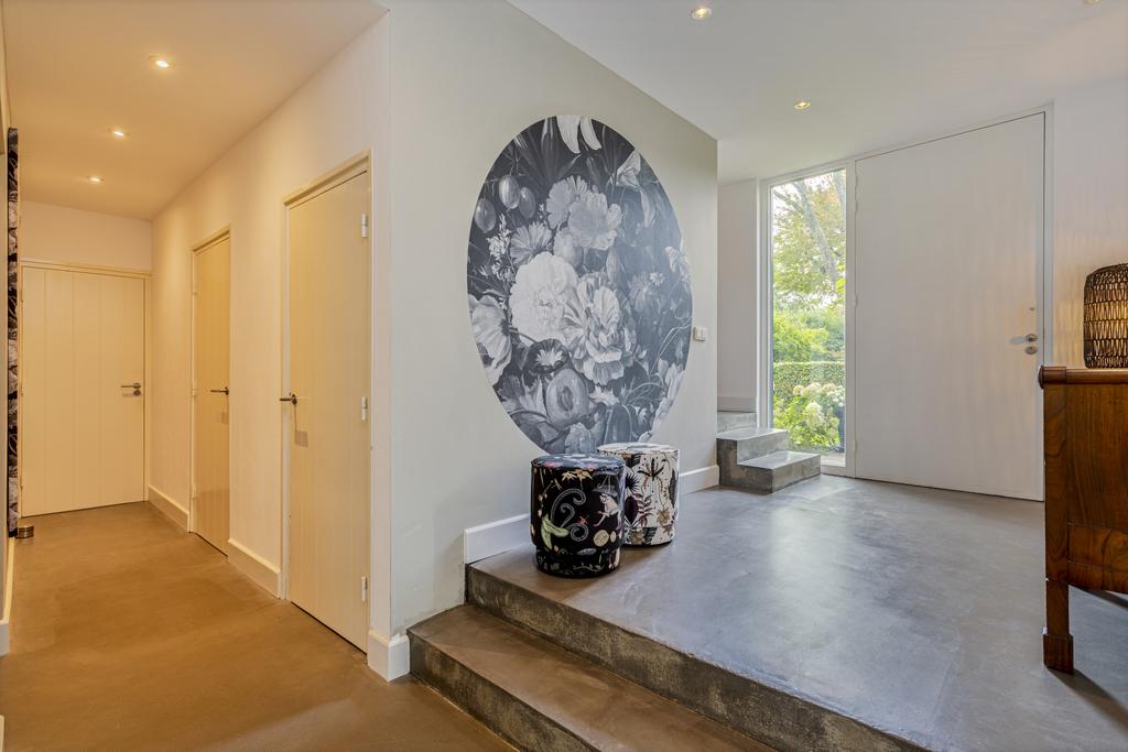 The side and rear gardens are accessible via four large sliding doors. All rooms are finished with either a modern concrete-look floor or a classic wooden herringbone floor. The kitchen is designed around a central island and is fully equipped with all necessary built-in appliances.
