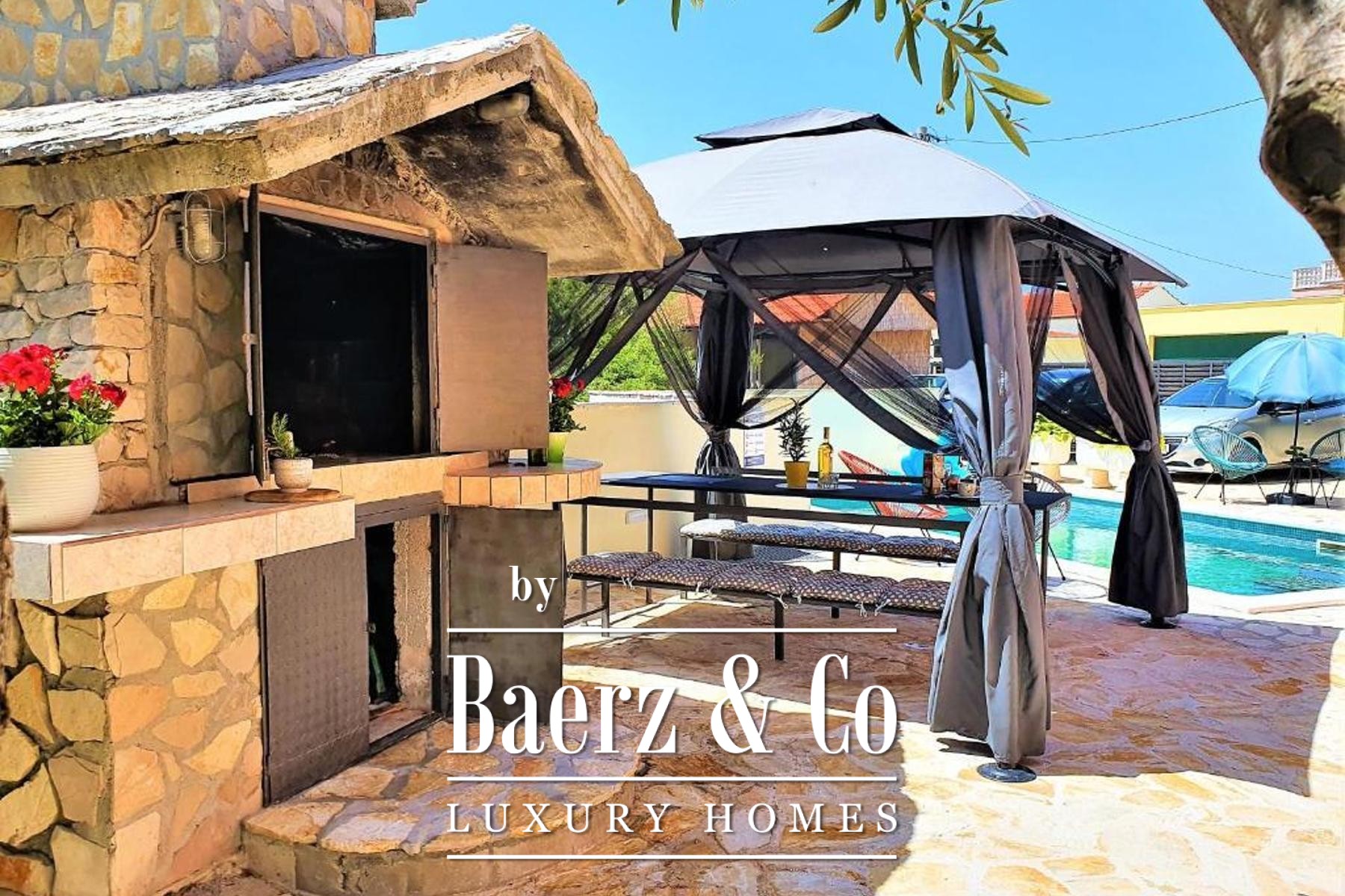 of which has a private bathroom, one separate bathroom, and a living room with kitchen and dining area. The living room opens onto a spacious covered terrace. On the second floor there are two more studio apartments, each of which consists of a living room with kitchen and dining area, a bathroom and a terrace with a sea view.Around the house there is a beautiful garden with a grill, a large swimming pool and a sunbathing area. The house has 6 parking spaces, two of which are covered. The microlocation of the house is excellent, in a very quiet place, yet only 500 meters from the sea.All other information on request.